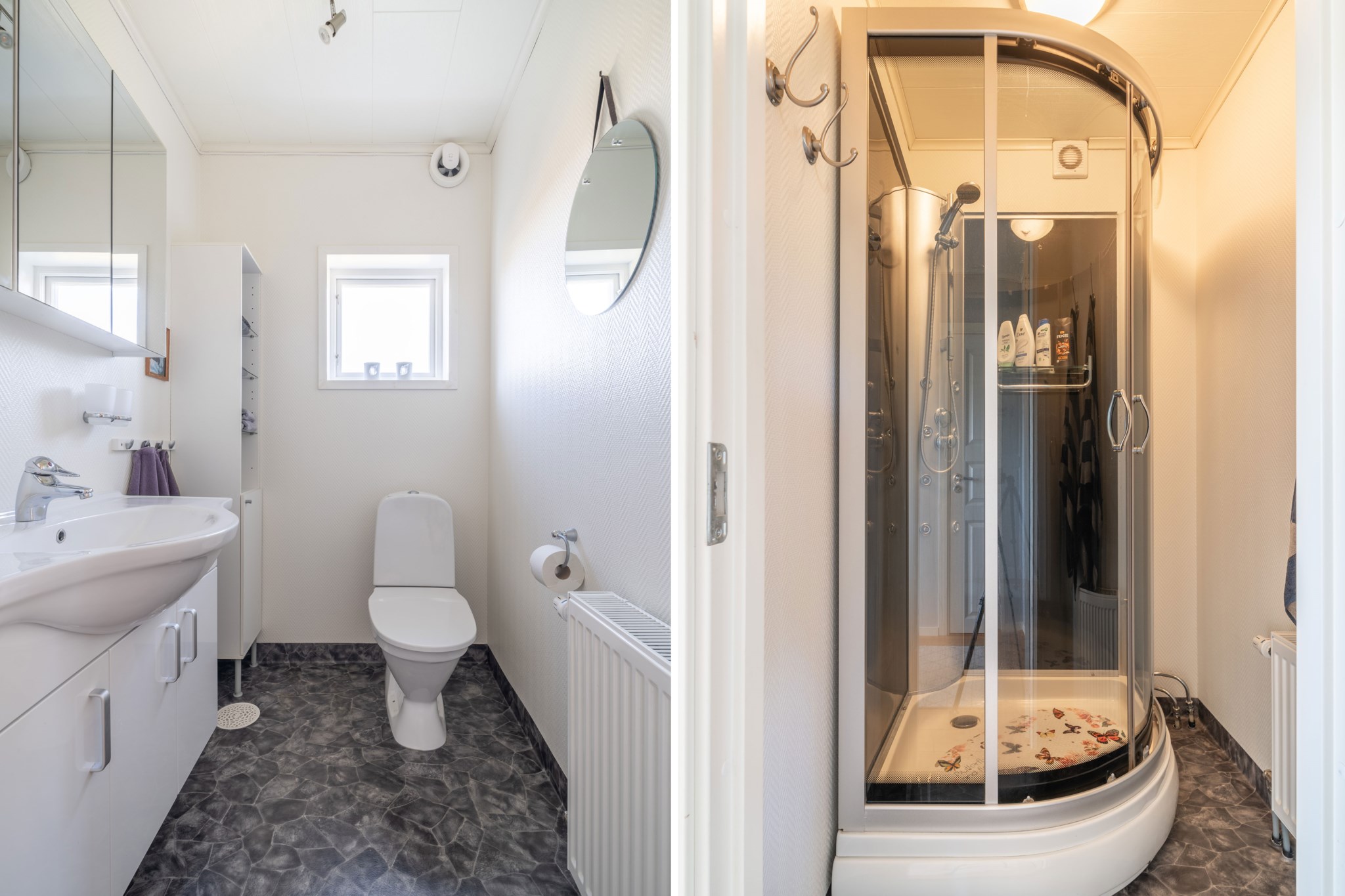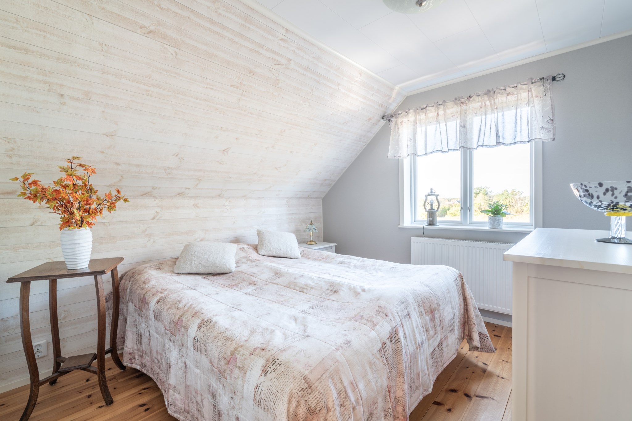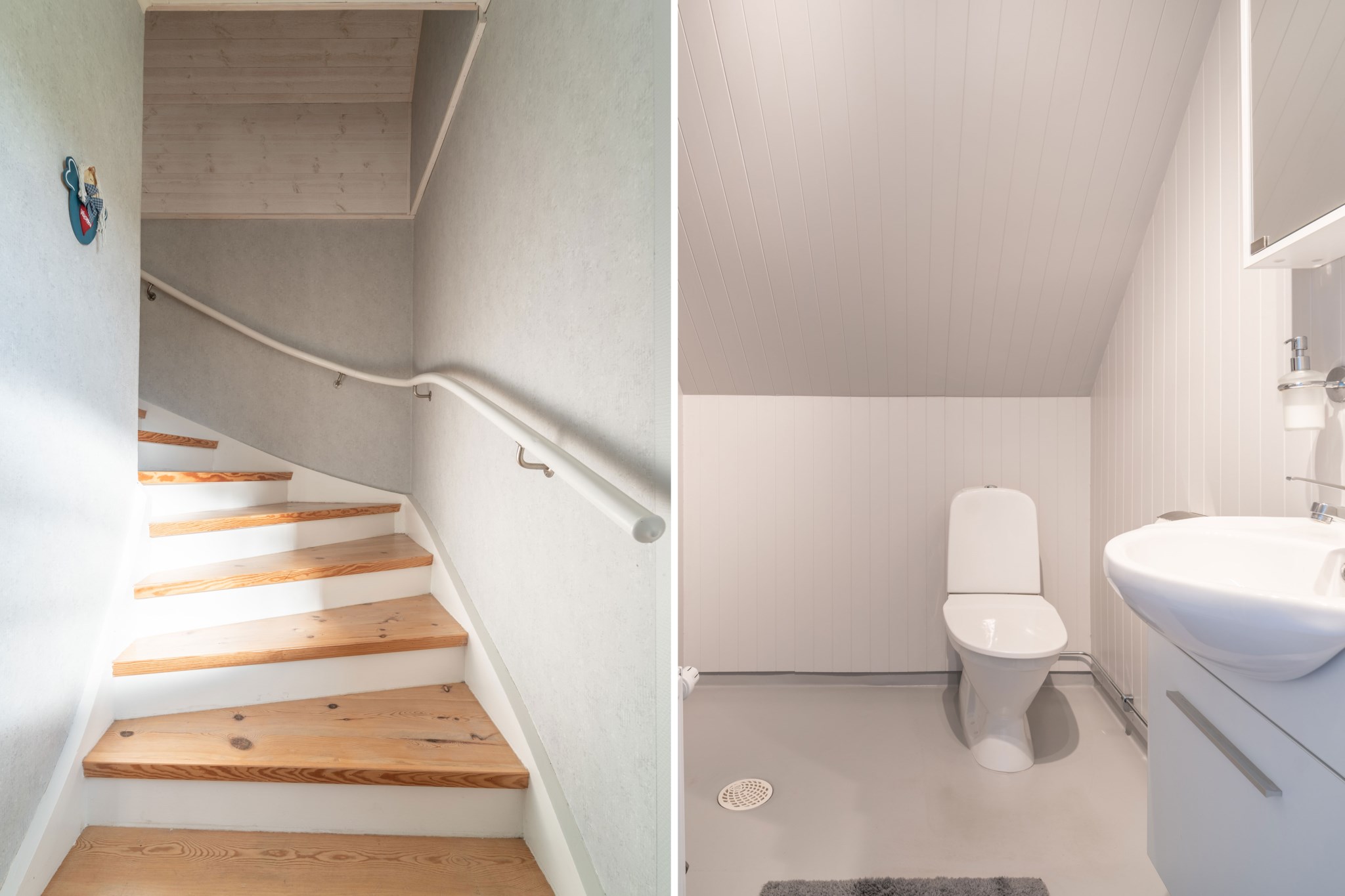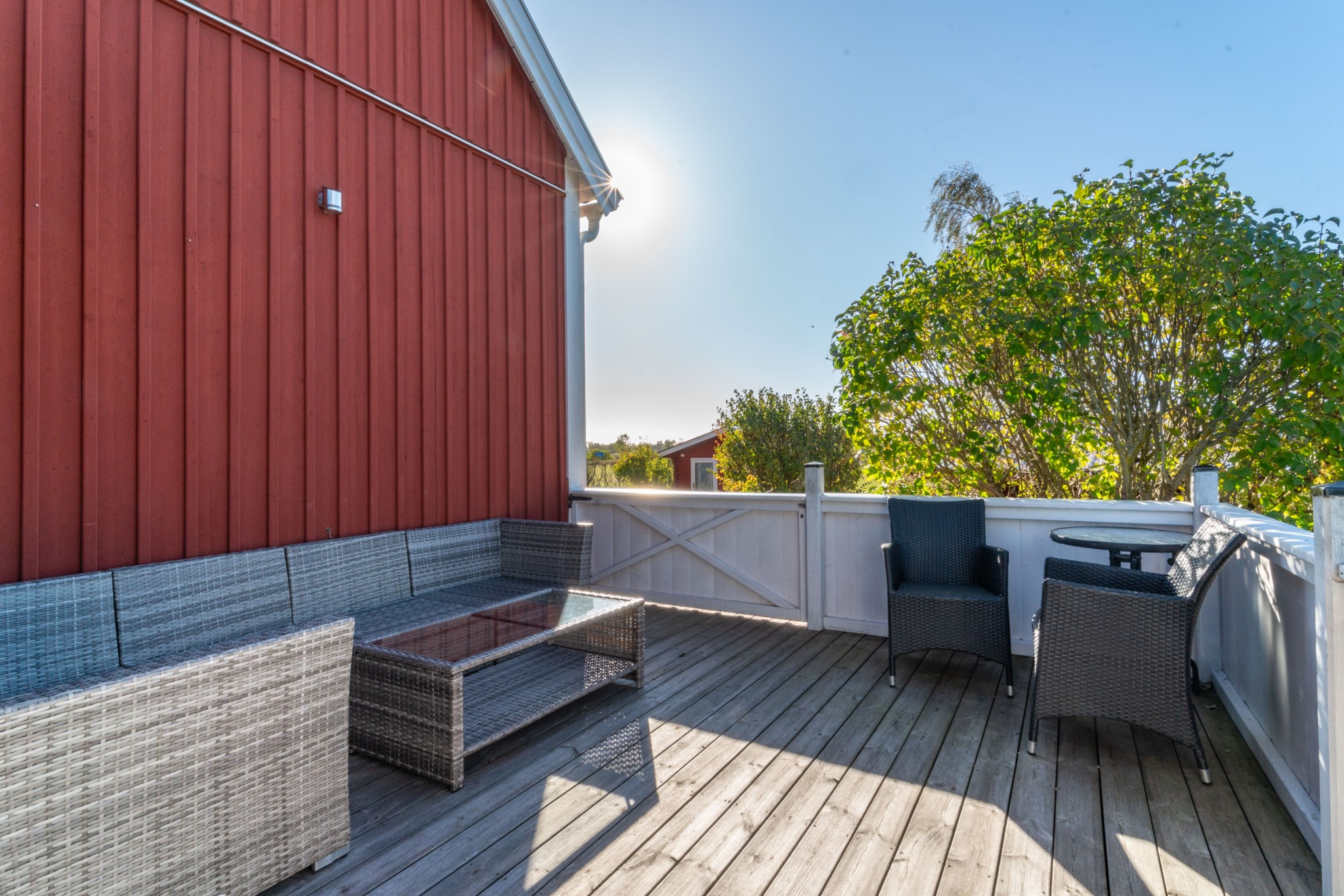 Bostaden fördelas över tre plan. I källaren finns allt det praktiska: tvättstuga, matkällare, maskinrum/ hobbyrum och gott om förvaring. På entréplanet möts du av generösa sällskapsytor, ett renoverat kök med vedspis, vardagsrum med utgång till uterum och altan i härligt västerläge – perfekt för eftermiddagskaffe och kvällssol. Här finns även ett sovrum med klädkammare samt både badrum och duschrum. På övervåningen väntar tre trivsamma sovrum, ytterligare klädkammare, toalett och en balkong med havsutsikt – en underbar plats att börja dagen på.