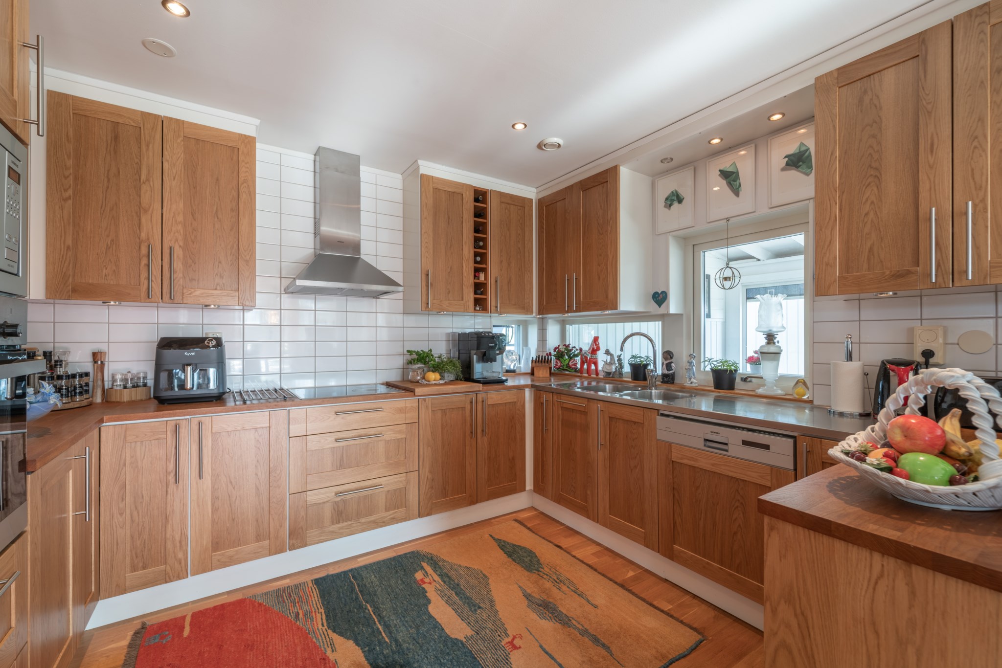 Materialvalen är genomgående av hög standard – ekparkett, vitmålade ytor, stilrent Kvänumkök, golvvärme, centraldammsugare, larm och påkostade badrum med kakel och klinker.