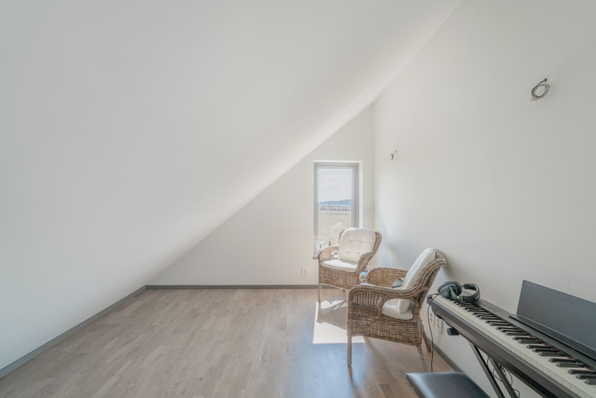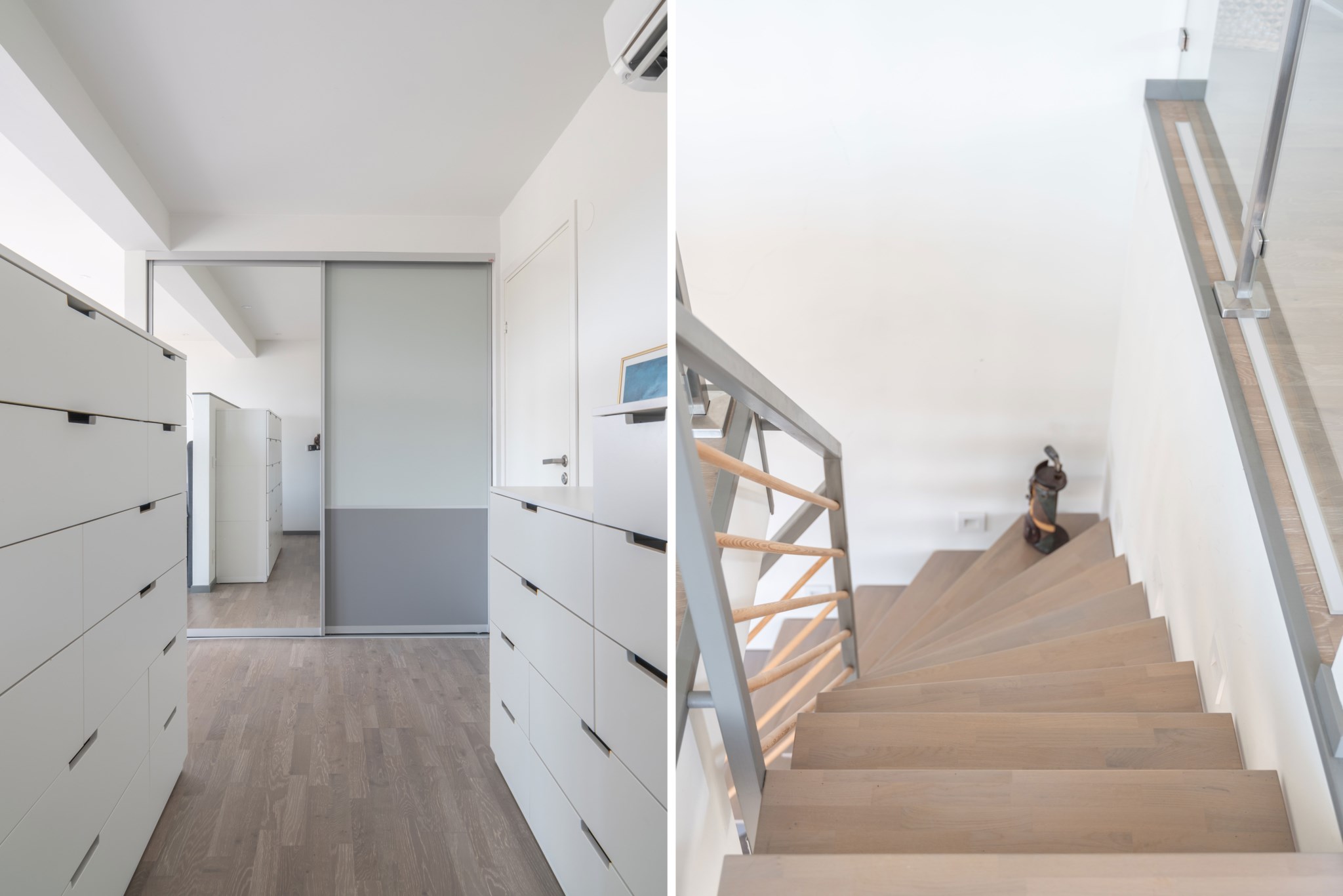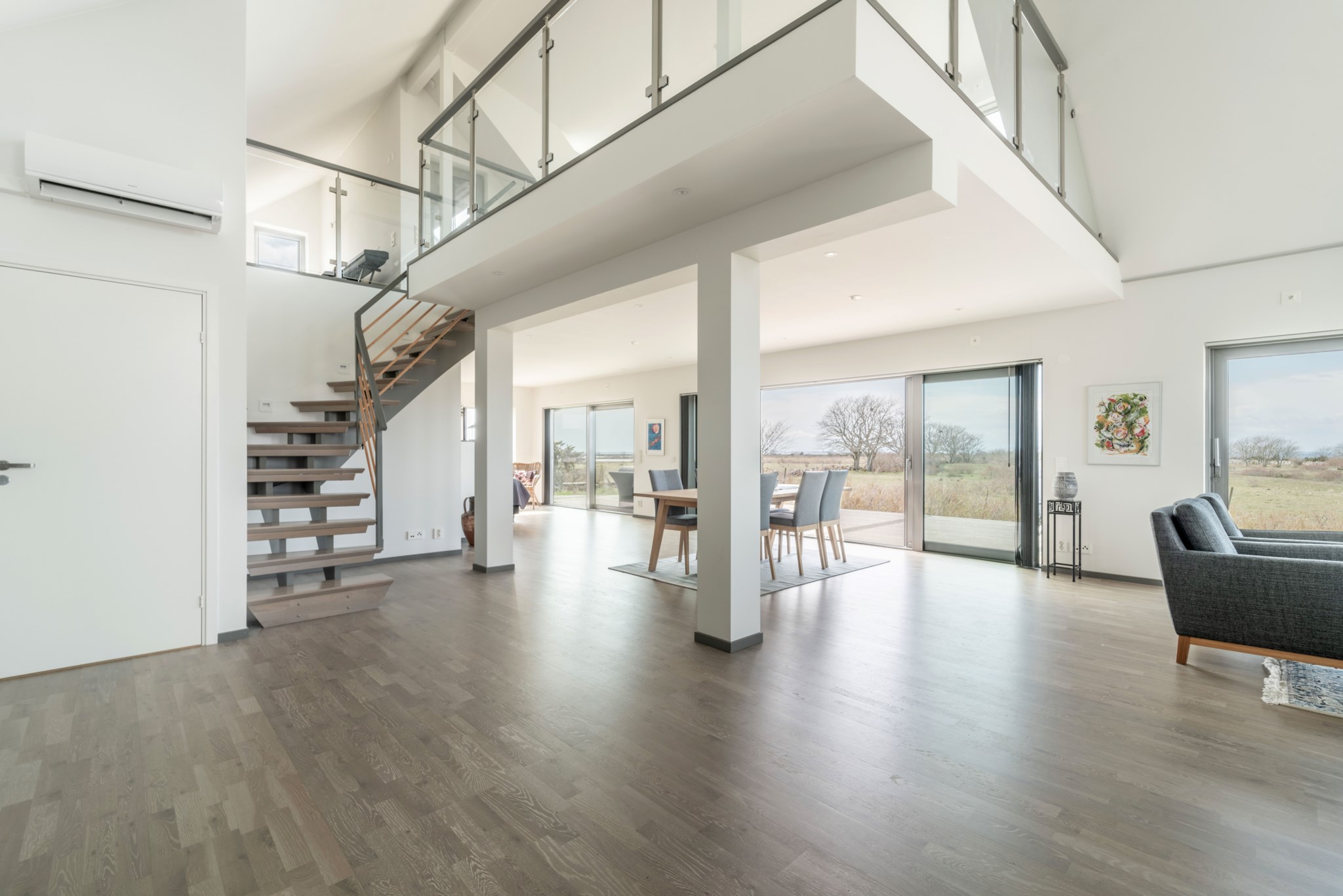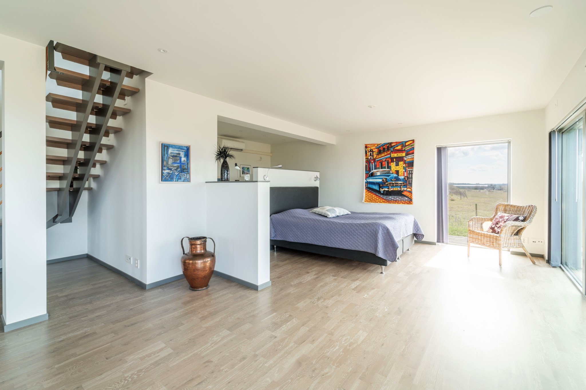 Övre plan bjuder på en luftig känsla med glasräcke mot vardagsrummet, en privat balkong samt en elegant arbetsyta som enkelt kan omvandlas till ytterligare sovrum.