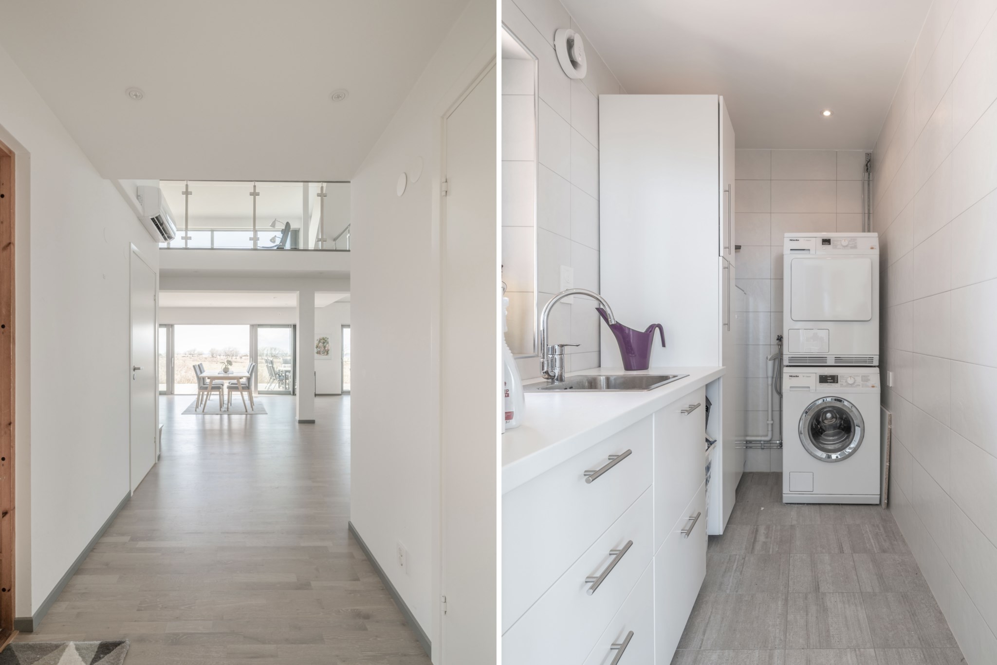 Master bedroom är en privat oas med integrerat badrum och generös förvaring, utformat med fokus på både komfort och estetik. Entréplanet erbjuder även tvättstuga, ytterligare ett stilrent badrum samt ett flexibelt rum – perfekt som gästrum eller exklusivt hemmakontor.