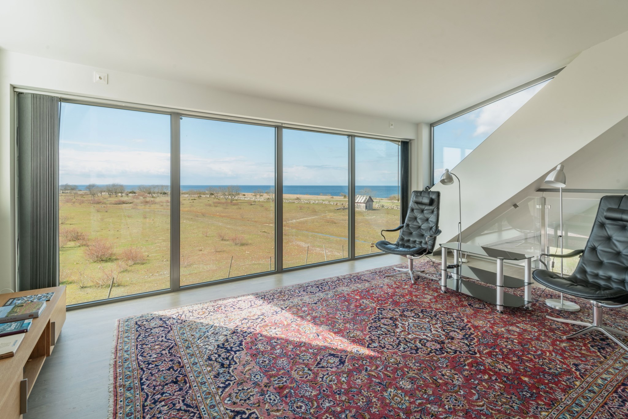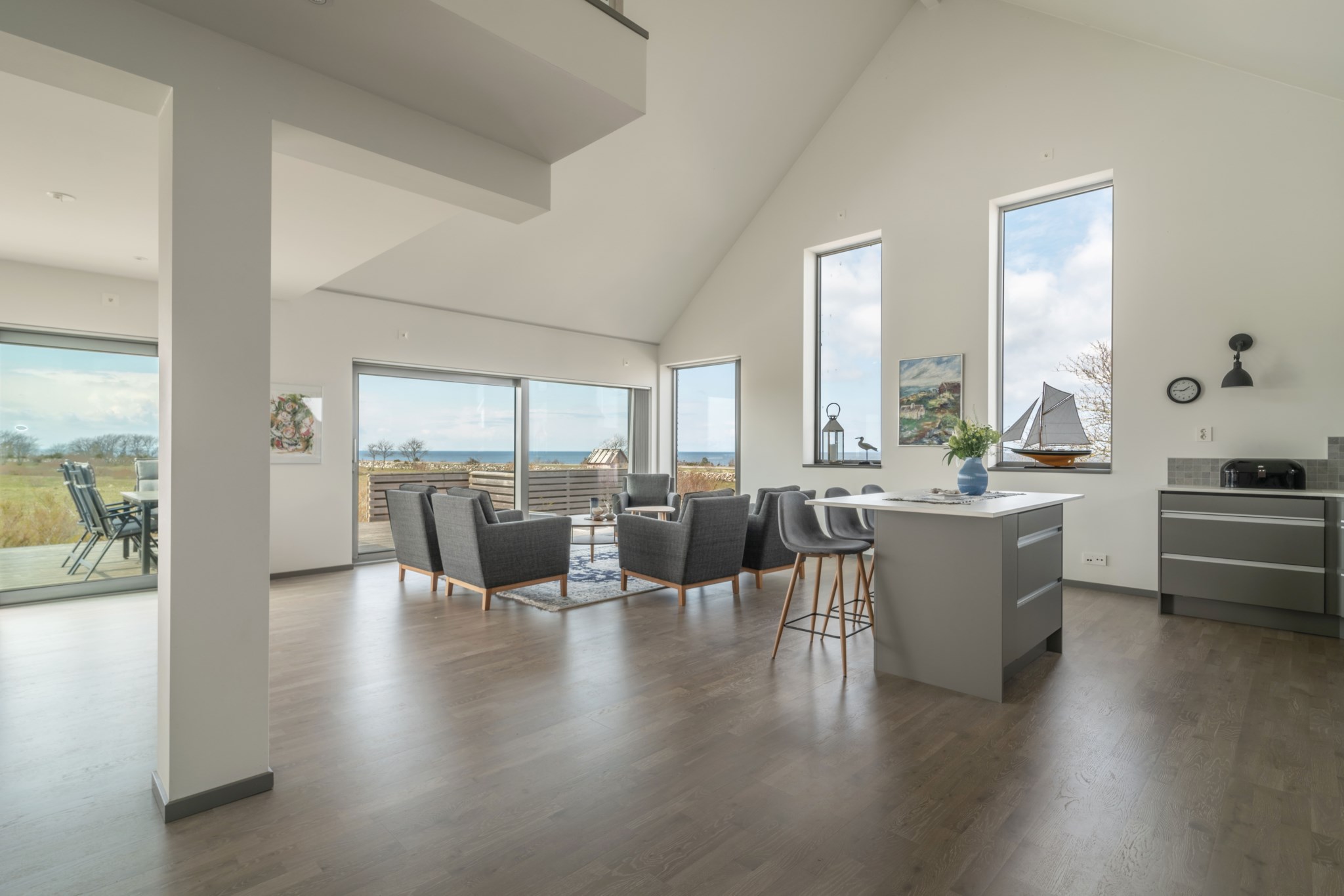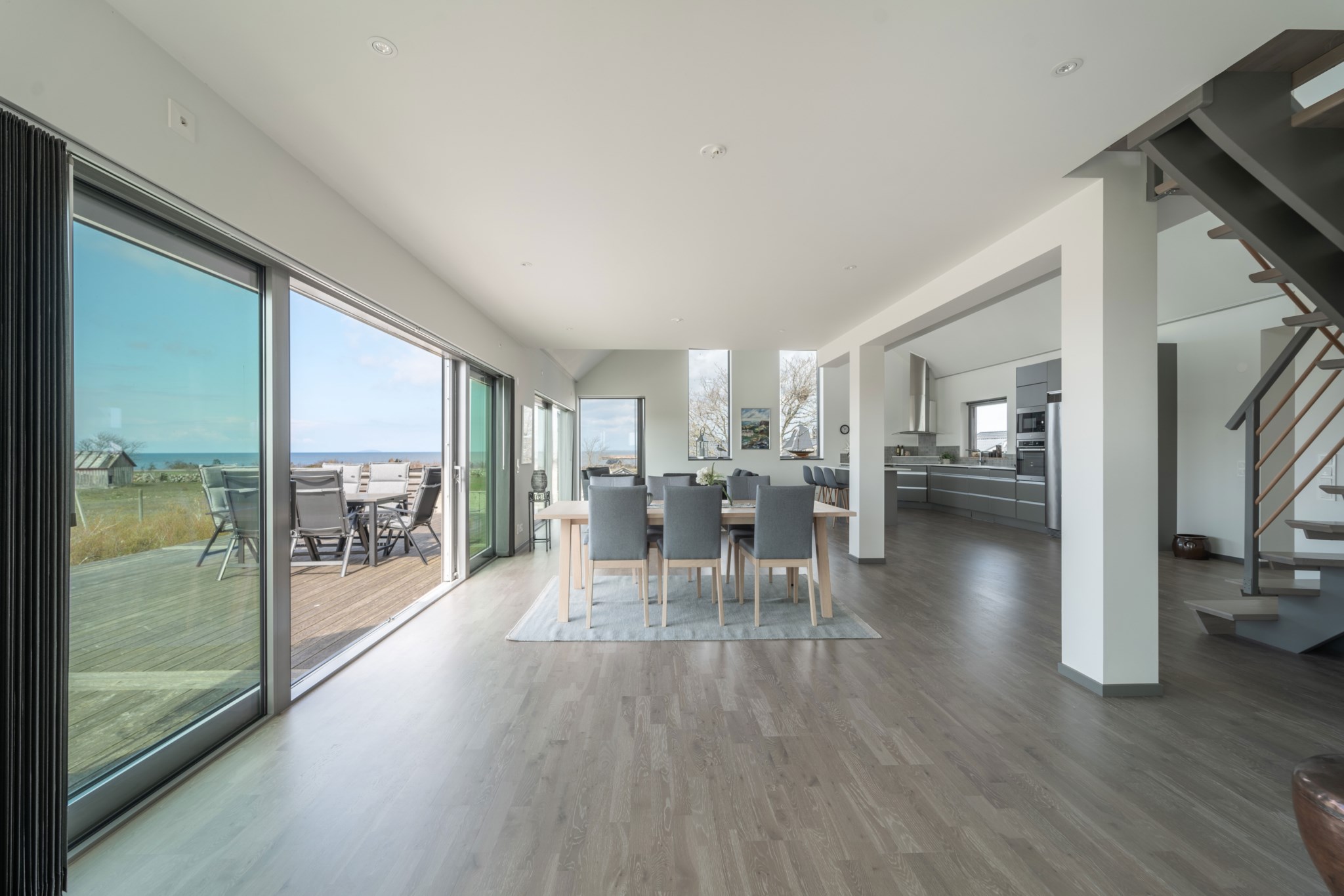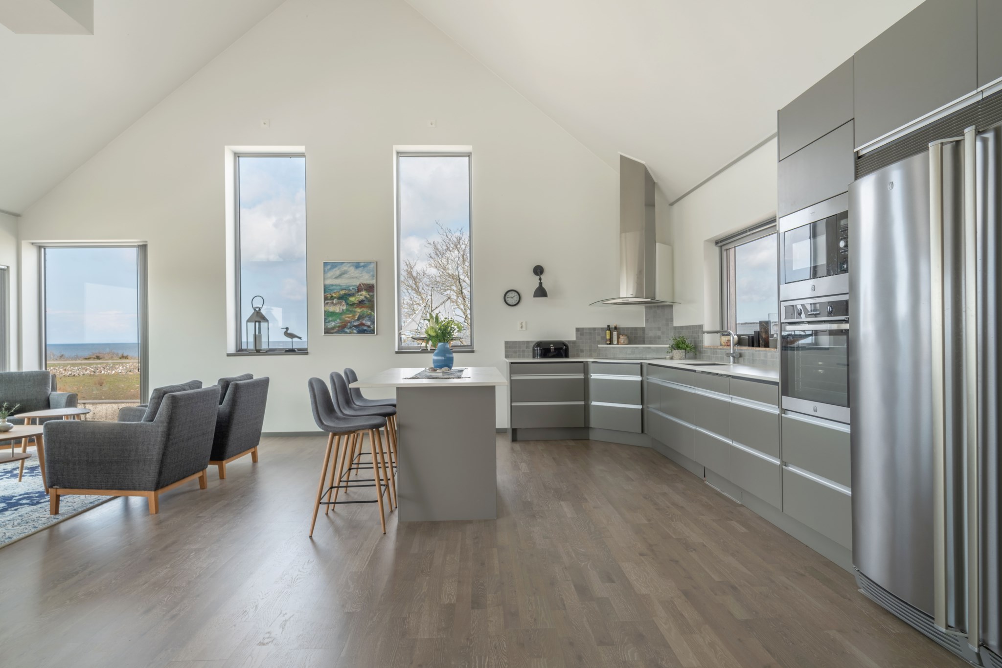 Interiören präglas av ljus, rymd och elegans. Den öppna planlösningen mellan kök och sällskapsdel skapar en social och inbjudande miljö, förstärkt av imponerande takhöjd upp i nock. De stora skjutbara glaspartierna öppnar upp mot omgivningen och skapar en sömlös övergång till utemiljön och den storslagna utsikten över Kalmarsund.