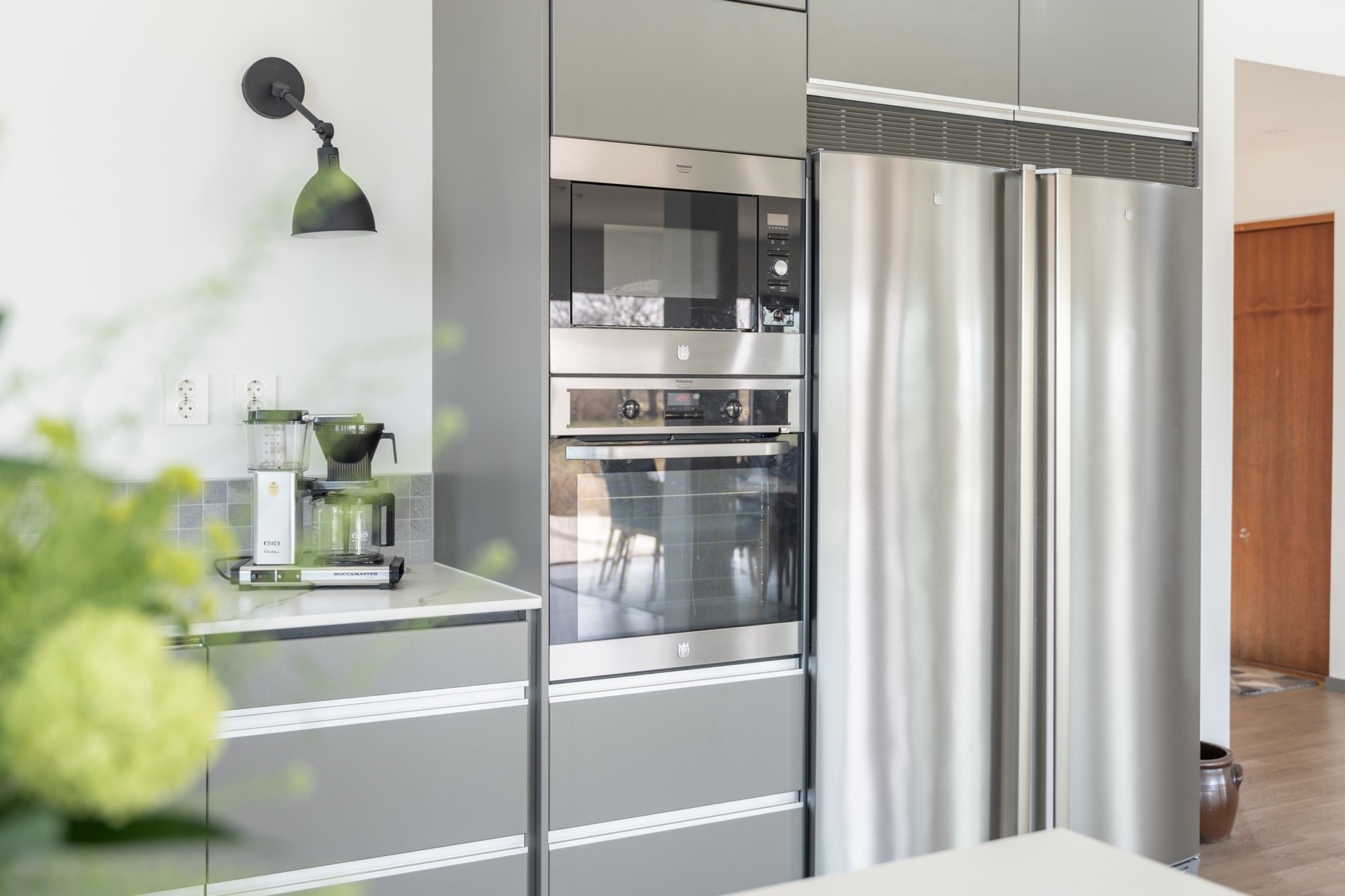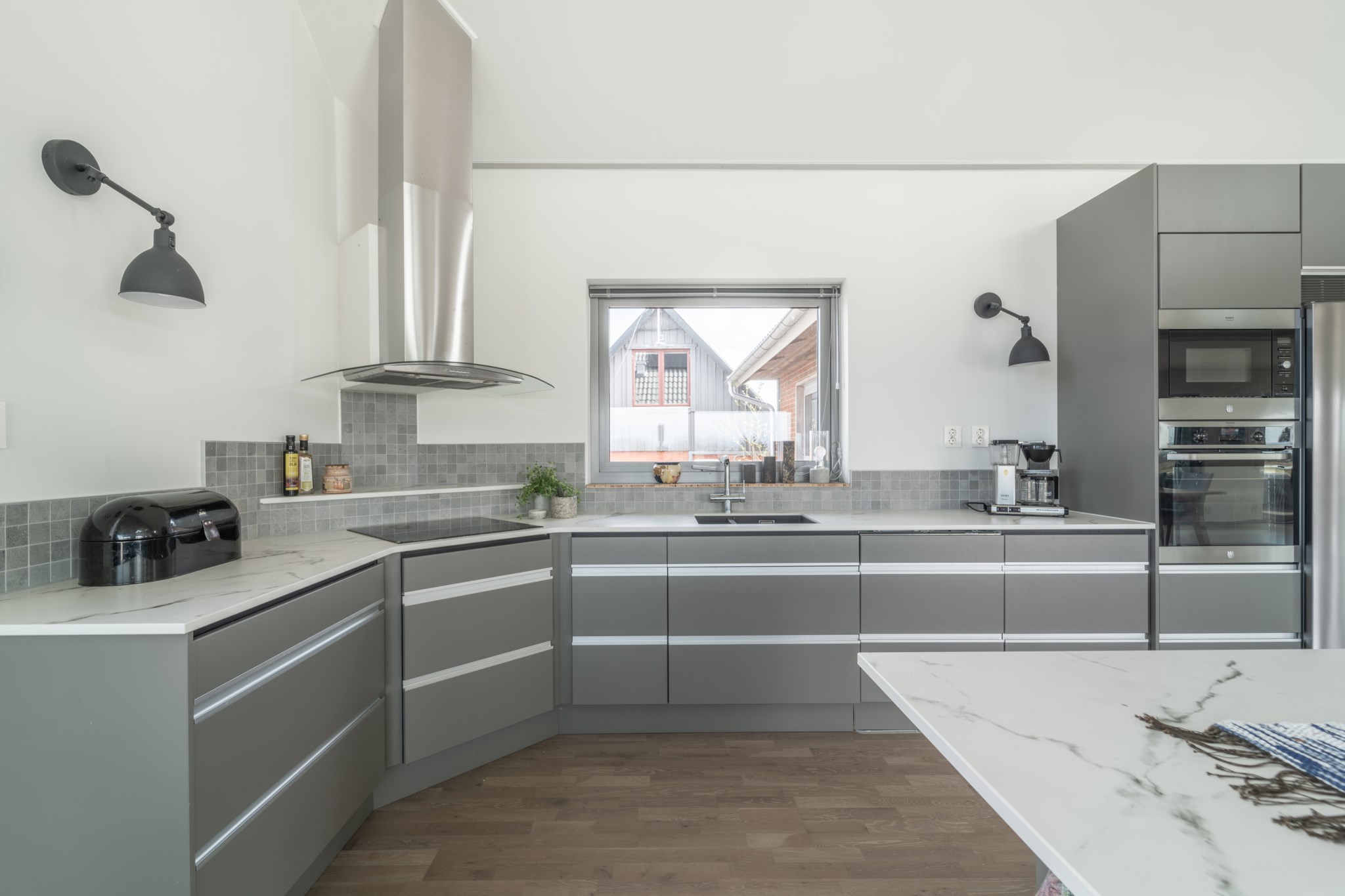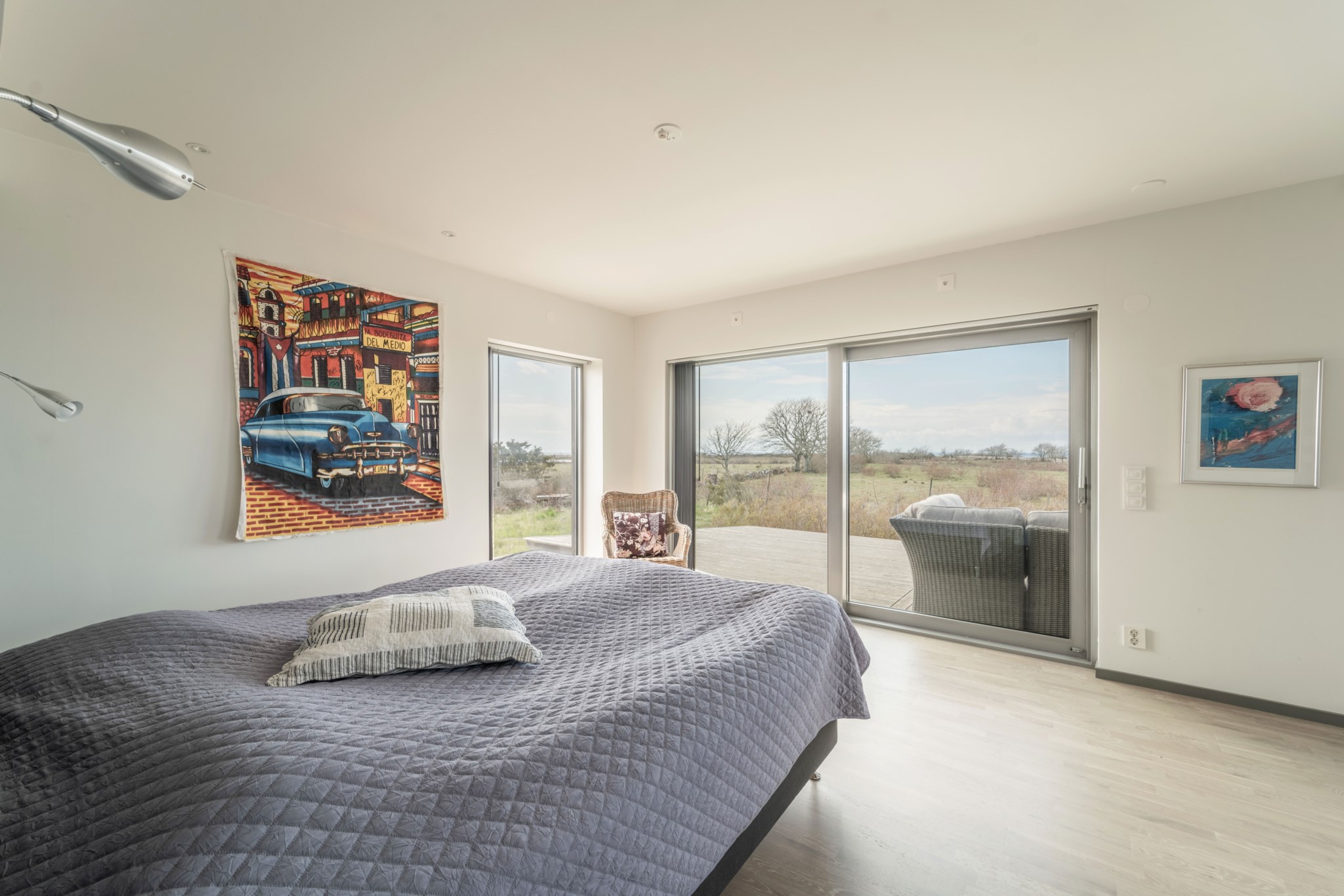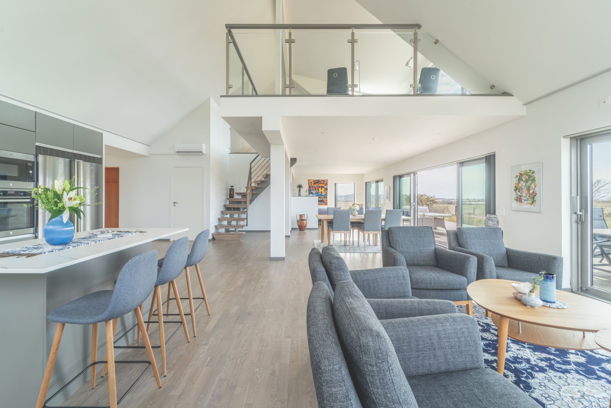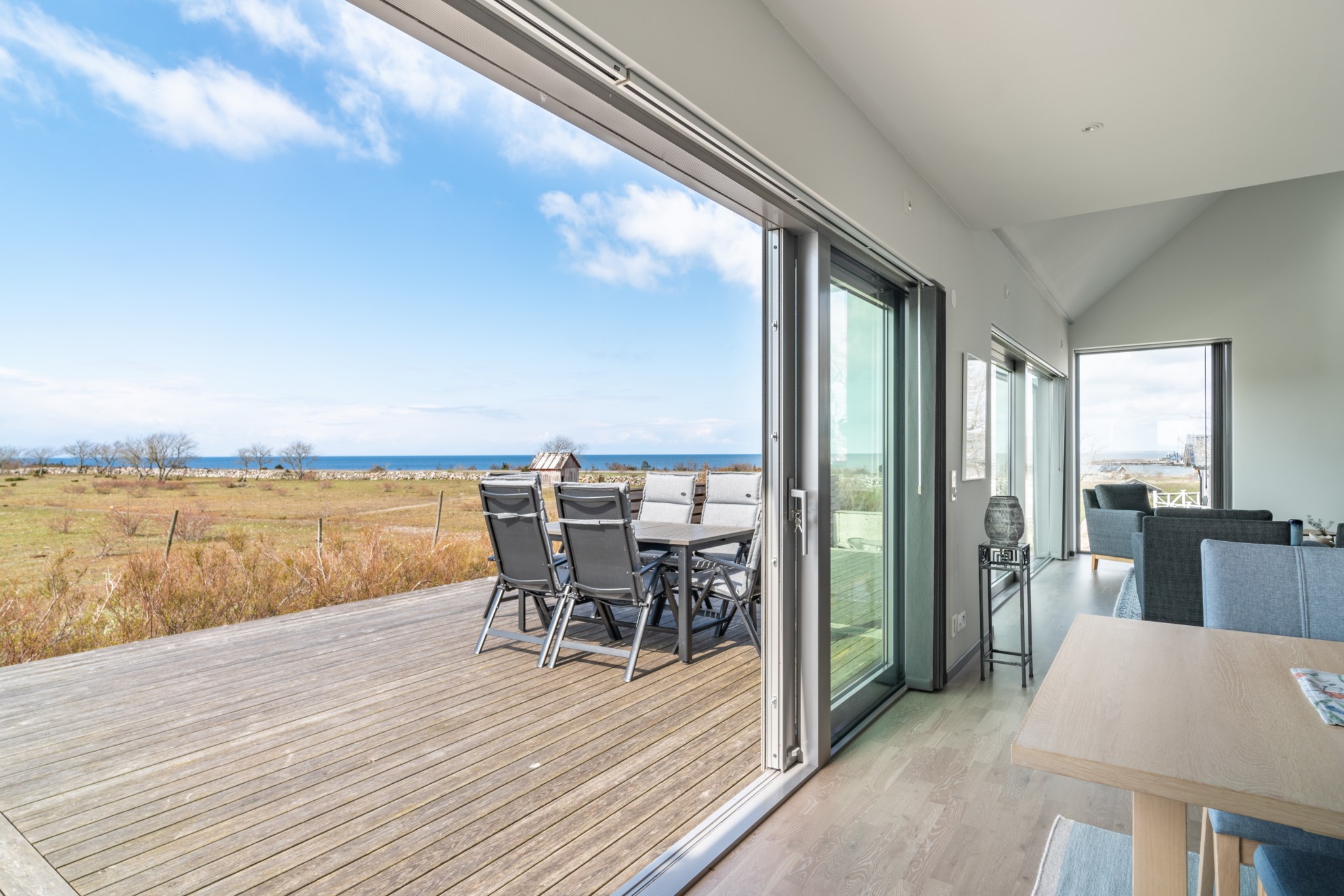 Interiören präglas av ljus, rymd och elegans. Den öppna planlösningen mellan kök och sällskapsdel skapar en social och inbjudande miljö, förstärkt av imponerande takhöjd upp i nock. De stora skjutbara glaspartierna öppnar upp mot omgivningen och skapar en sömlös övergång till utemiljön och den storslagna utsikten över Kalmarsund.