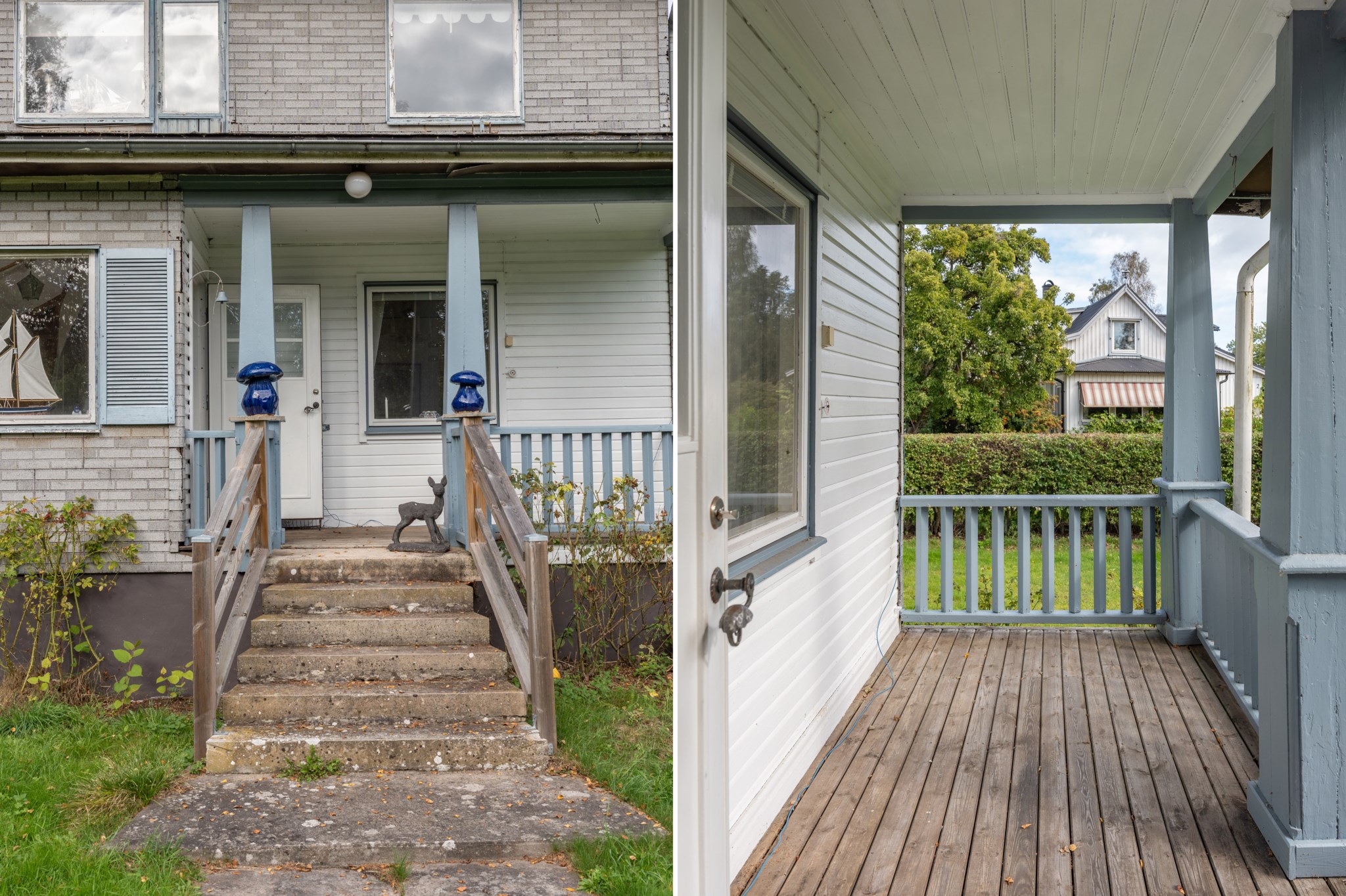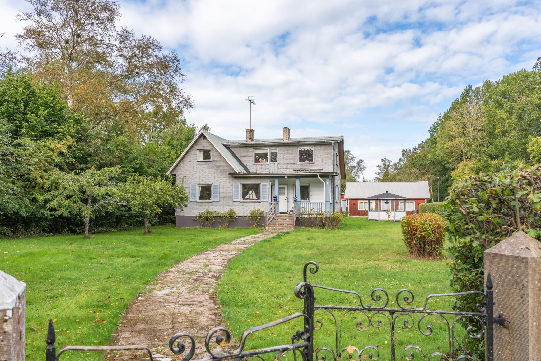 Fastigheten välkomnar via en fin smidesgrind som leder in över en stengång och vidare fram till verandan – en inbjudande entré som sätter tonen direkt.