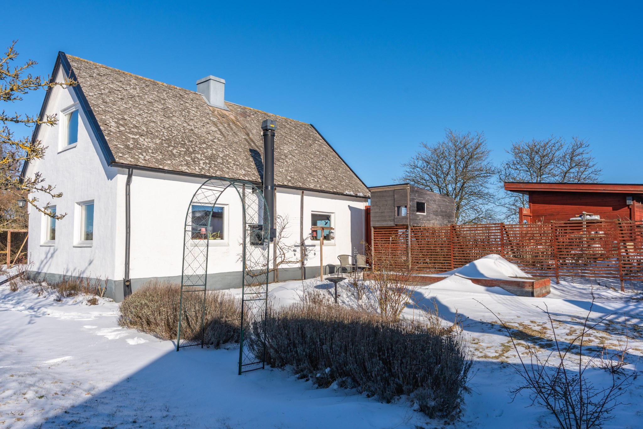 Utemiljön är lika charmig som huset – stenmur som ramar in fastigheten, syrénhäck, rosor, fruktträd samt odlingsmöjligheter. Dessutom finns ett gästhus med fyra sovplatser. Även cykelförråd nås utifrån.