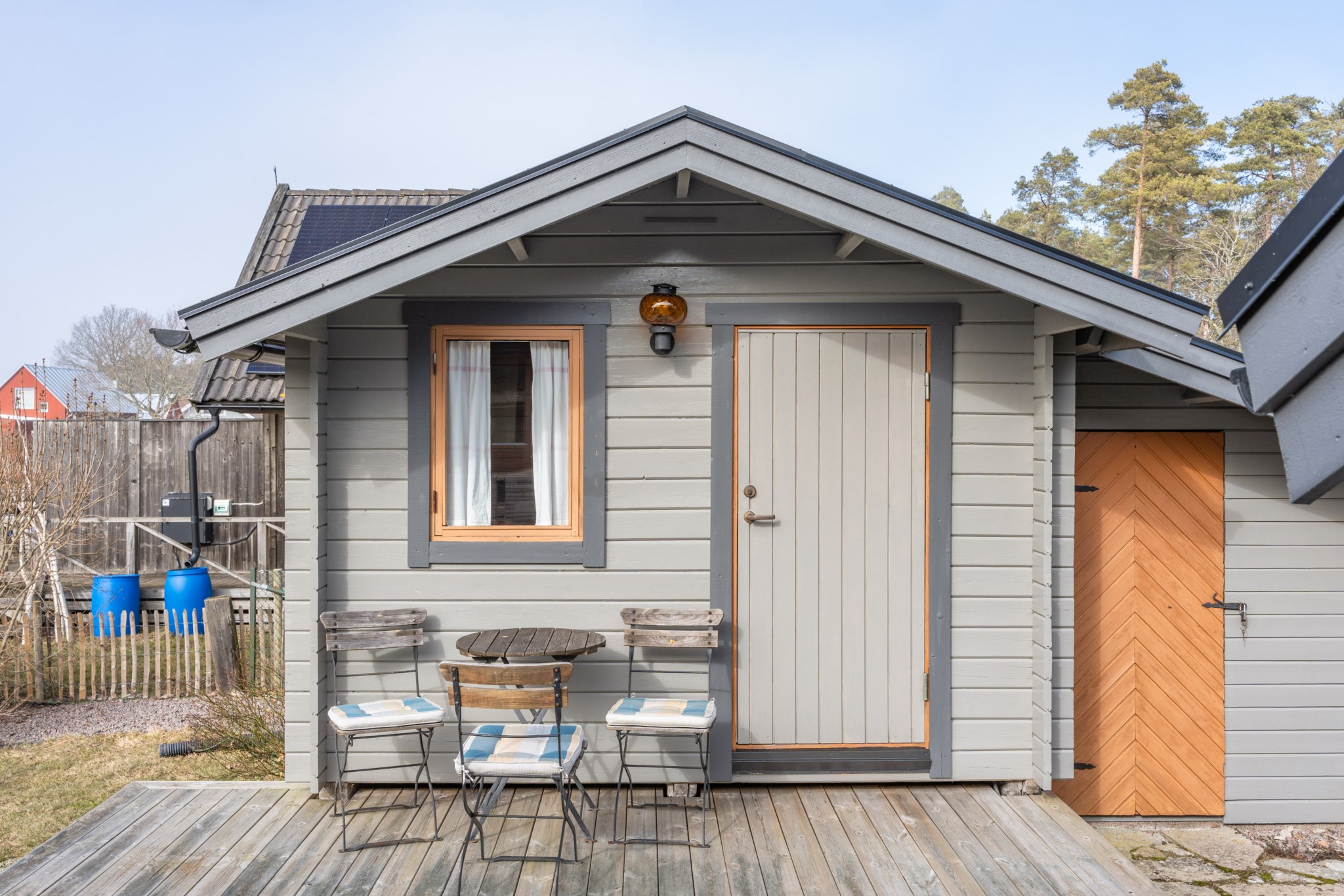 Trädgården är omgärdad av staket och erbjuder rabatter, gräsmatta samt stenläggningar.