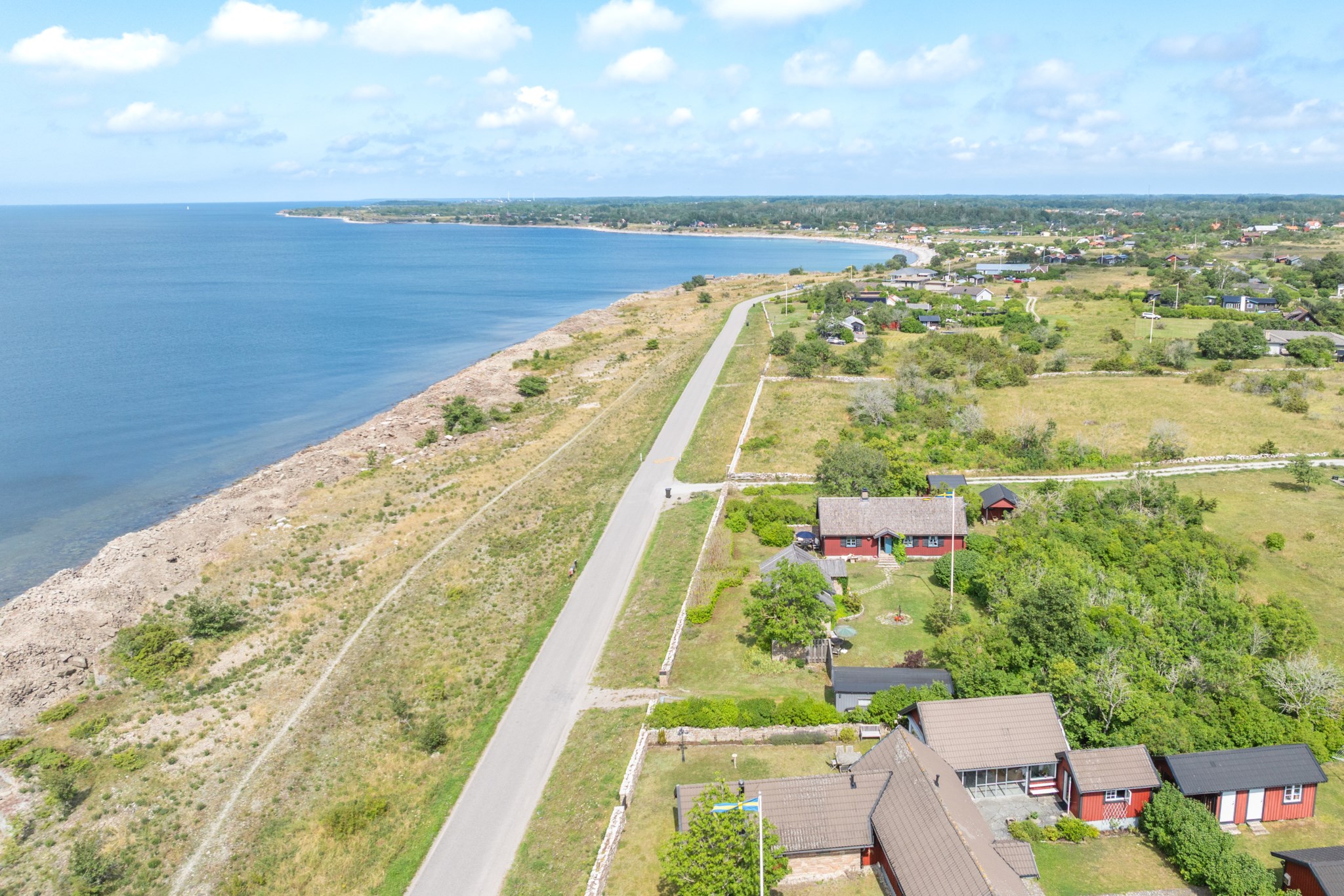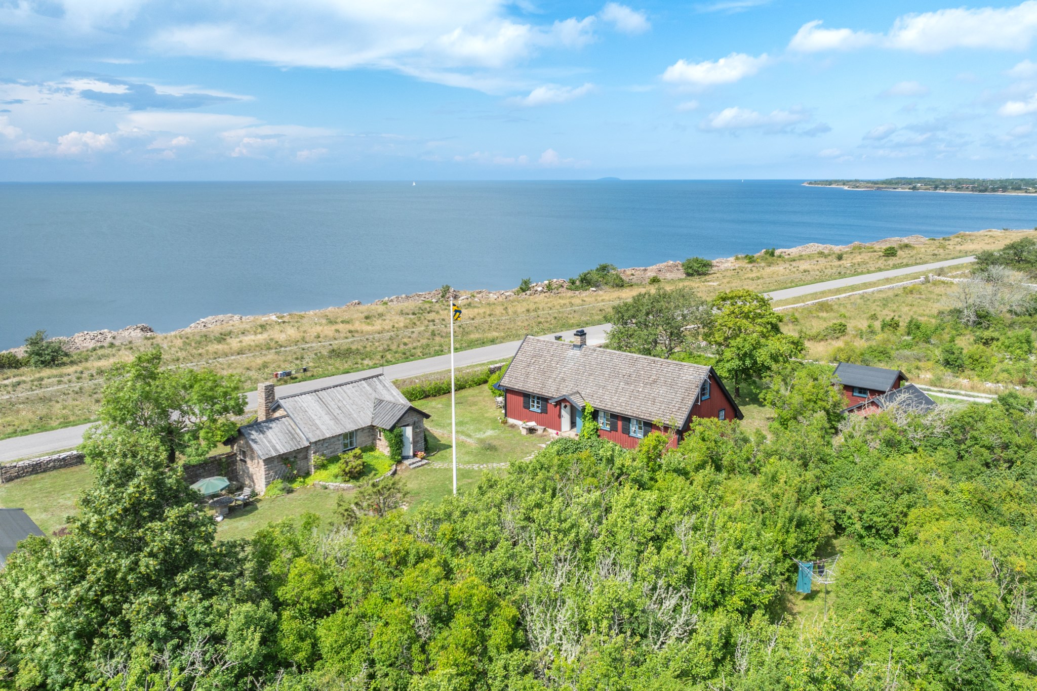 Fastigheten ligger något förhöjt från kustvägen, vilket ger både en fantastisk utsikt och en naturlig avskildhet. Den vackra stenmuren tillsammans med en väldoftande syrenhäck ramar in tomten och skapar ett skyddat och harmoniskt gårdsrum, där havsutsikten fortfarande får spela huvudrollen. Den generösa tomten om cirka 3 200 kvm ger gott om plats för både lugn och gemenskap, och för den som blickar framåt finns dessutom ett positivt besked från kommunen gällande möjligheten att stycka av ytterligare en tomt.