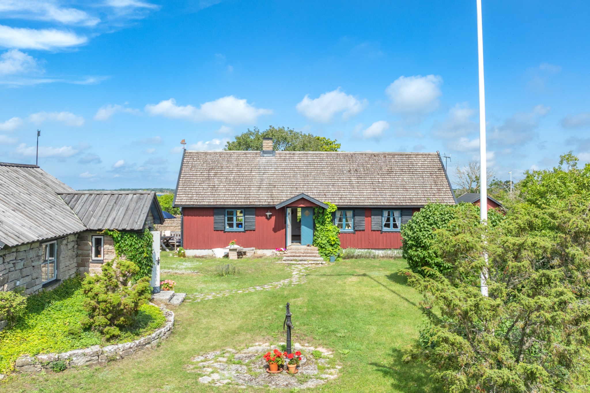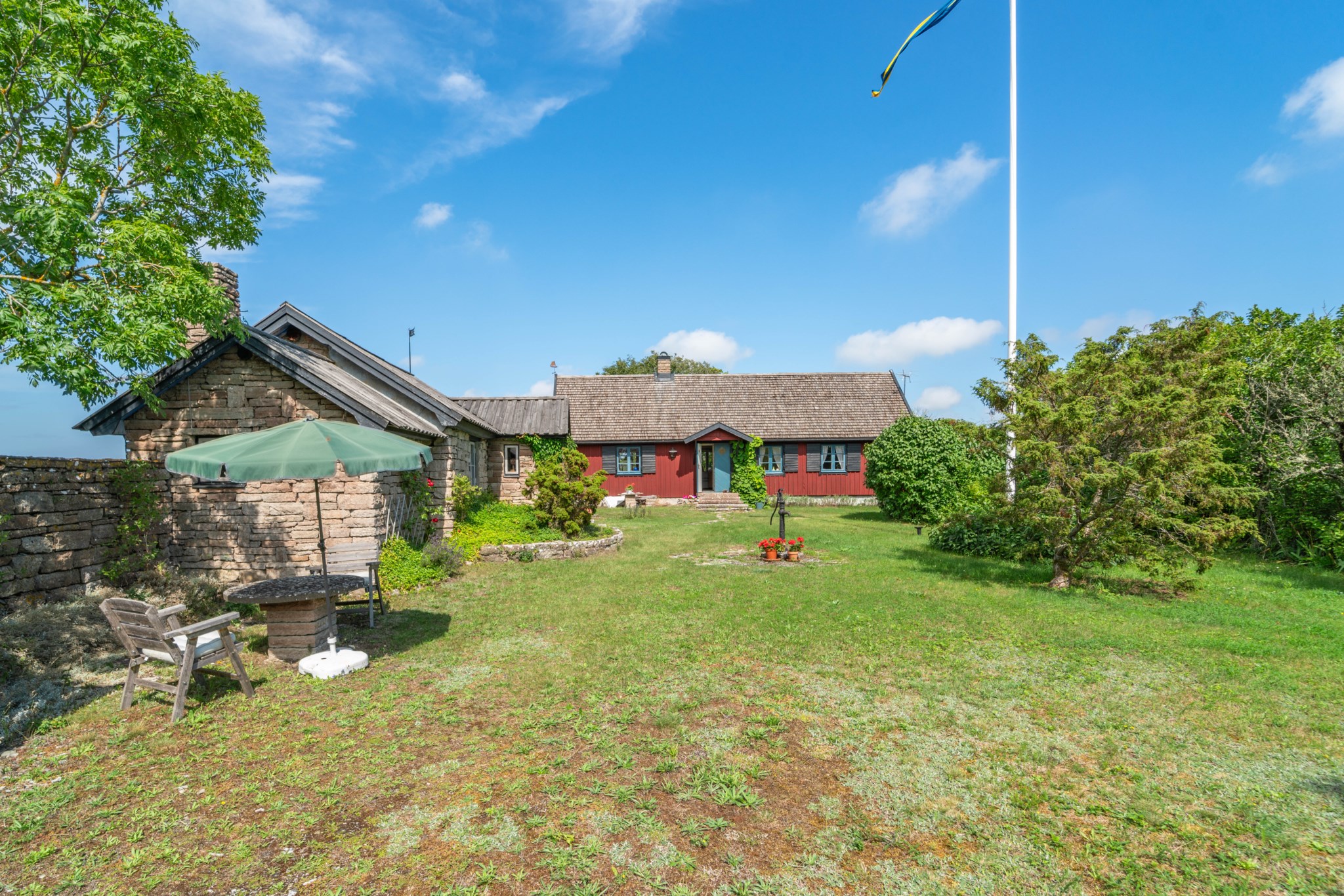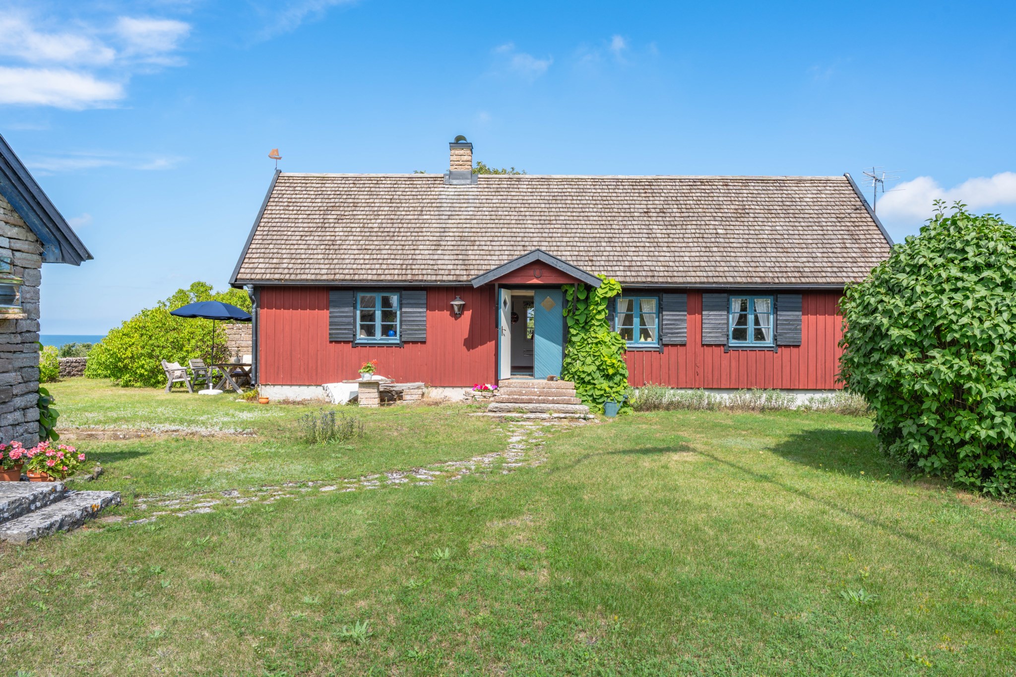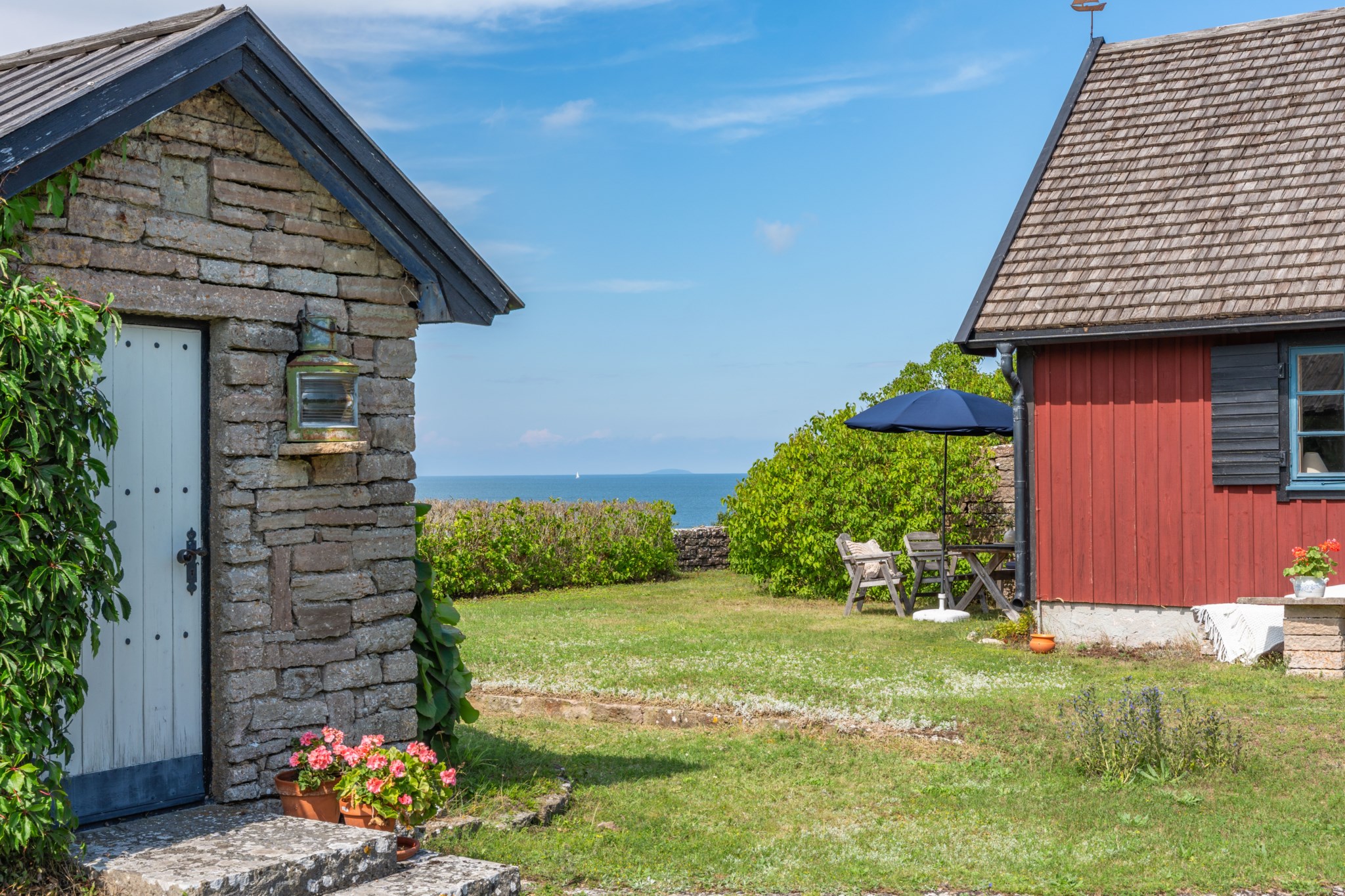 Mellan bostadshuset och stenhuset breder en skyddad innergård ut sig där syrenernas doft blandas med havsluften. Under vår och sommar fylls trädgården av allt från krokus till blåeld och blomning till fåglarnas sång. Här finns alltid en plats i lä – för morgonkaffet, för en stund i solen eller för långa kvällar tillsammans med familj och vänner.