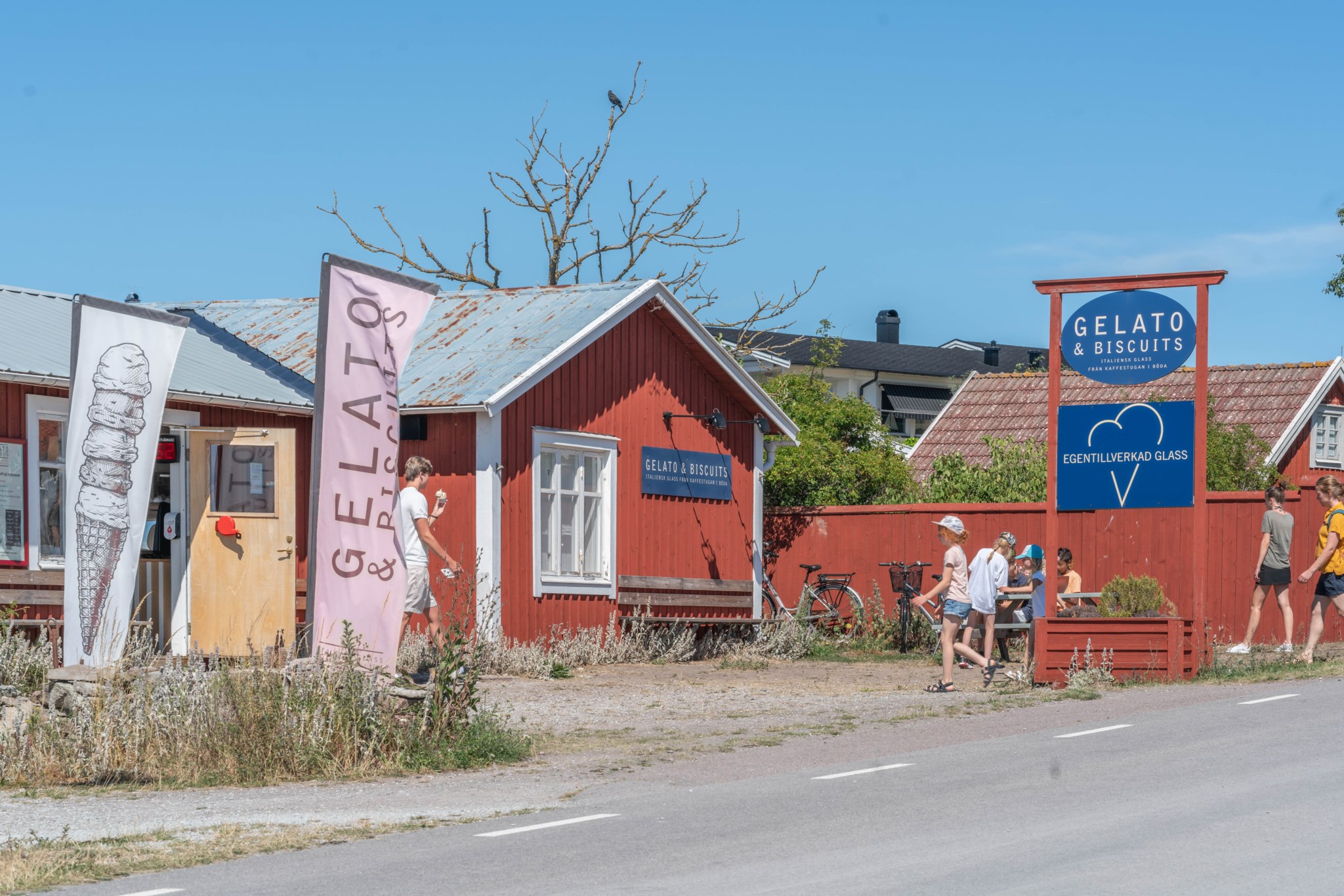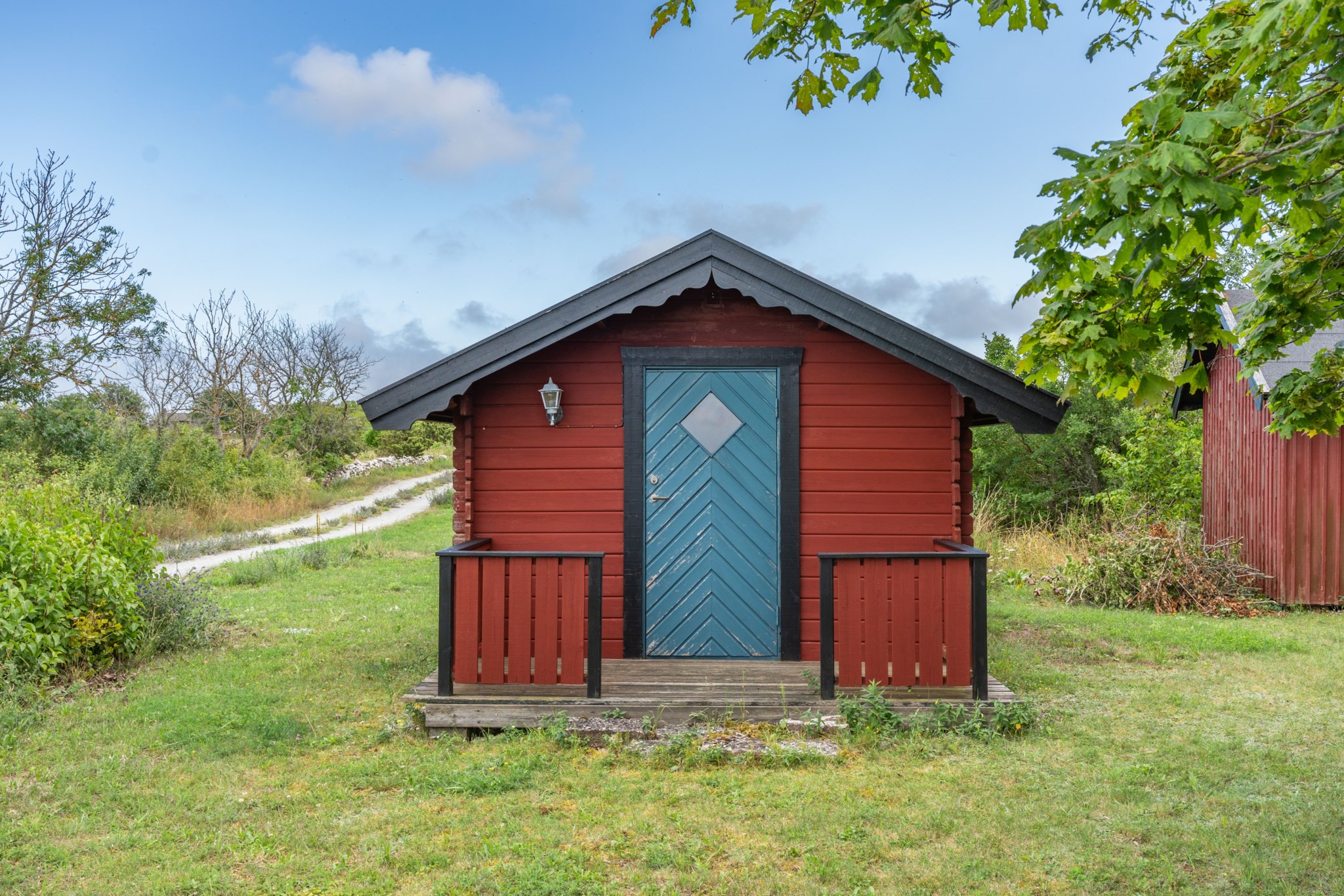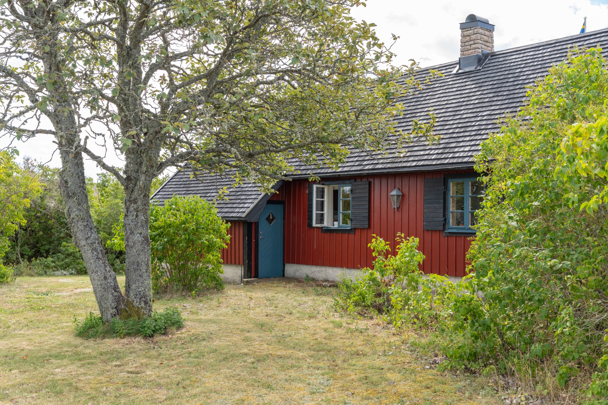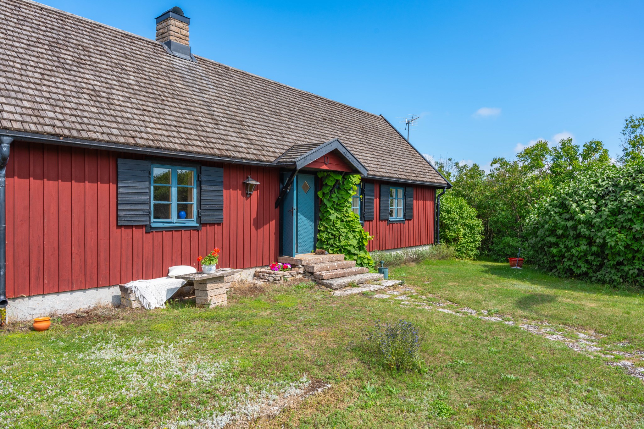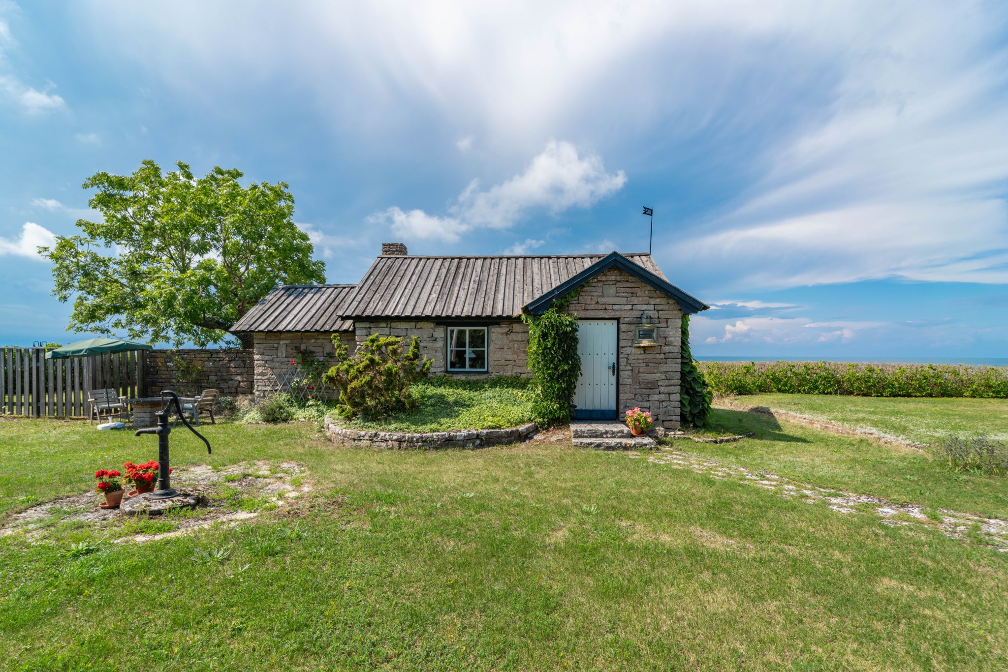 Mellan bostadshuset och stenhuset breder en skyddad innergård ut sig där syrenernas doft blandas med havsluften. Under vår och sommar fylls trädgården av allt från krokus till blåeld och blomning till fåglarnas sång. Här finns alltid en plats i lä – för morgonkaffet, för en stund i solen eller för långa kvällar tillsammans med familj och vänner.