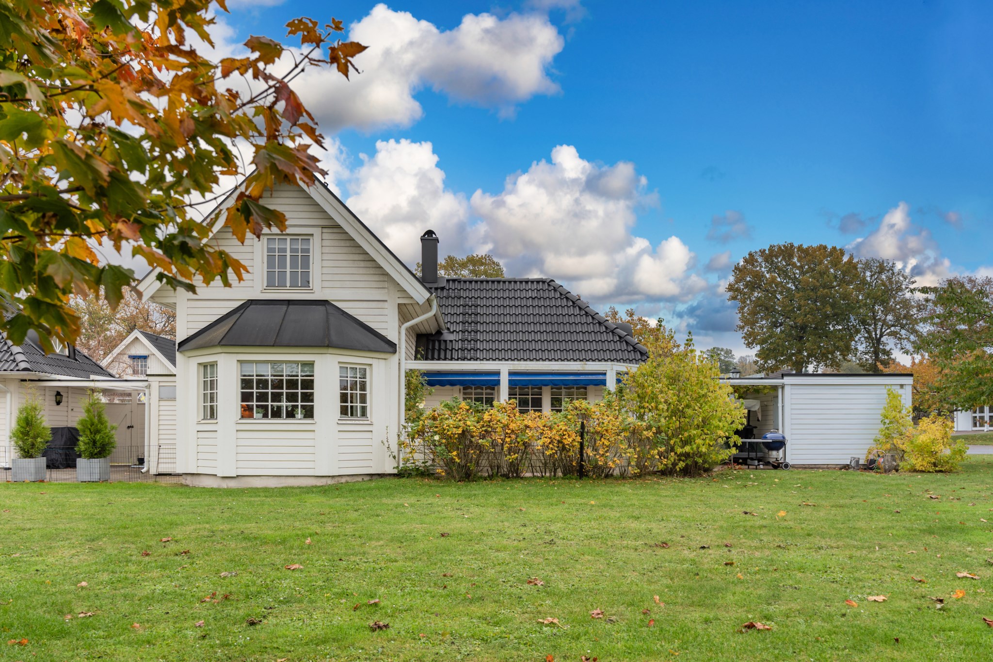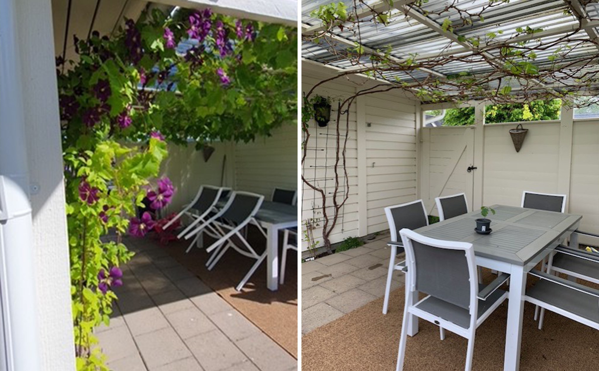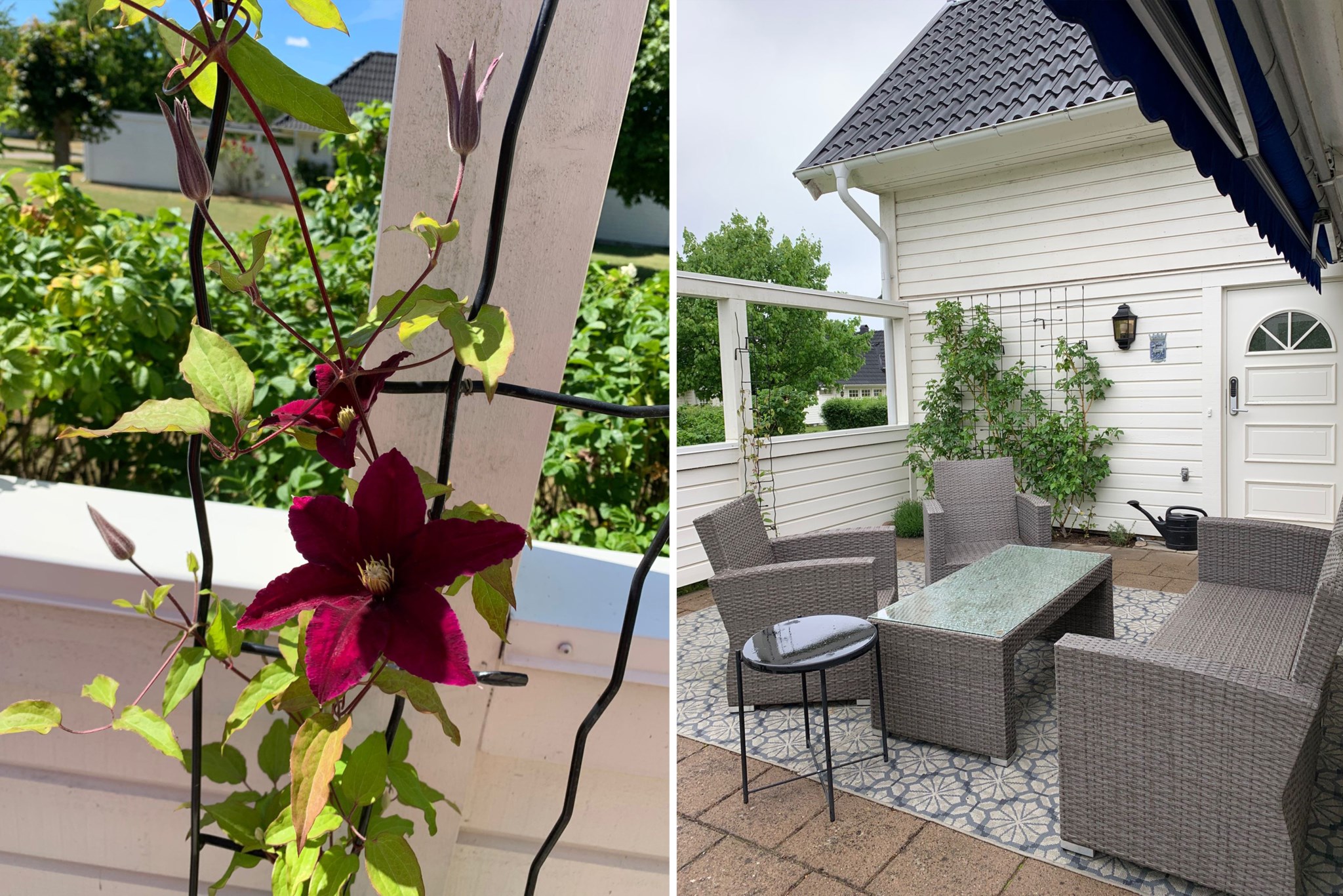 Det rymliga allrummet med braskamin (nyare modell) har utgång till en härlig altan i västerläge. Pergolan, som ramas in av vinrankor, bjuder in till ljumma kvällar med sol långt in på kvällen. En markis och ”see-through”-vindskydd ger både lä och flexibilitet. Förrådet har byggts ut till dubbel storlek utan att stjäla yta från uteplatsen – dessutom vinterisolerat och med extra kyl/frys.