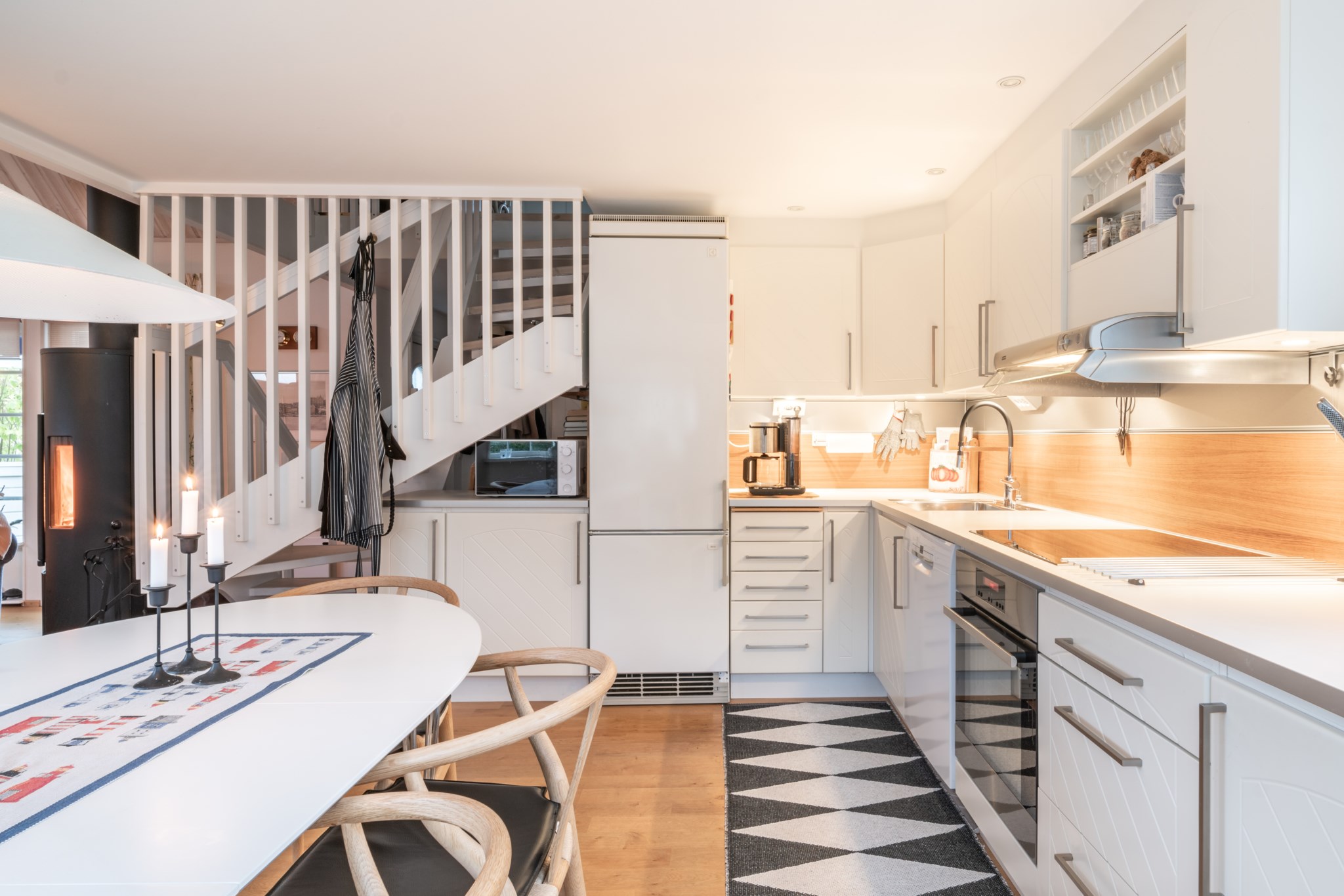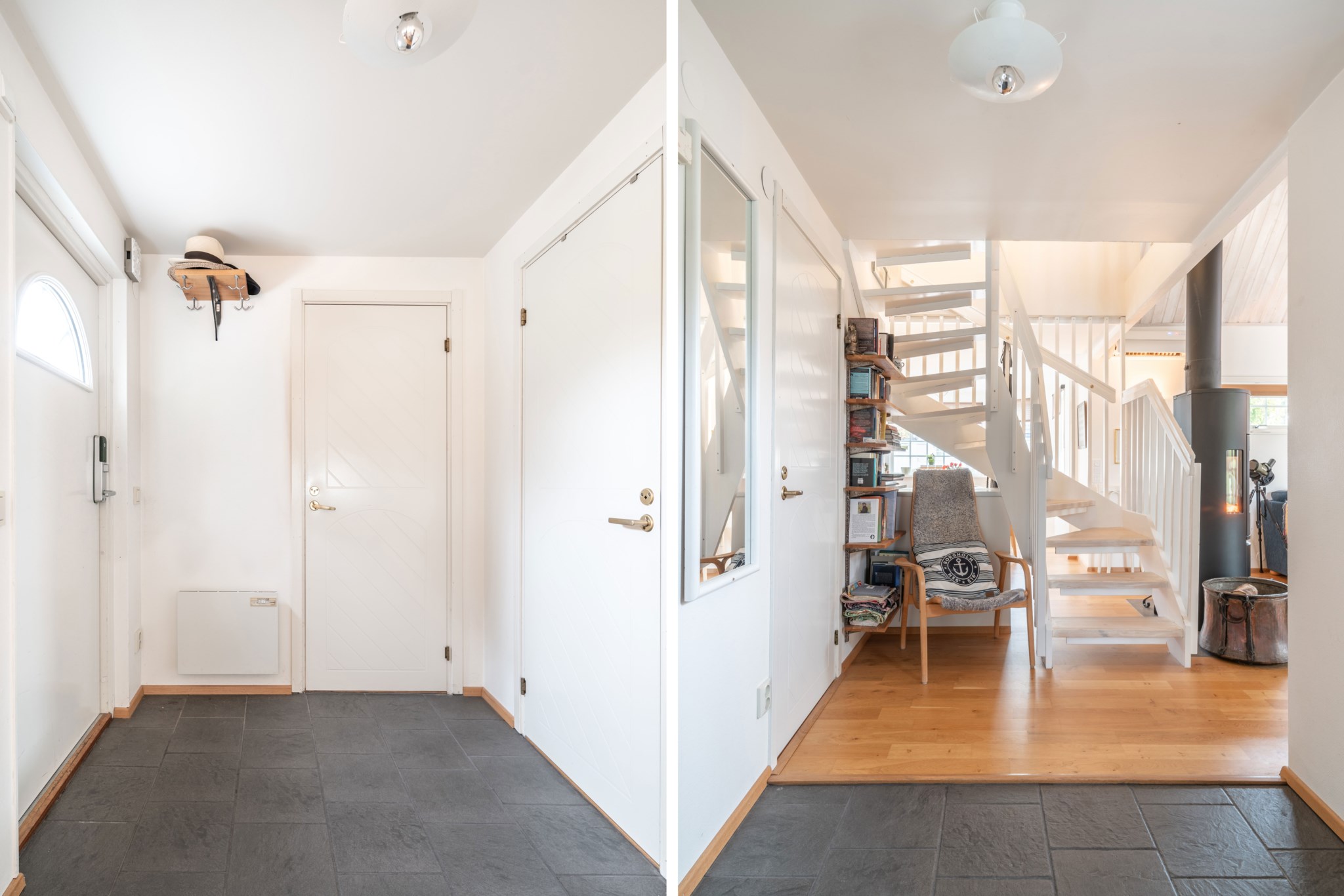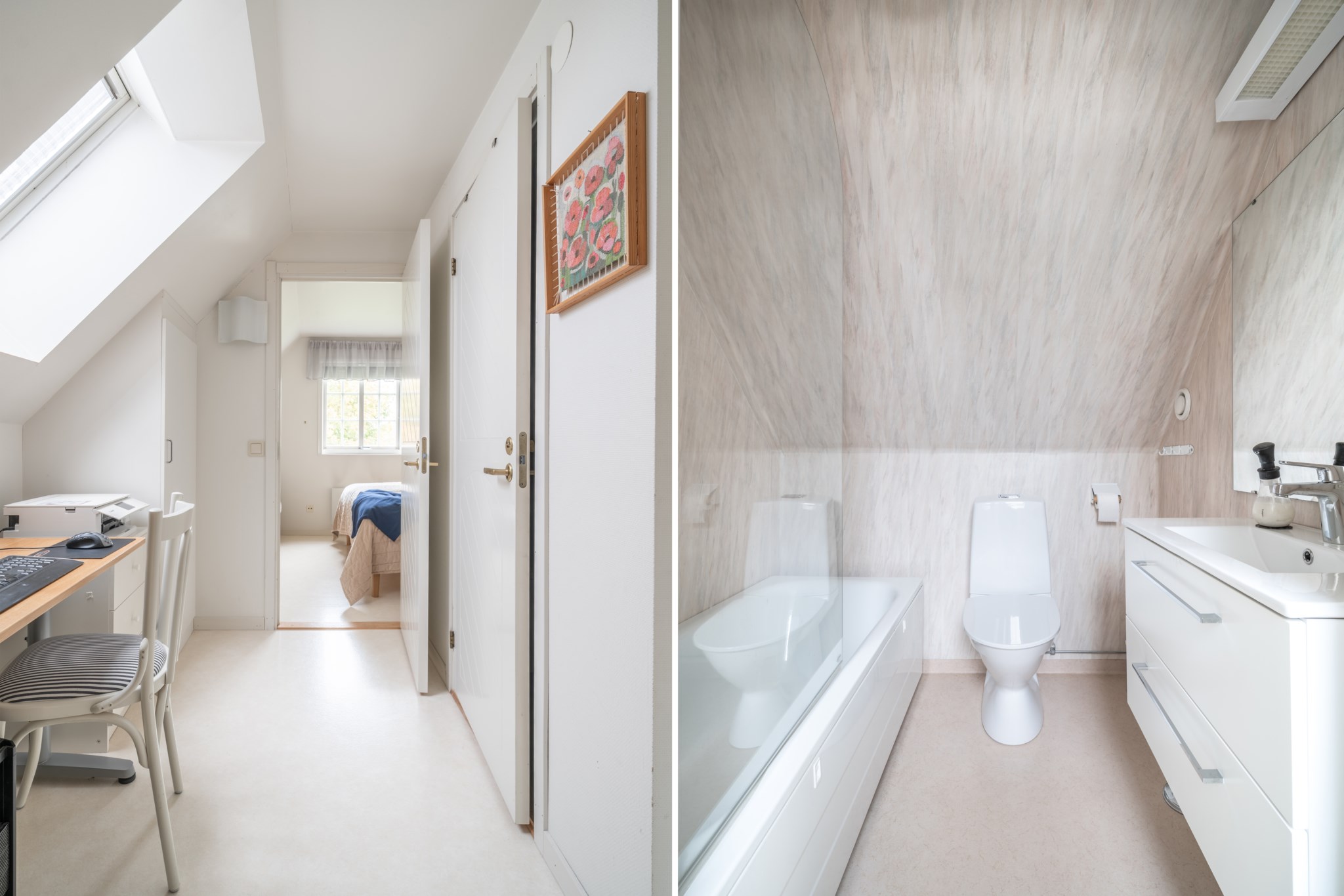 Huset är en modell 2 med valmat tak och har genom åren fått flera genomtänkta förbättringar. Köket har byggts ut och fått ny design från HTH med allt man behöver och stilrent stänkskydd, och i samband med det renoverades även badrummet på entréplanet. Här finns dusch, tvättmaskin och golvvärme, medan badrummet på övre plan erbjuder badkar – uppskattat av hela familjen.