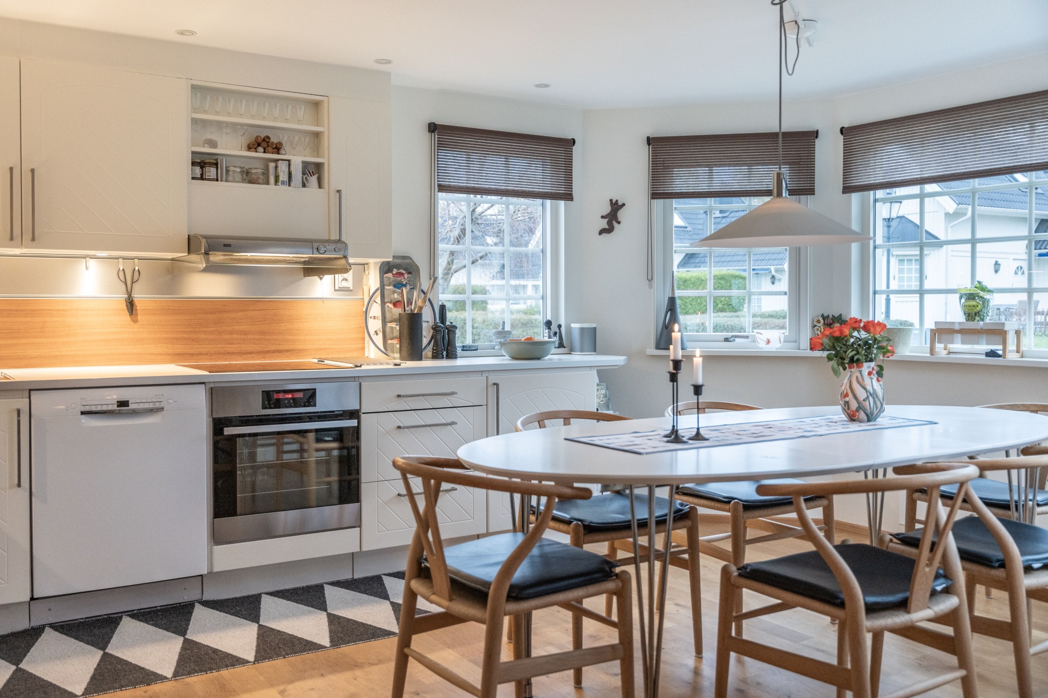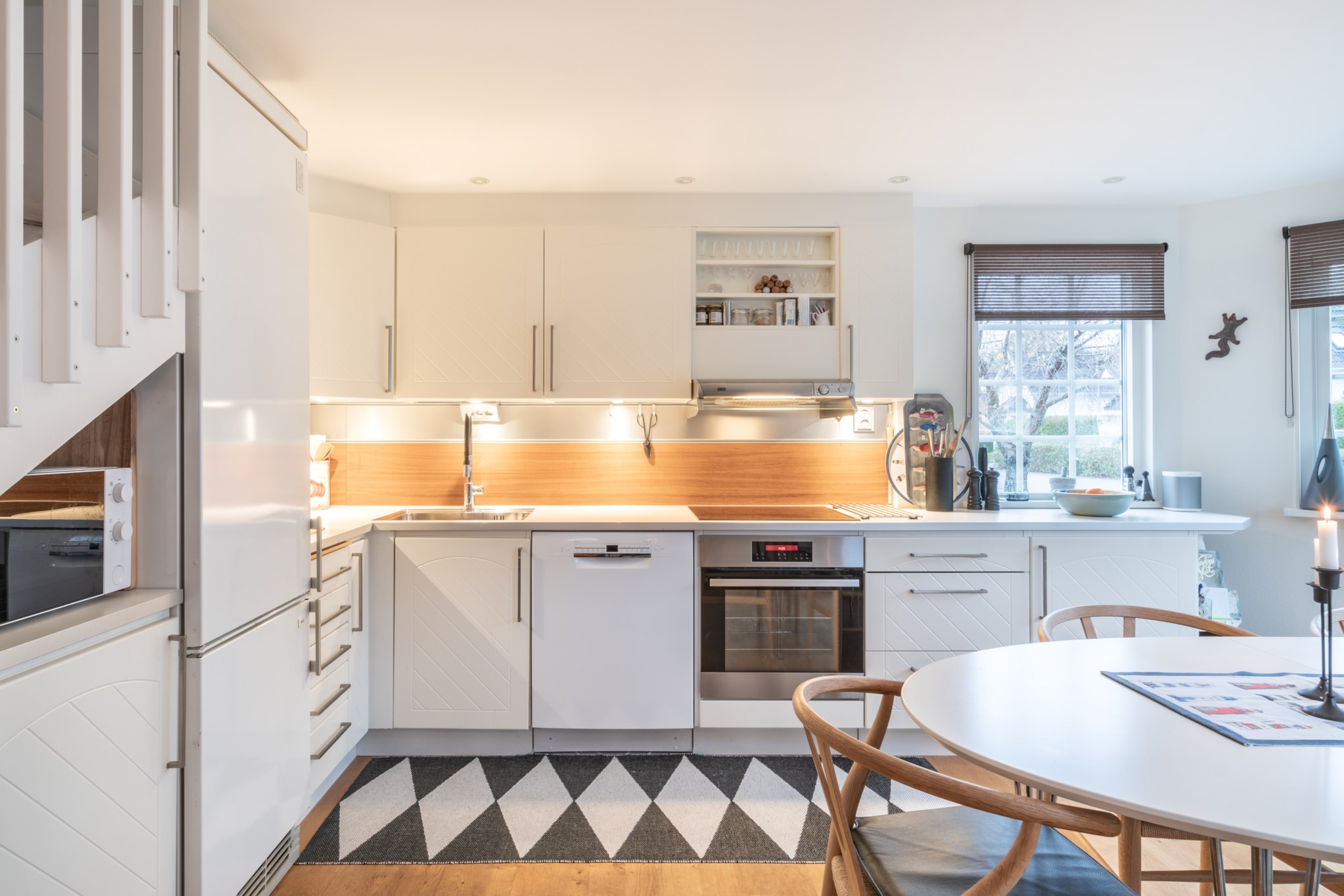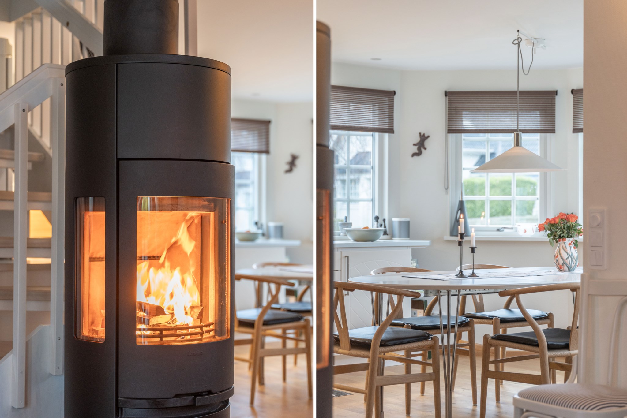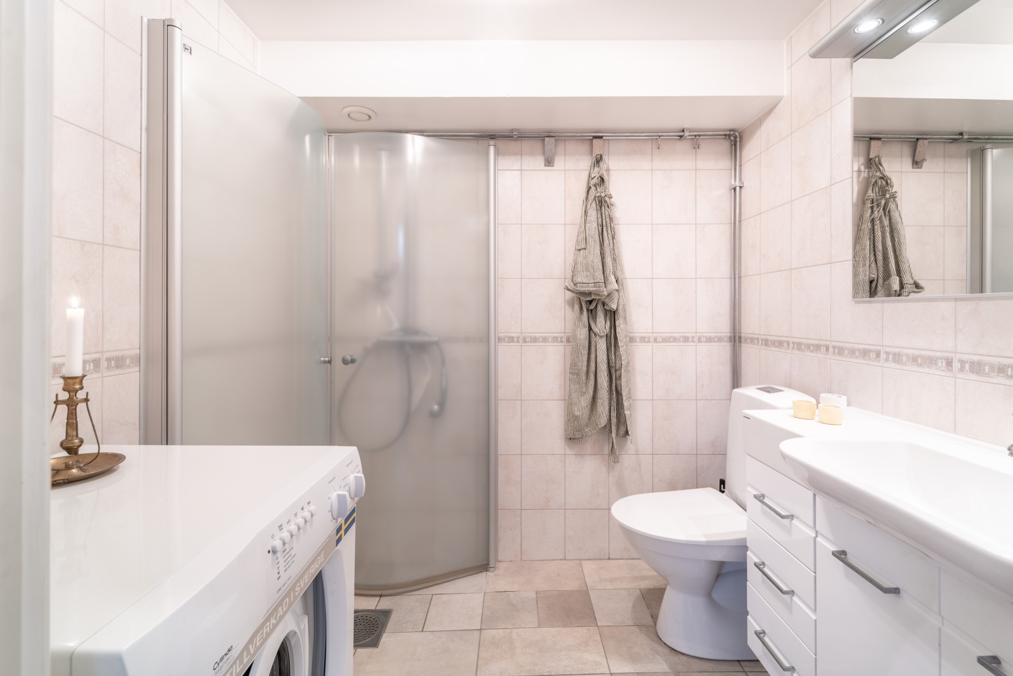 Huset är en modell 2 med valmat tak och har genom åren fått flera genomtänkta förbättringar. Köket har byggts ut och fått ny design från HTH med allt man behöver och stilrent stänkskydd, och i samband med det renoverades även badrummet på entréplanet. Här finns dusch, tvättmaskin och golvvärme, medan badrummet på övre plan erbjuder badkar – uppskattat av hela familjen.