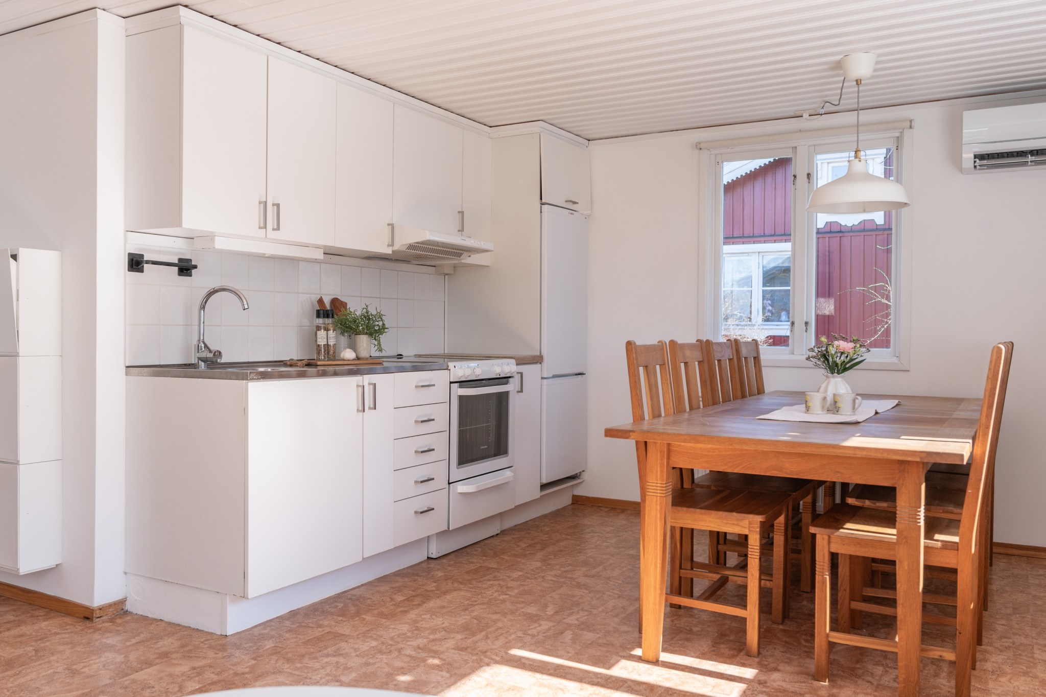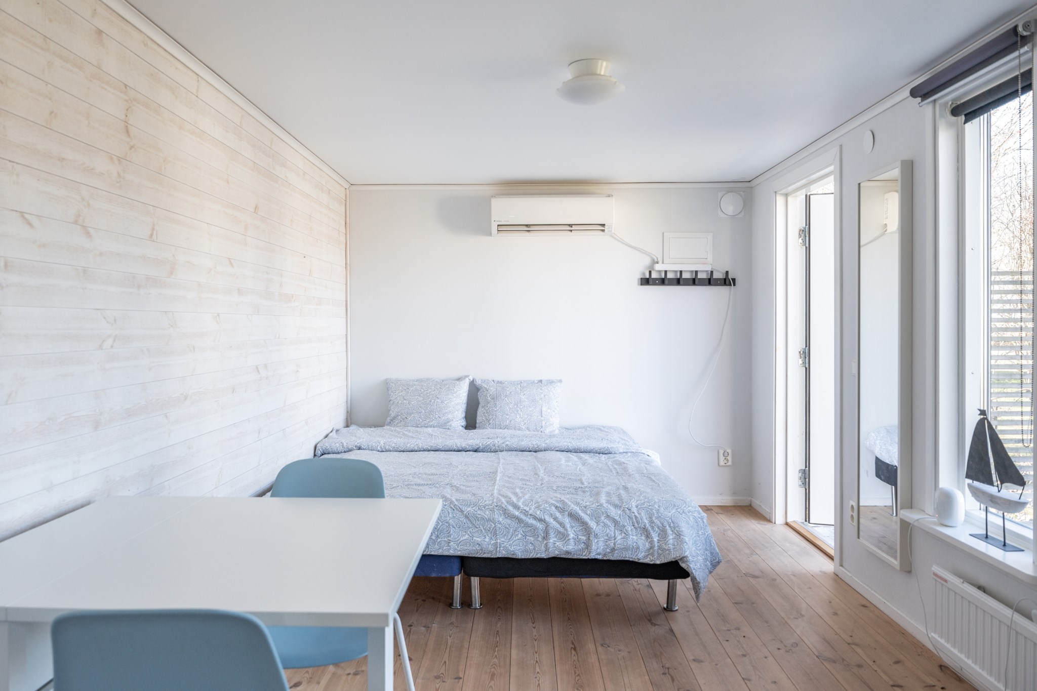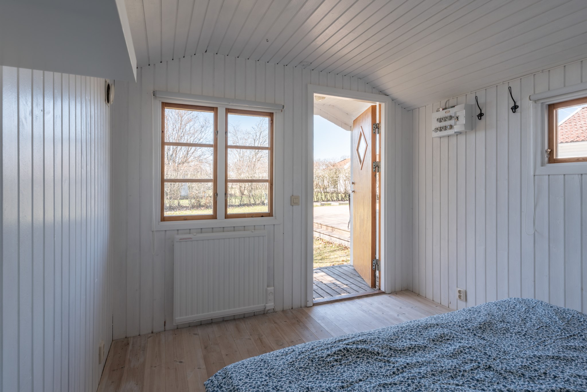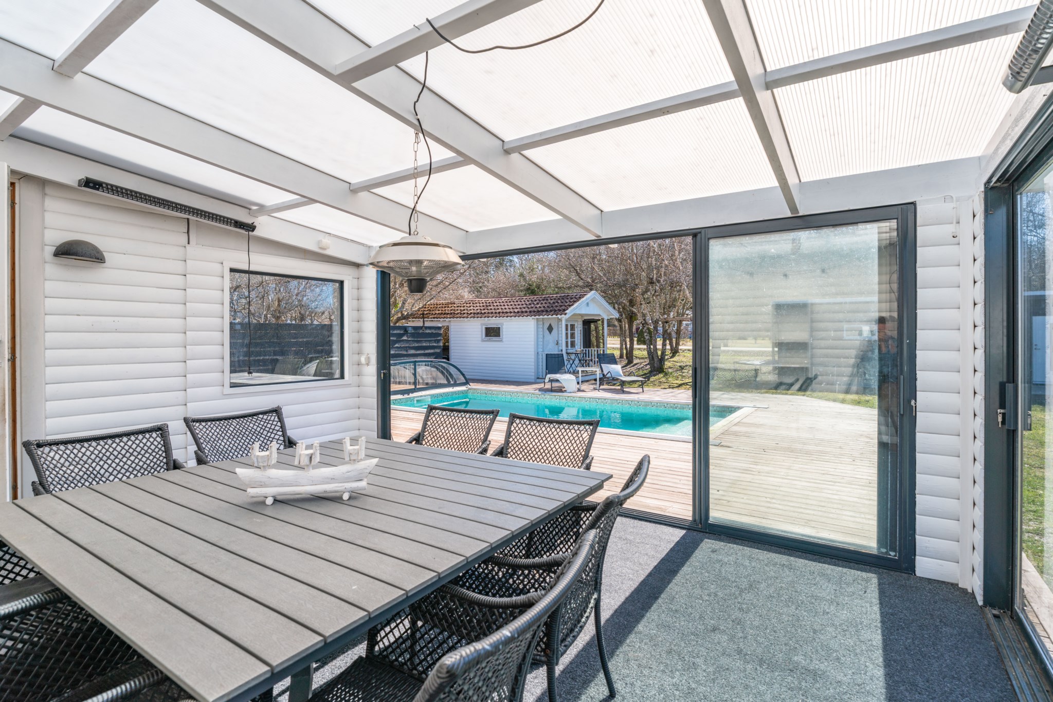 Bostaden präglas av ljus och moderna materialval. Huvudhuset erbjuder en öppen planlösning med kök, rymlig matplats och trivsam sällskapsdel – perfekt för umgänge. Här finns även två sovrum samt badrum med tvättmaskin. Det inglasade uterummet med infravärme förlänger säsongen och skapar en extra yta att njuta av, oavsett väder.