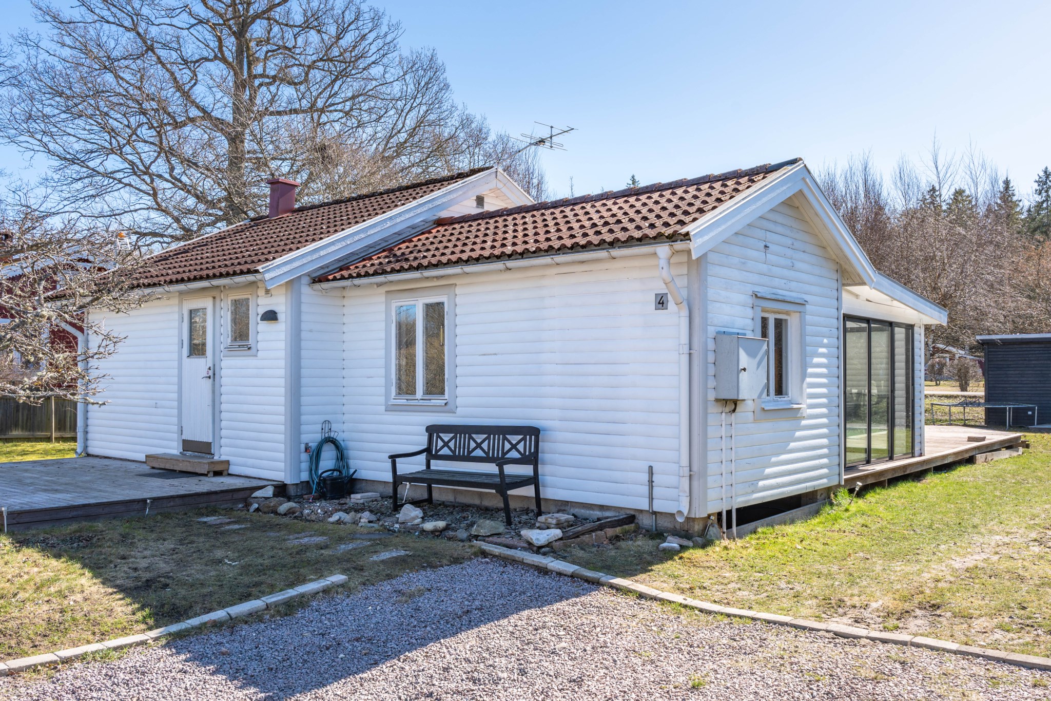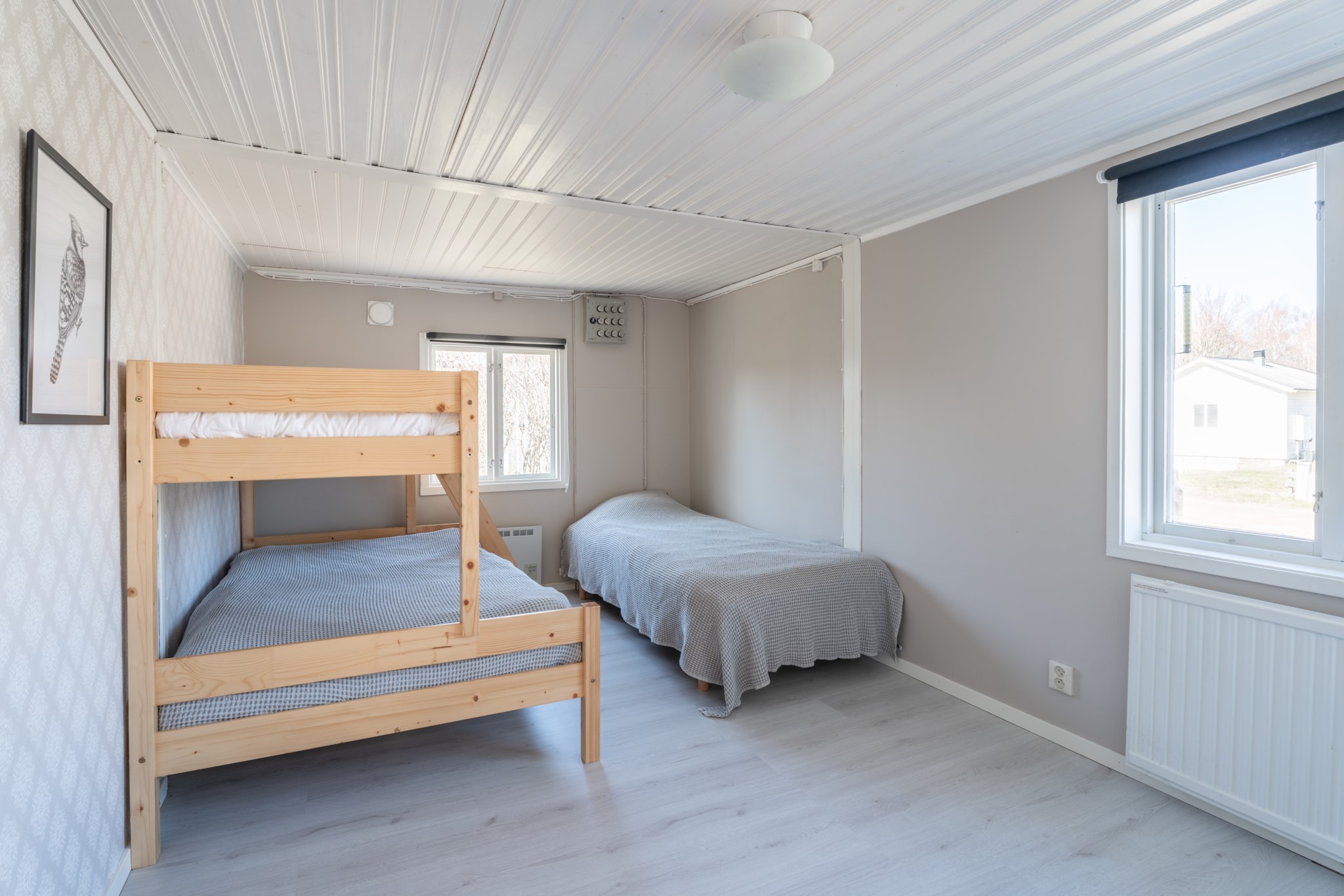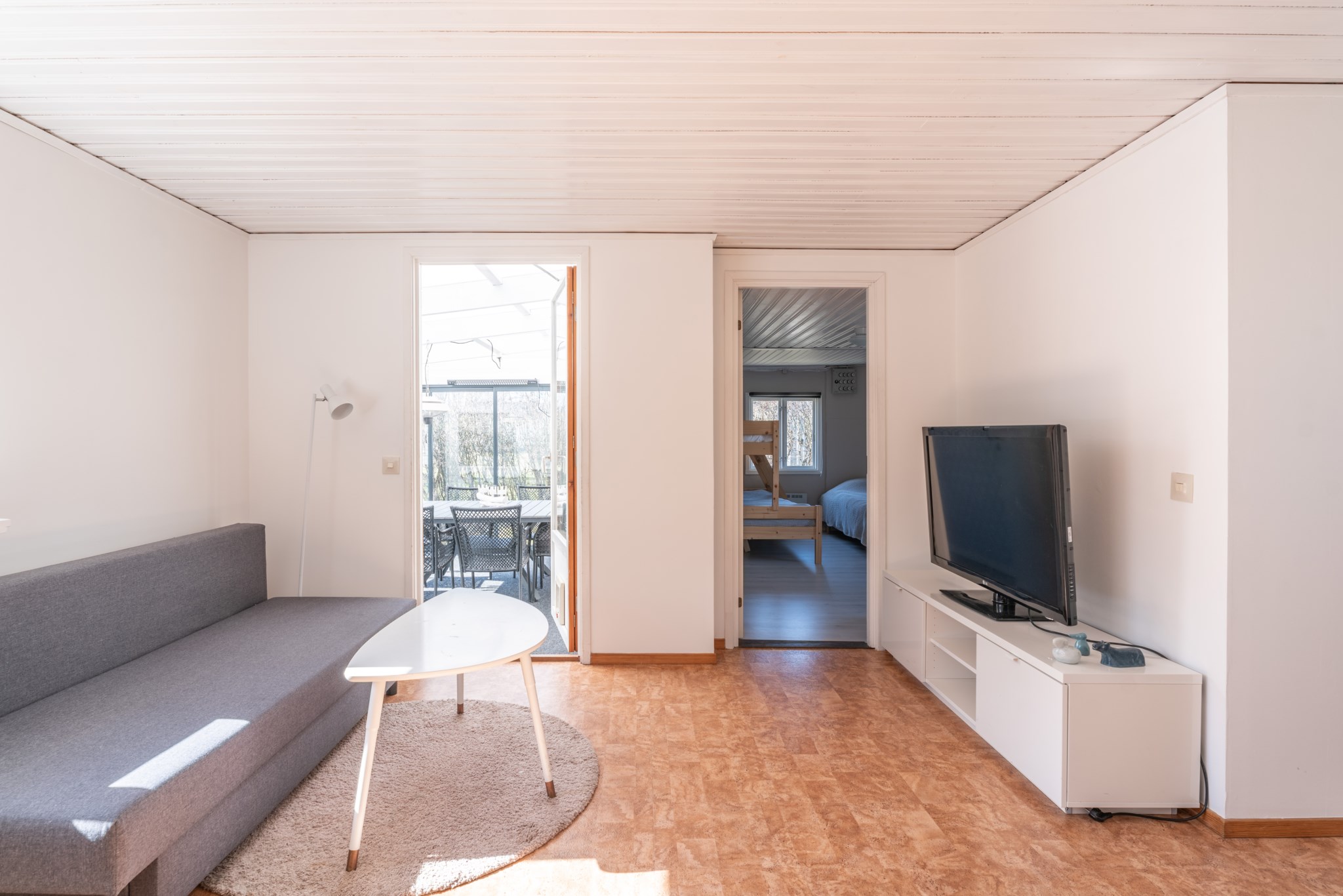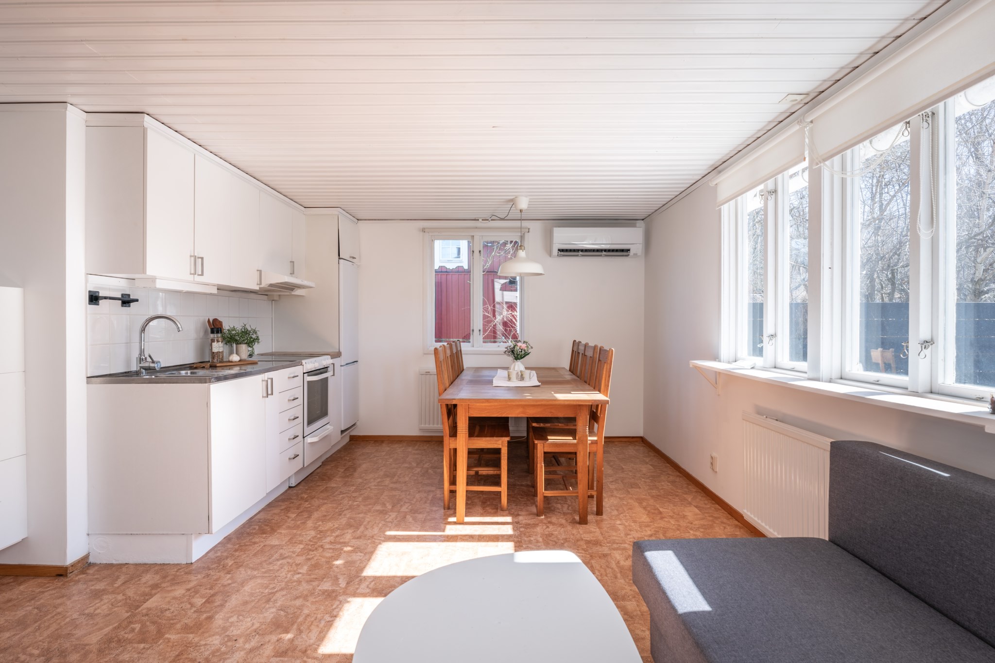 Bostaden präglas av ljus och moderna materialval. Huvudhuset erbjuder en öppen planlösning med kök, rymlig matplats och trivsam sällskapsdel – perfekt för umgänge. Här finns även två sovrum samt badrum med tvättmaskin. Det inglasade uterummet med infravärme förlänger säsongen och skapar en extra yta att njuta av, oavsett väder.