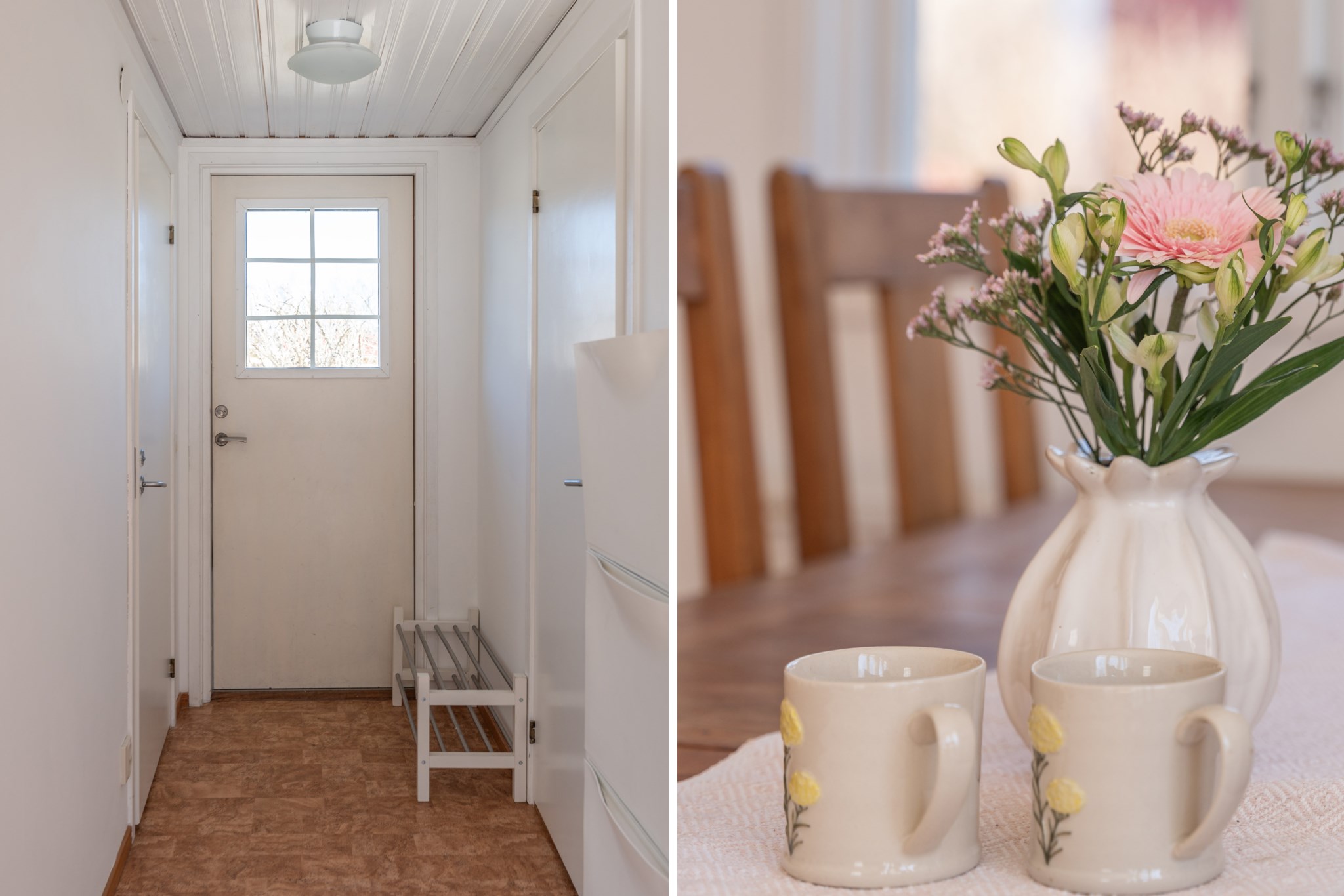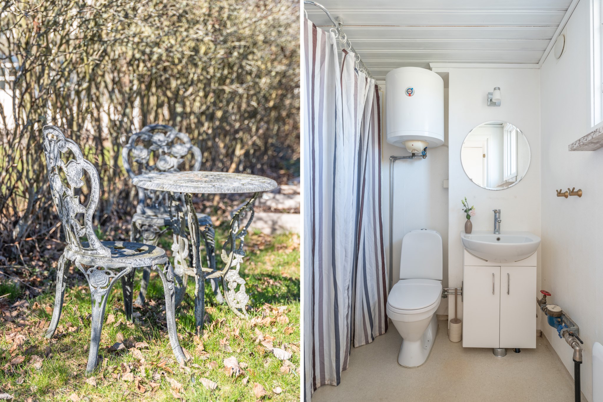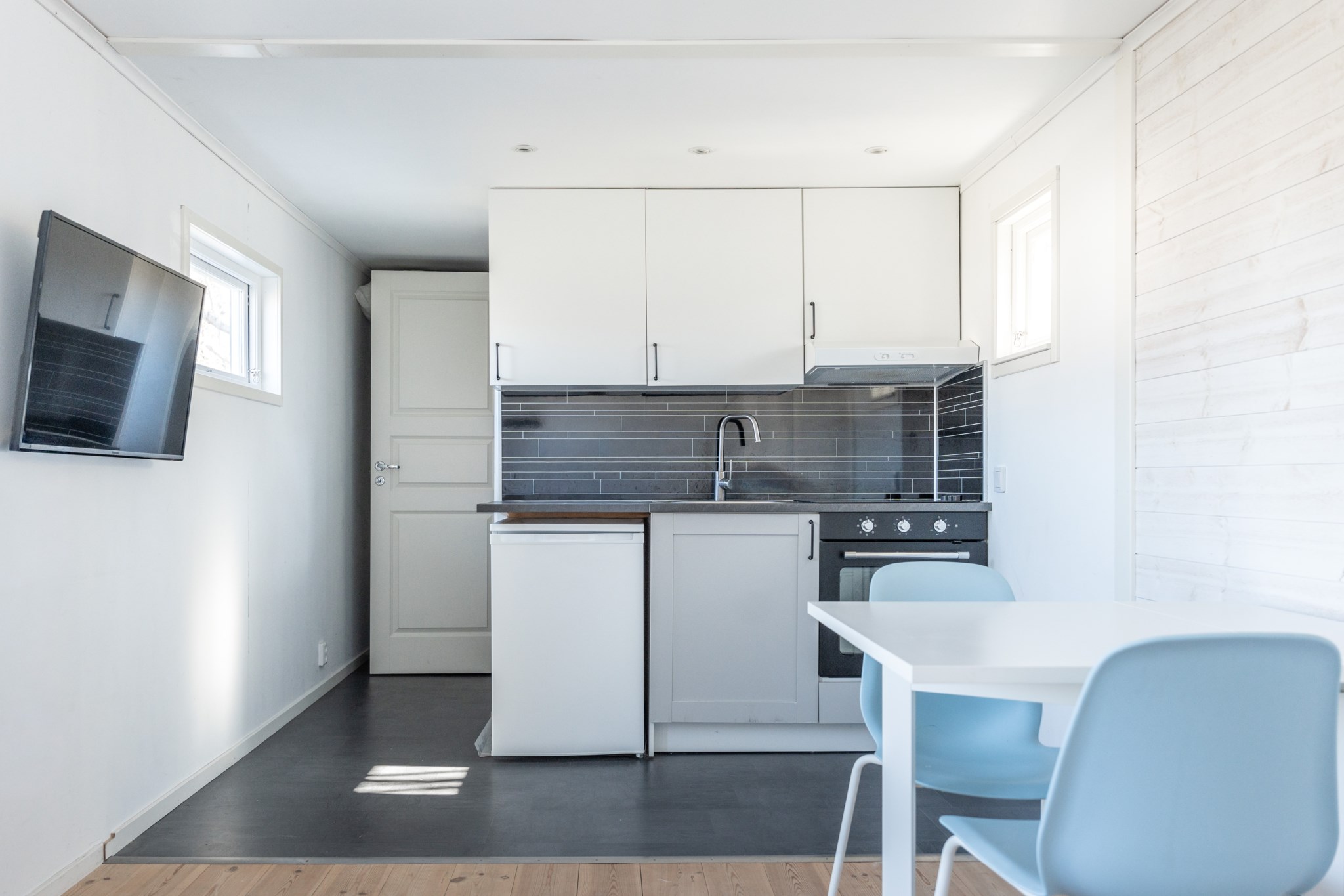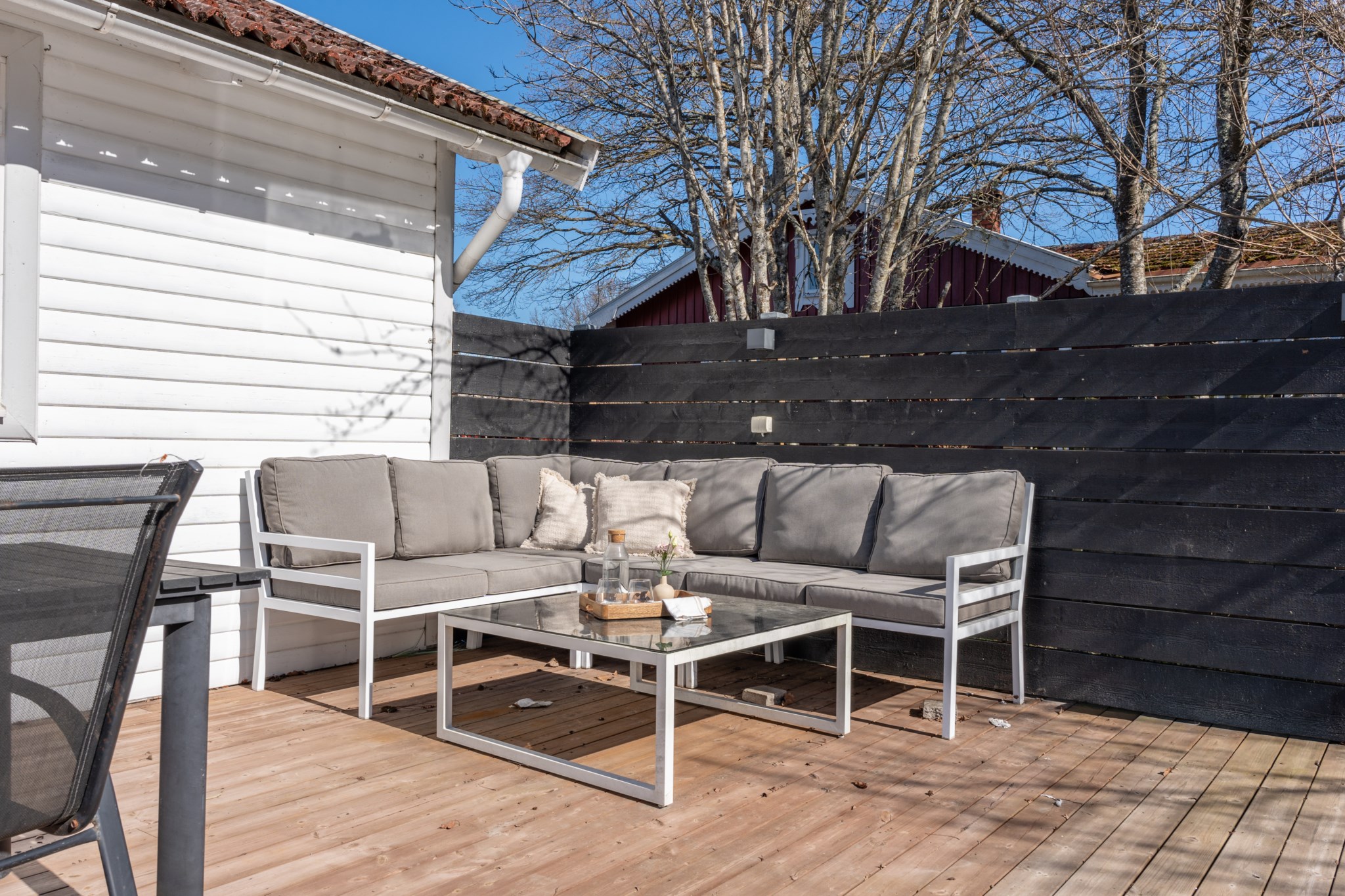 Bostaden präglas av ljus och moderna materialval. Huvudhuset erbjuder en öppen planlösning med kök, rymlig matplats och trivsam sällskapsdel – perfekt för umgänge. Här finns även två sovrum samt badrum med tvättmaskin. Det inglasade uterummet med infravärme förlänger säsongen och skapar en extra yta att njuta av, oavsett väder.