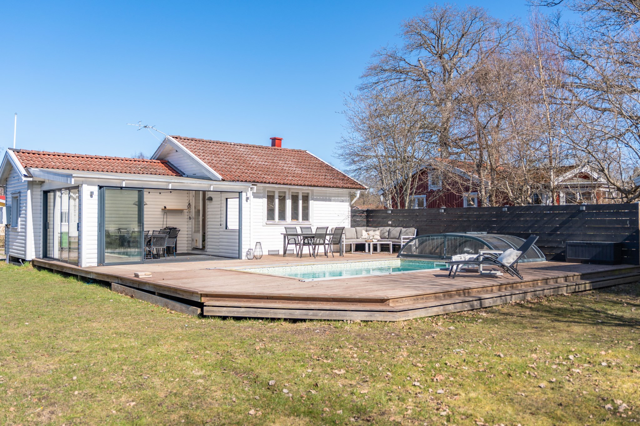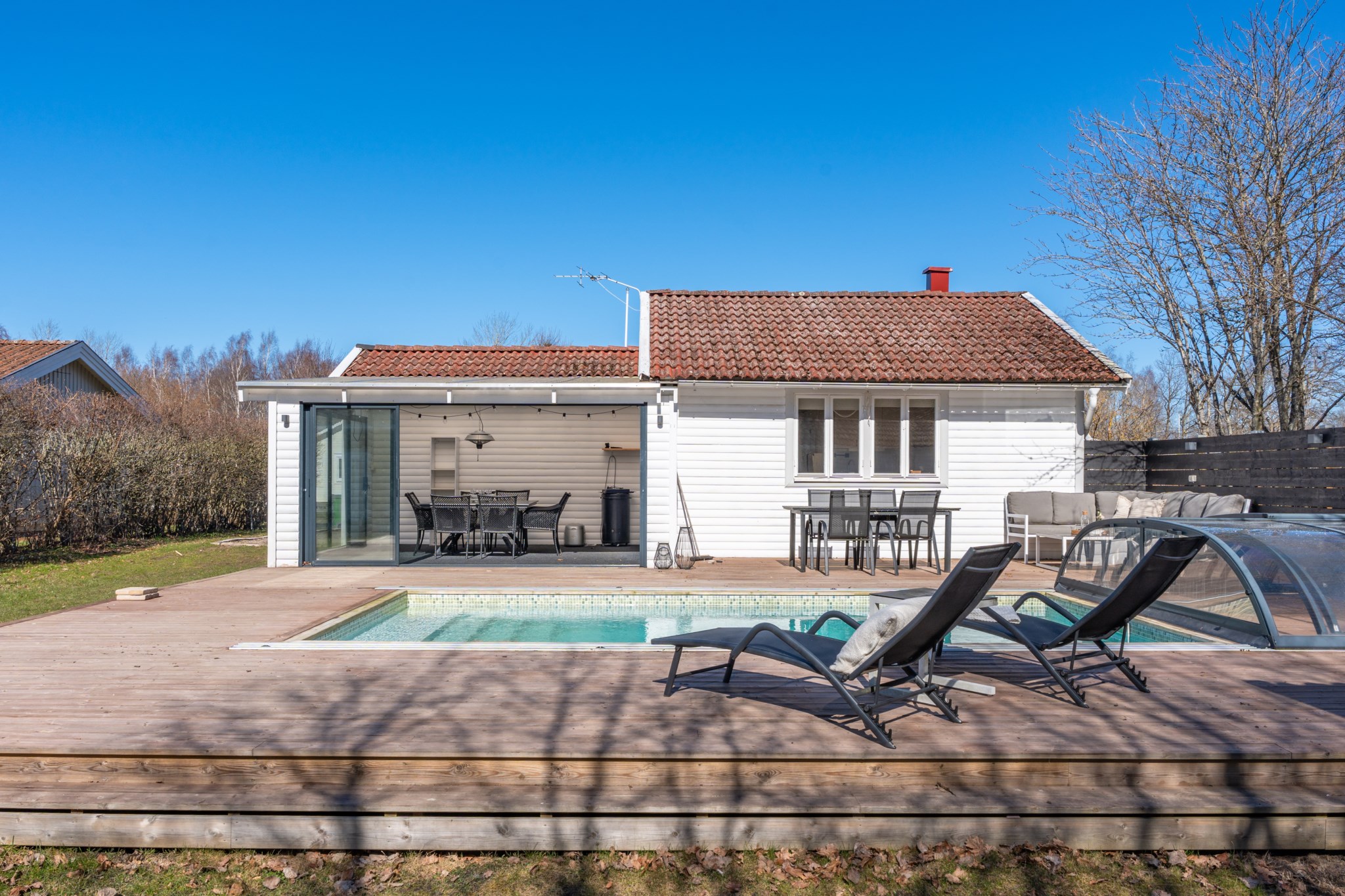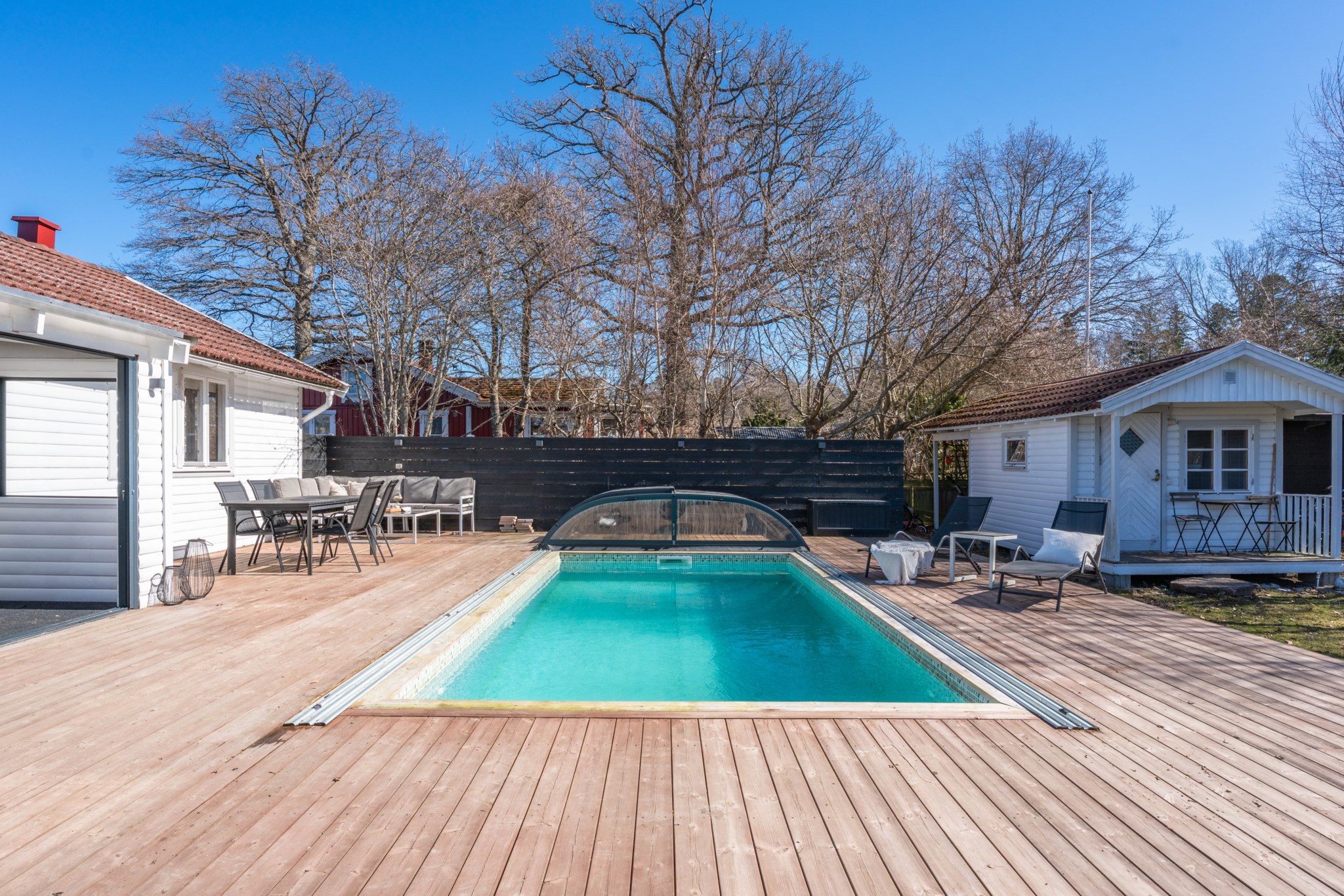 Välkommen till ett genomtänkt fritidsboende på insynsskyddad tomt i populära Saxnäs. Här erbjuds ett härligt poolområde med stort trädäck – en naturlig samlingsplats för sommarens alla stunder. Med två gästhus och generöst med sovplatser finns gott om utrymme för både familj och vänner.