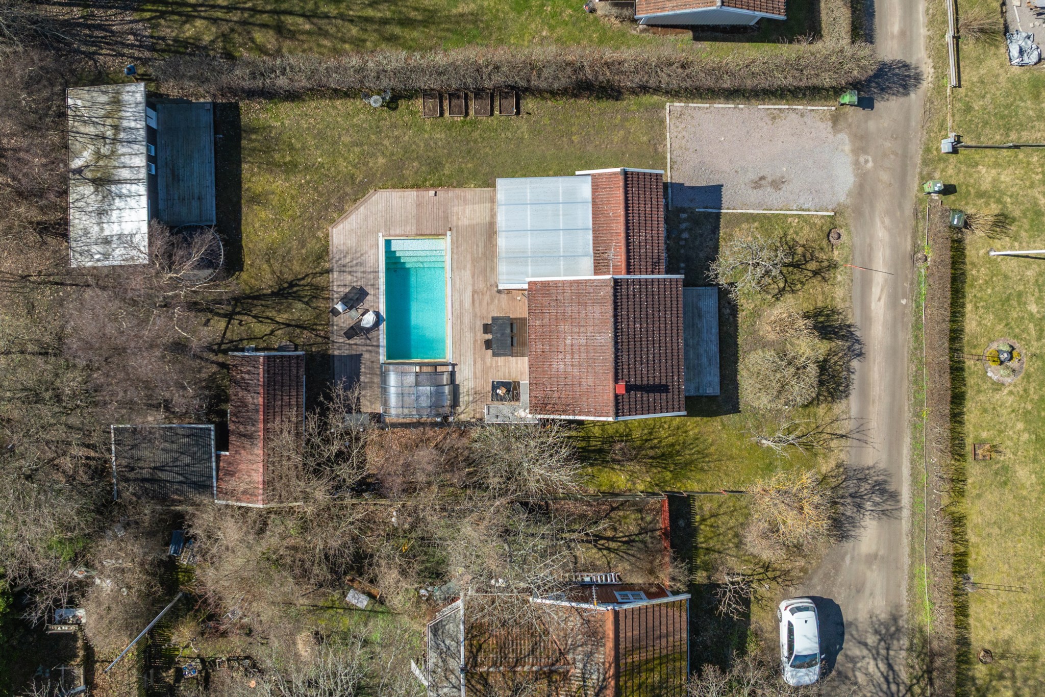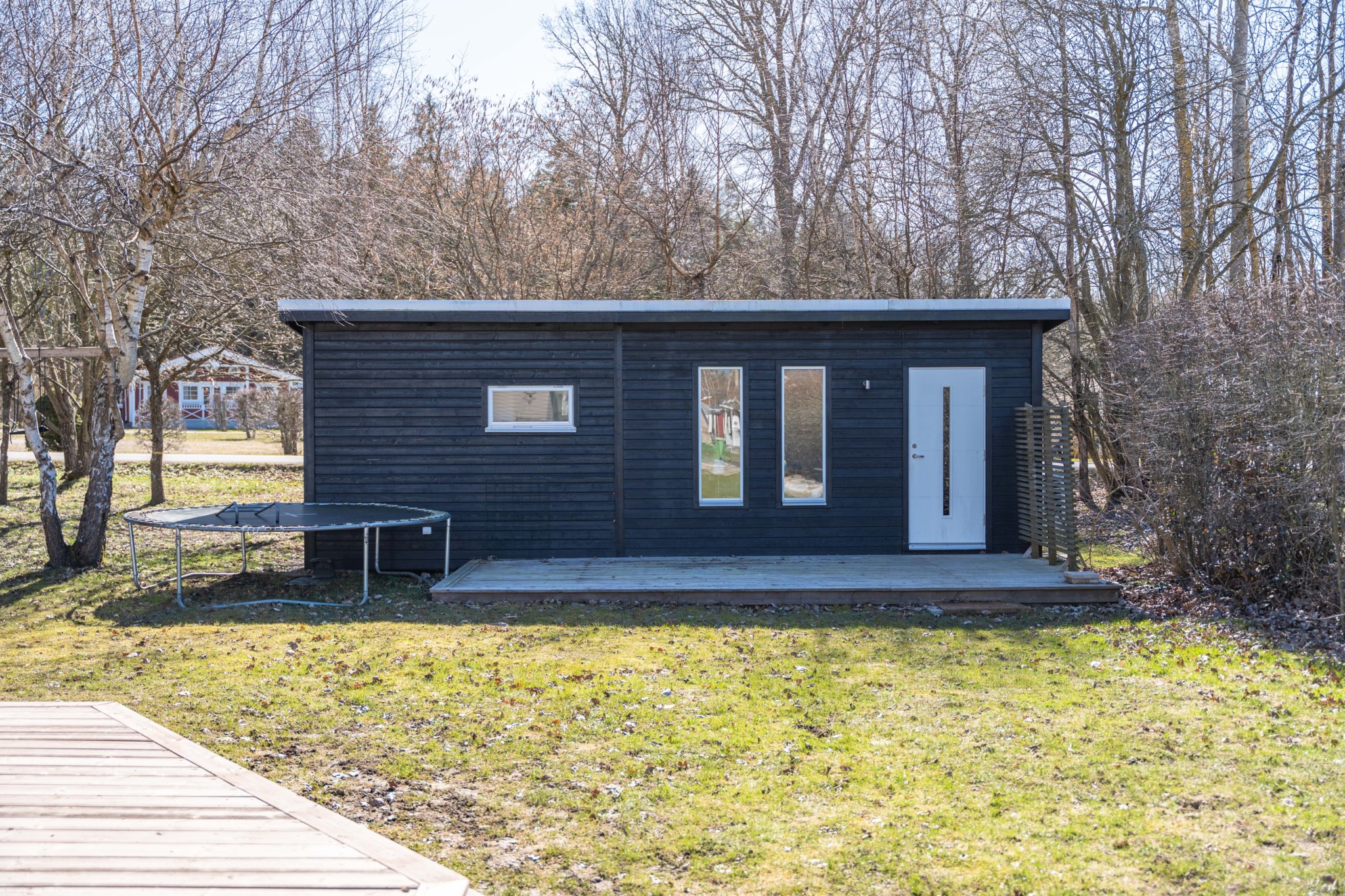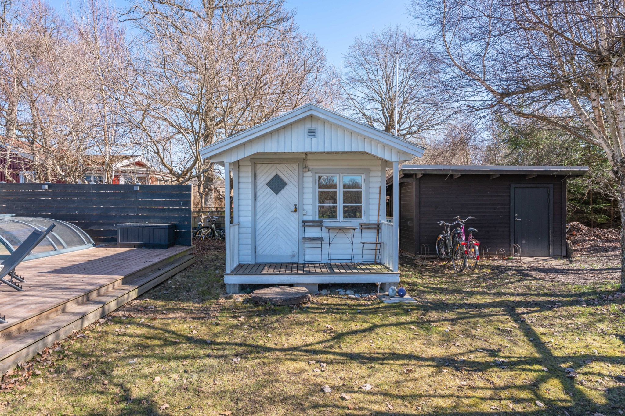 På tomten finns två gästhus, varav det större är fullt utrustat med eget kök och badrum samt altan i kvällssol – idealiskt för gäster eller uthyrning. Därtill finns ett fristående förrådshus för praktisk förvaring av cyklar och trädgårdsredskap.