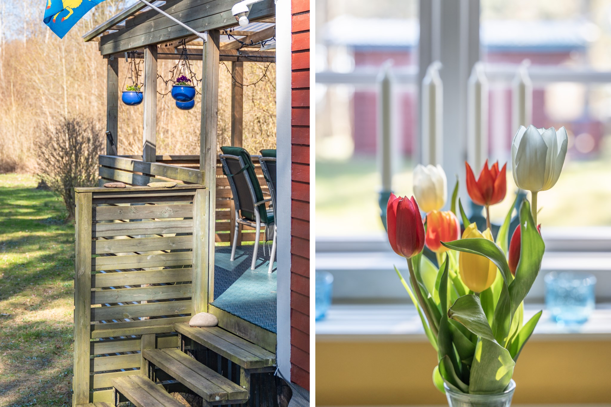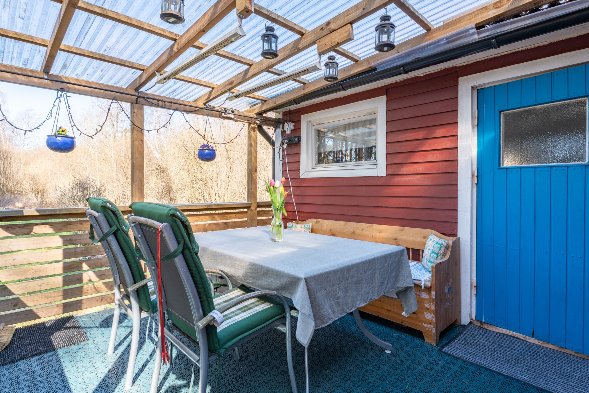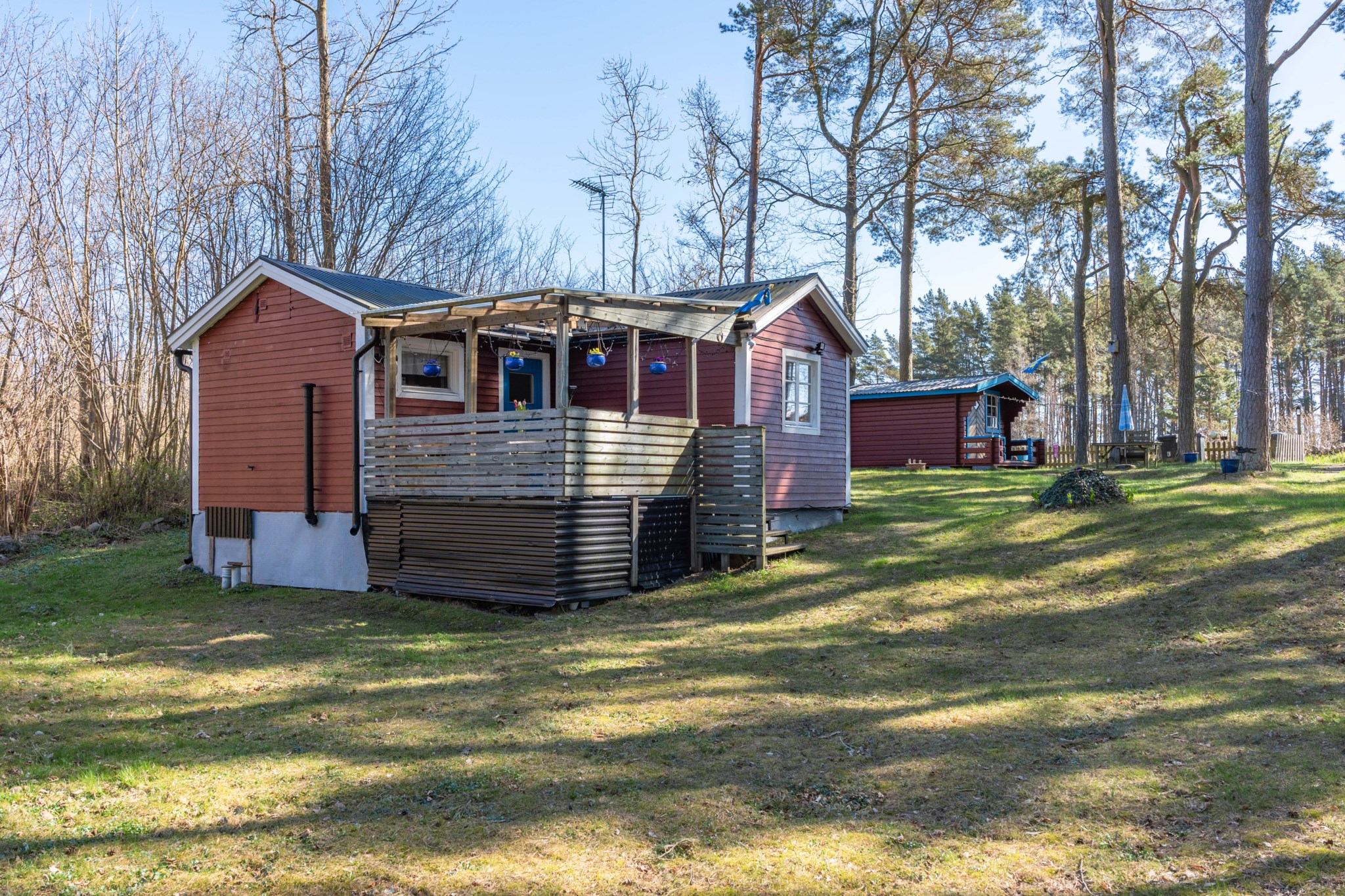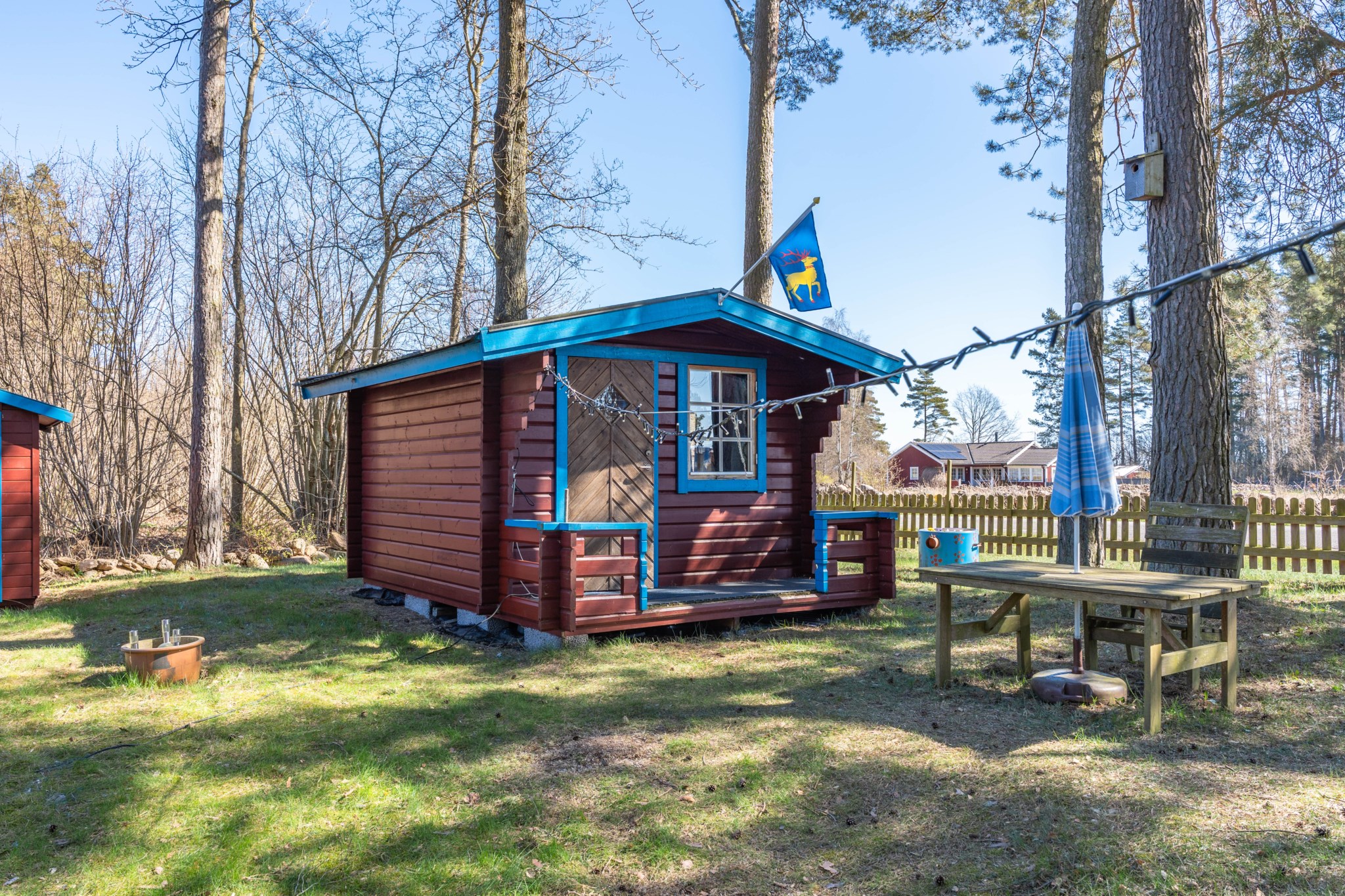 Bostadshuset, ett rött hus med vita knutar, har en trivsam och inbjudande känsla med altan under tak – en plats som säljarna särskilt uppskattat för långa, avkopplande stunder oavsett väder. Här finns även ett separat gästhus med egen liten uteplats, vilket ger extra utrymme för familj och vänner.