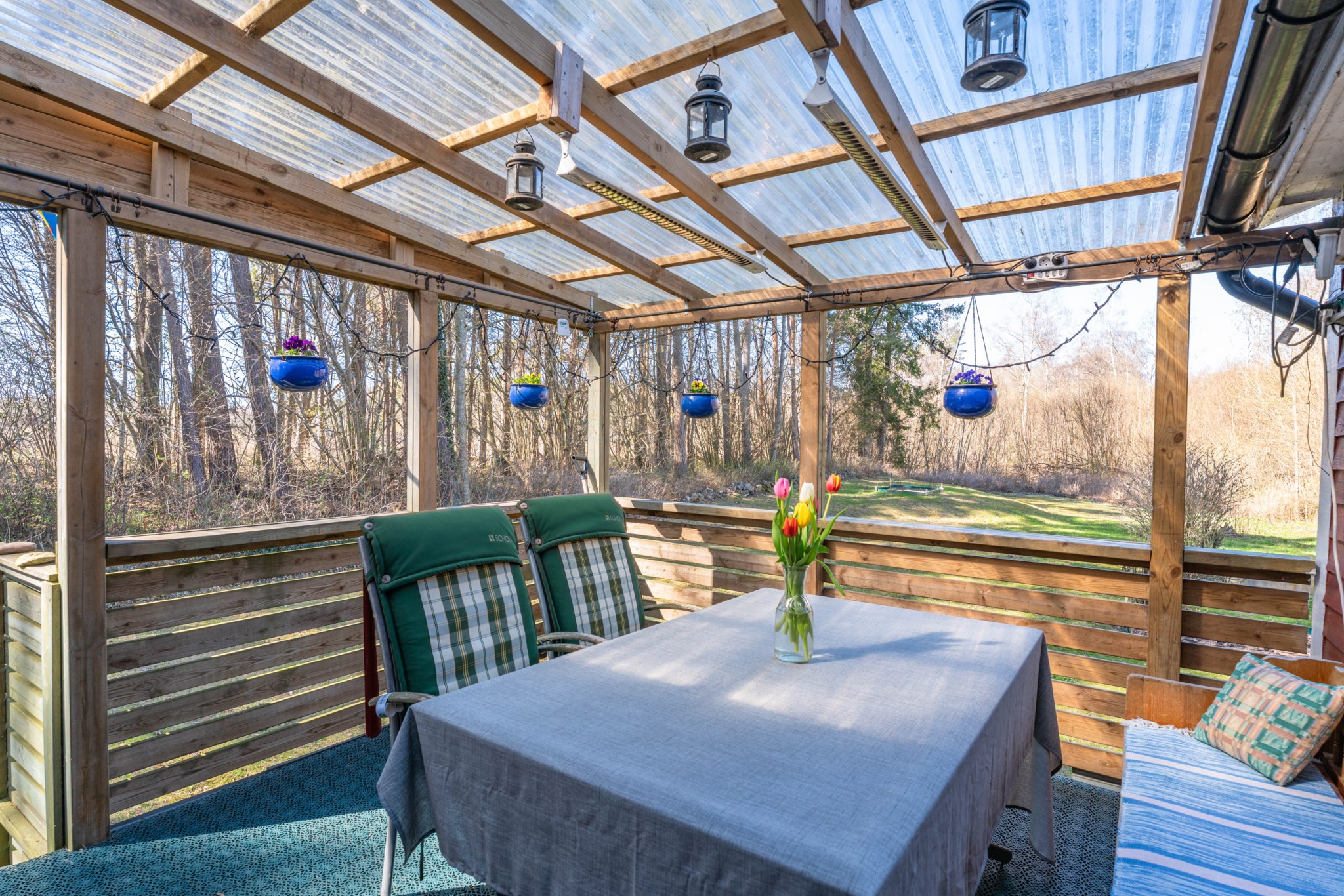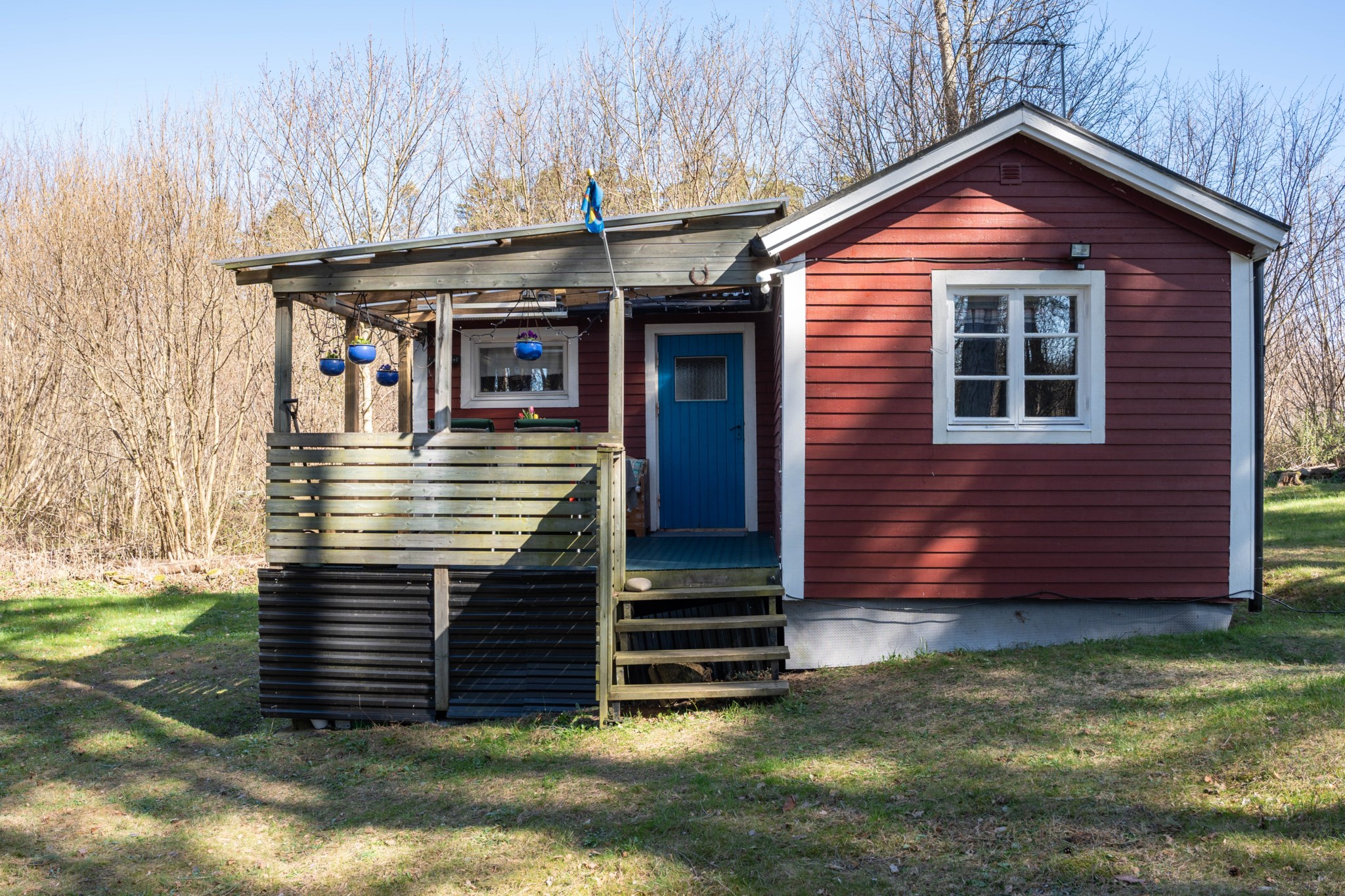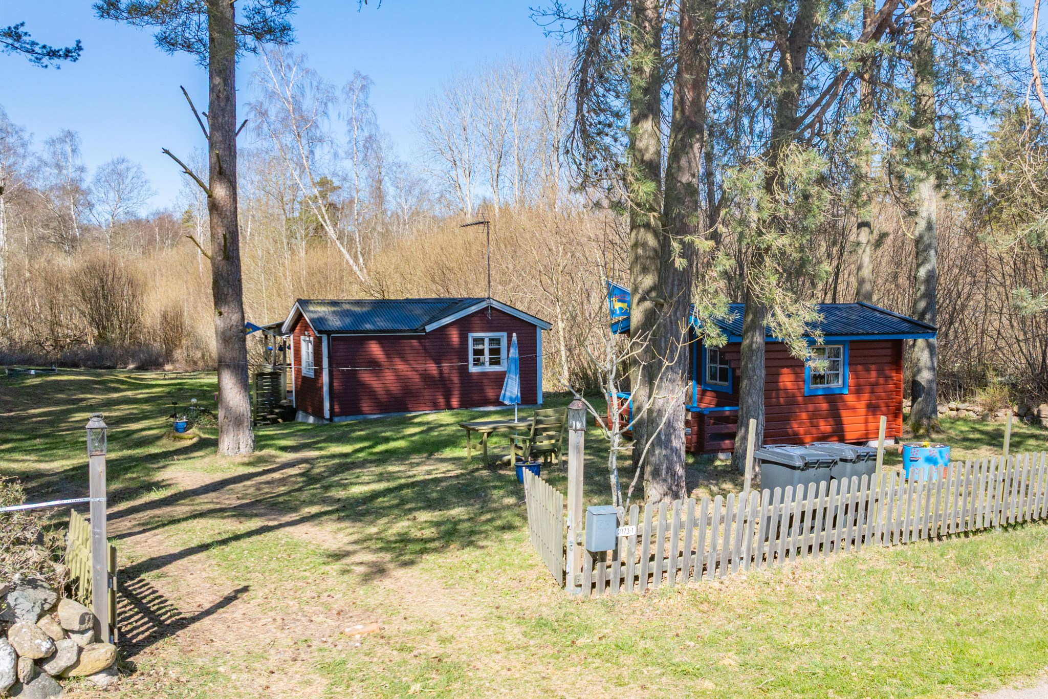 Bostadshuset, ett rött hus med vita knutar, har en trivsam och inbjudande känsla med altan under tak – en plats som säljarna särskilt uppskattat för långa, avkopplande stunder oavsett väder. Här finns även ett separat gästhus med egen liten uteplats, vilket ger extra utrymme för familj och vänner.