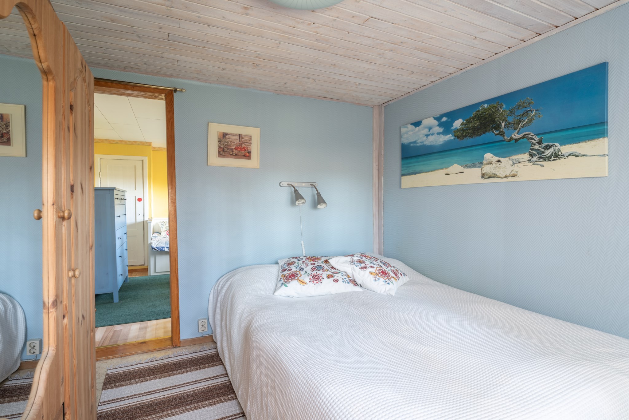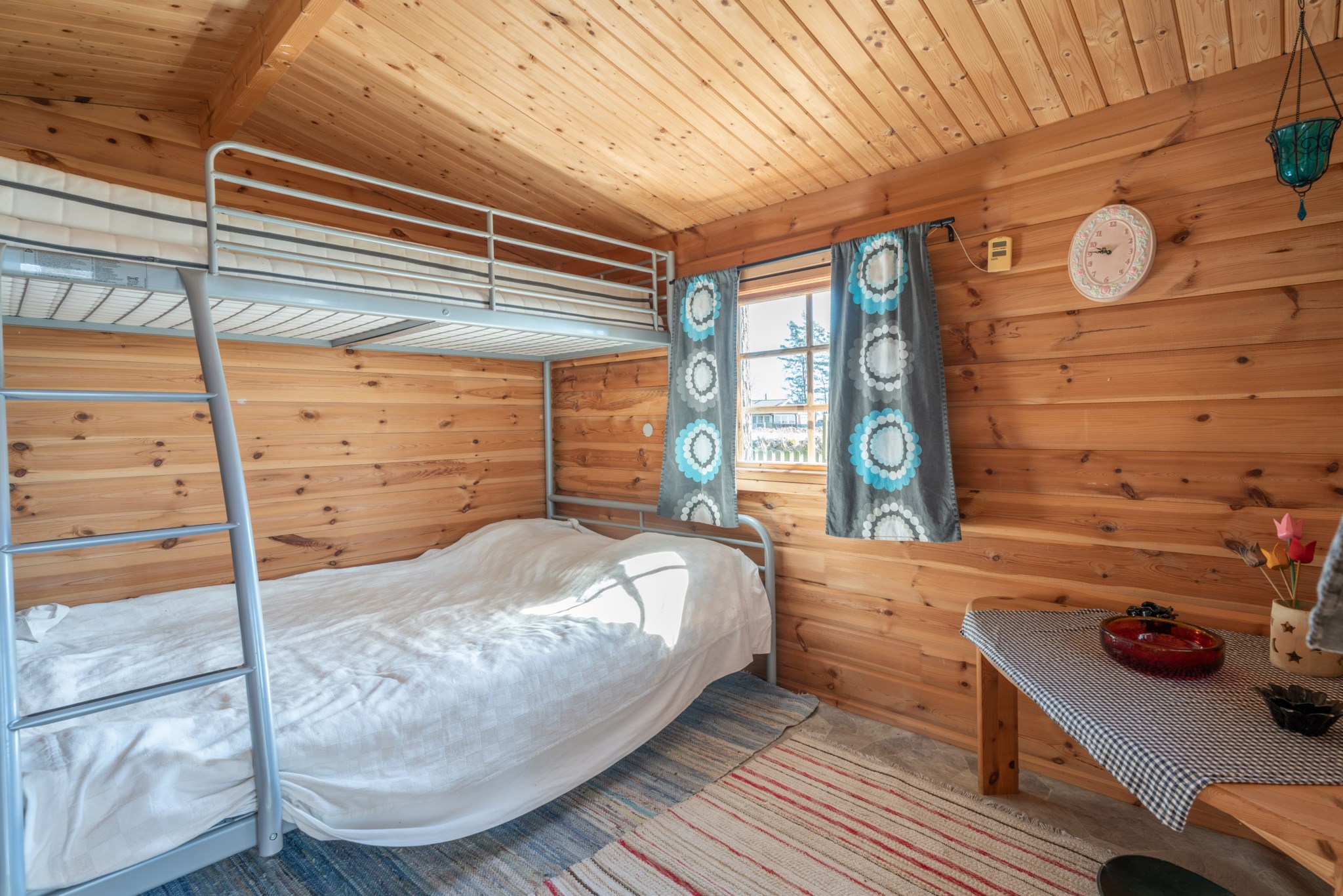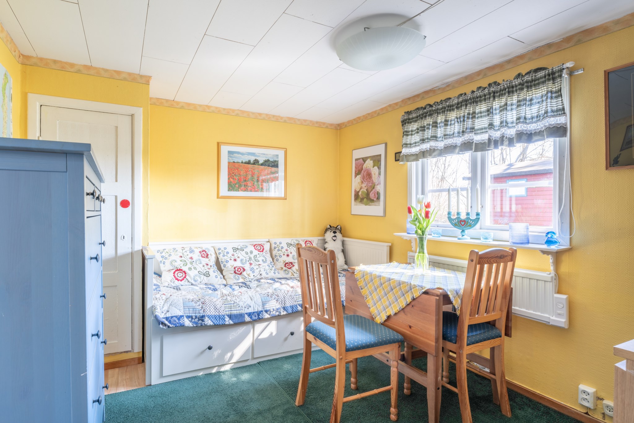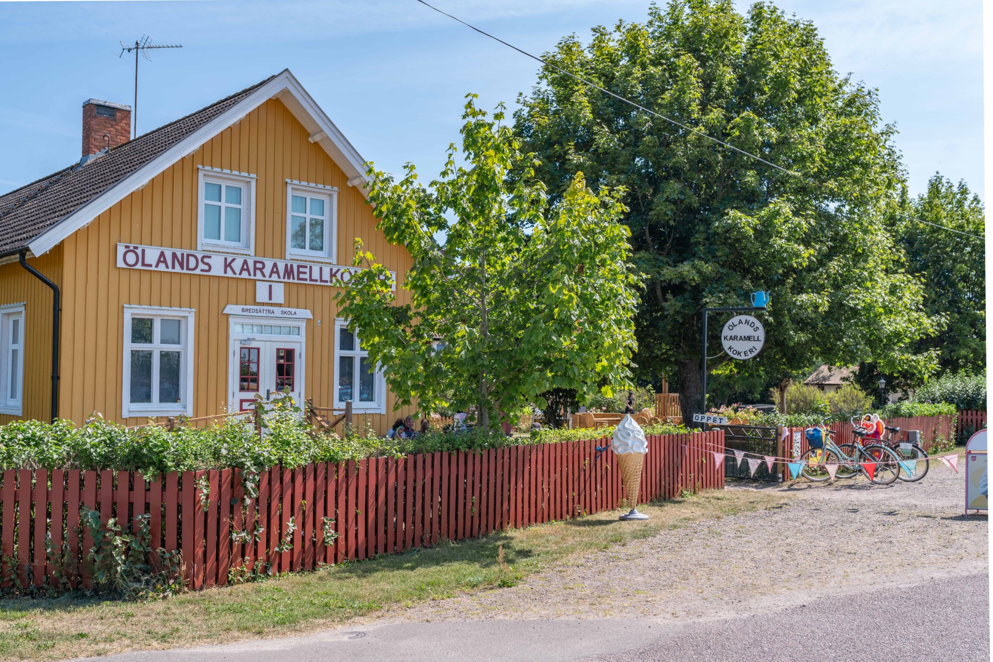 Bostadshuset, ett rött hus med vita knutar, har en trivsam och inbjudande känsla med altan under tak – en plats som säljarna särskilt uppskattat för långa, avkopplande stunder oavsett väder. Här finns även ett separat gästhus med egen liten uteplats, vilket ger extra utrymme för familj och vänner.