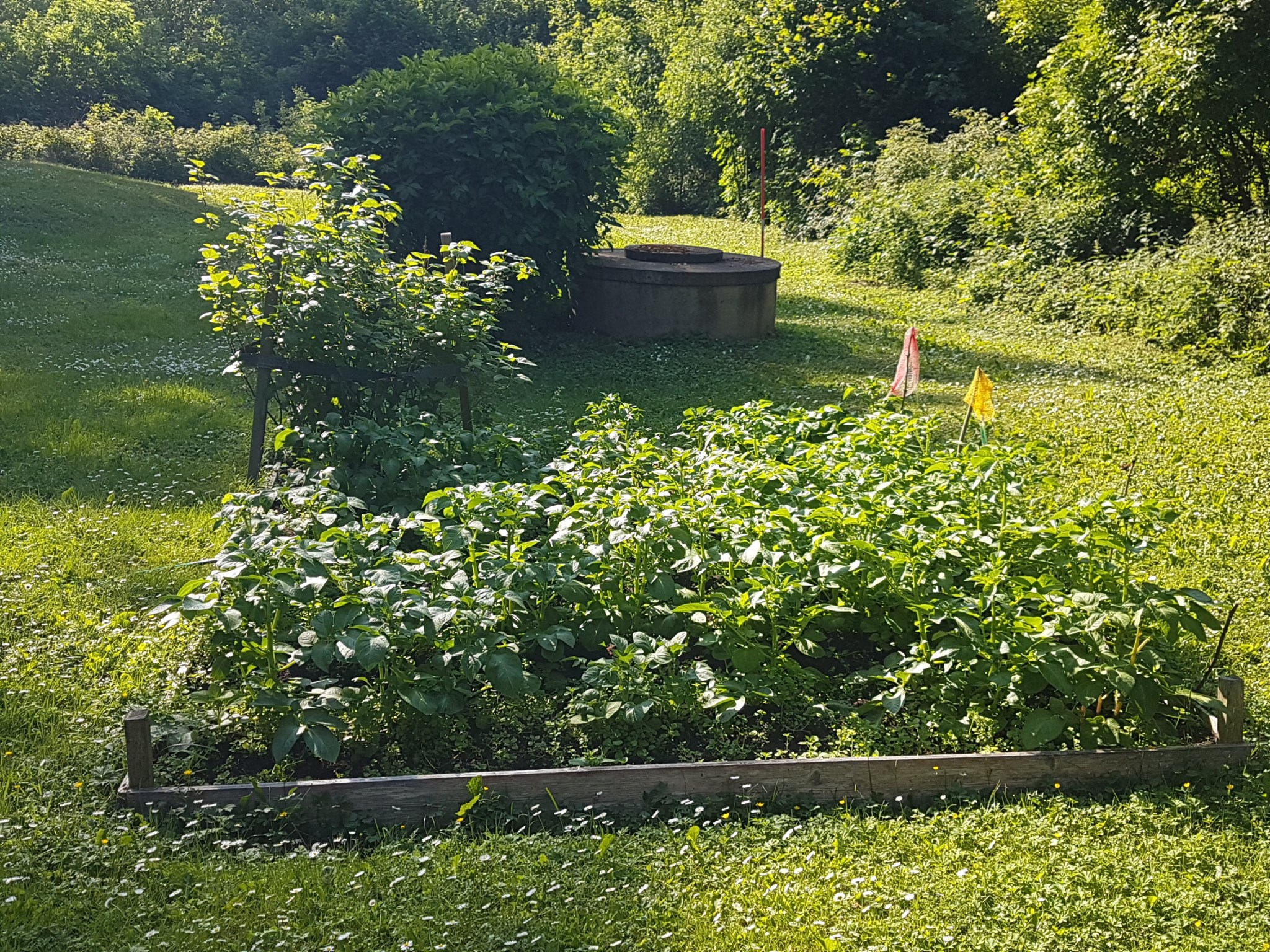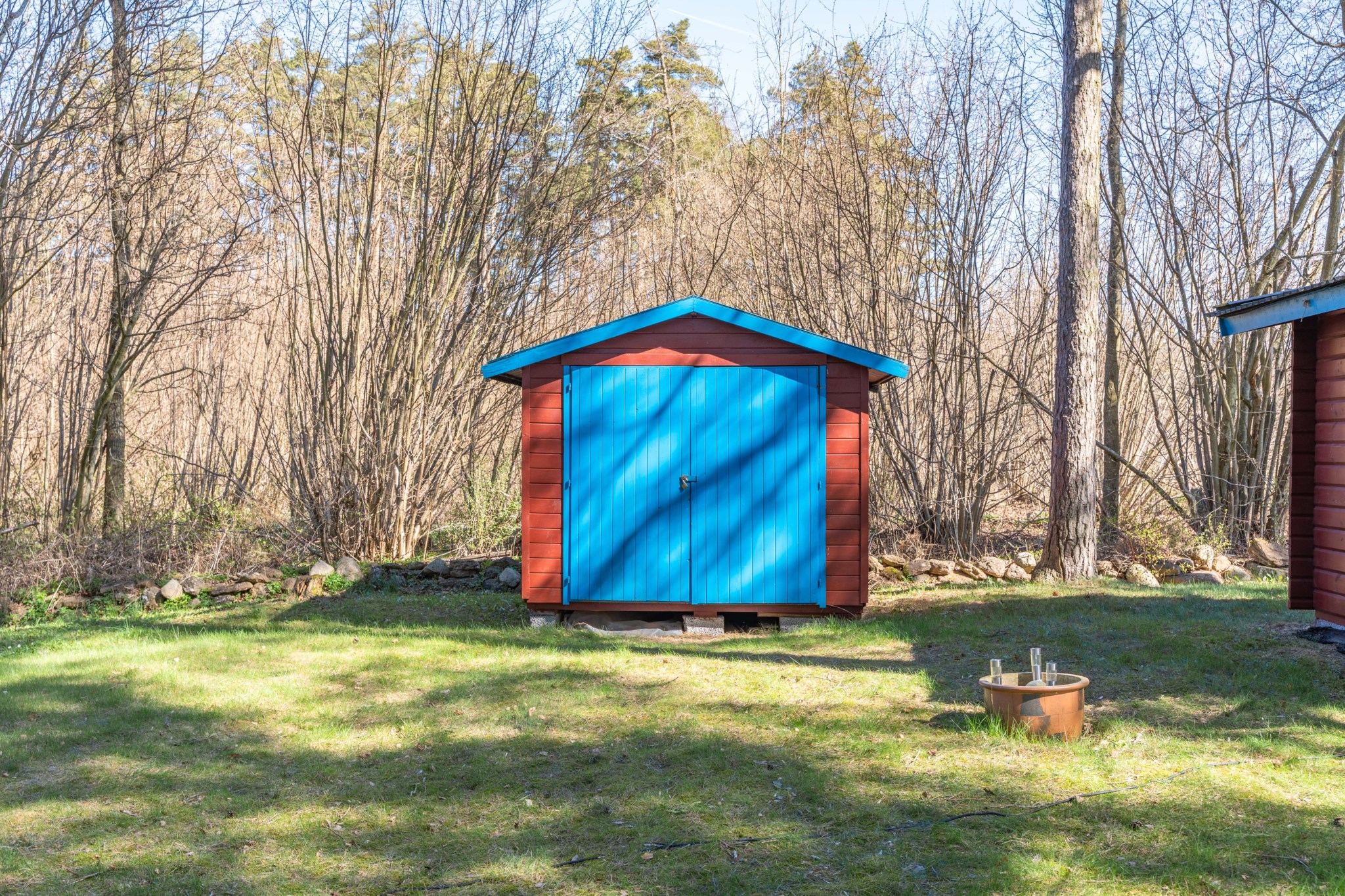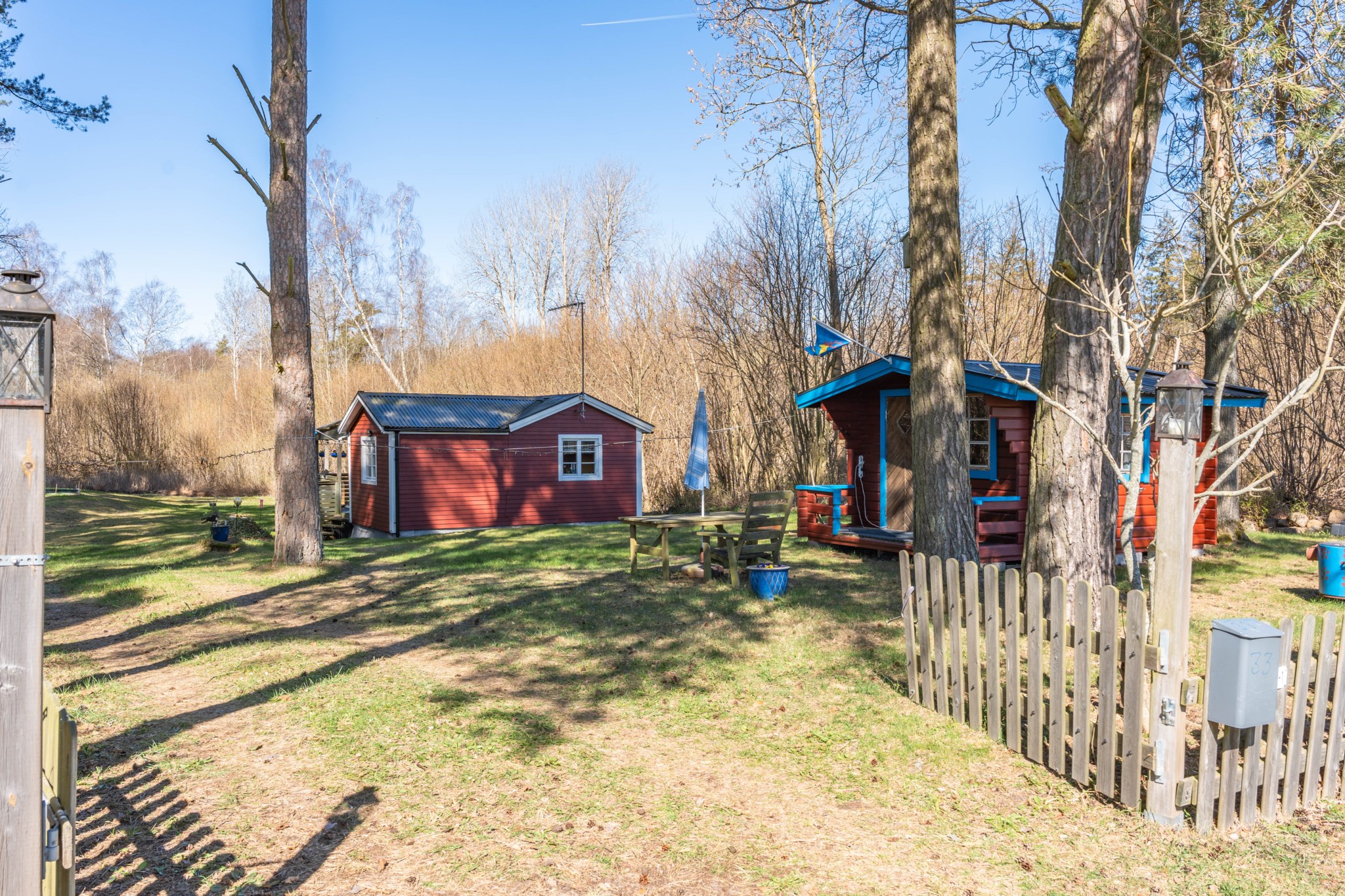 Runt bostadshuset öppnar tomten upp sig i en mer trädgårdslik del med hallonbuskar, vinbär, fläder och odlingsmöjligheter. En låg stenmur och staket ramar in och förstärker känslan av en egen liten oas – en plats där tempot sänks och lugnet får ta plats.