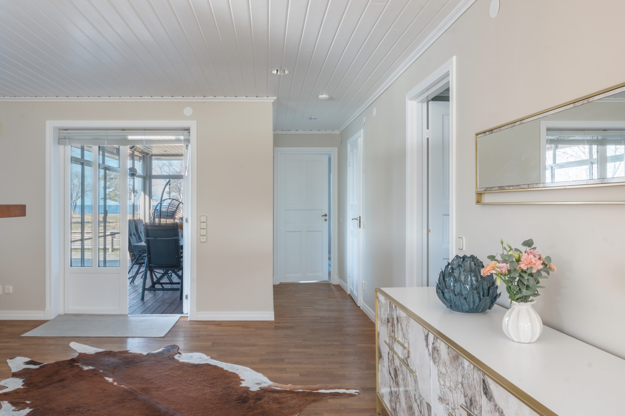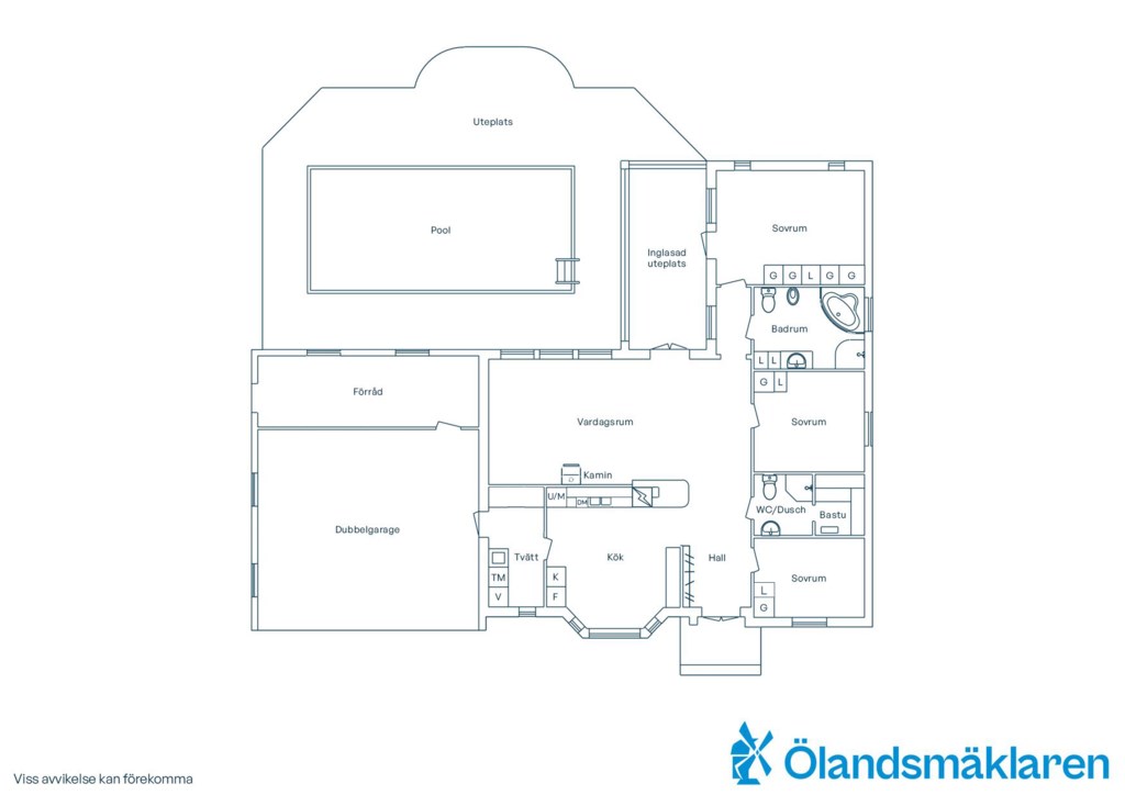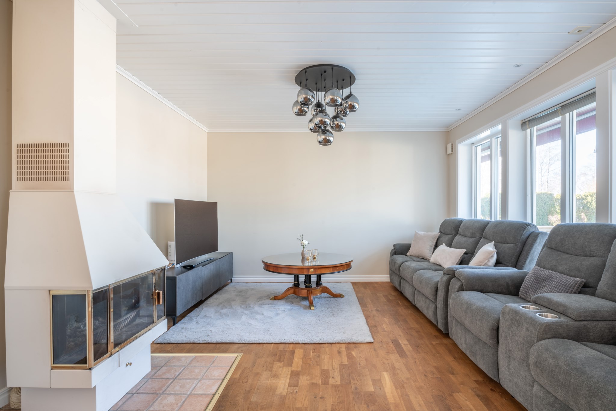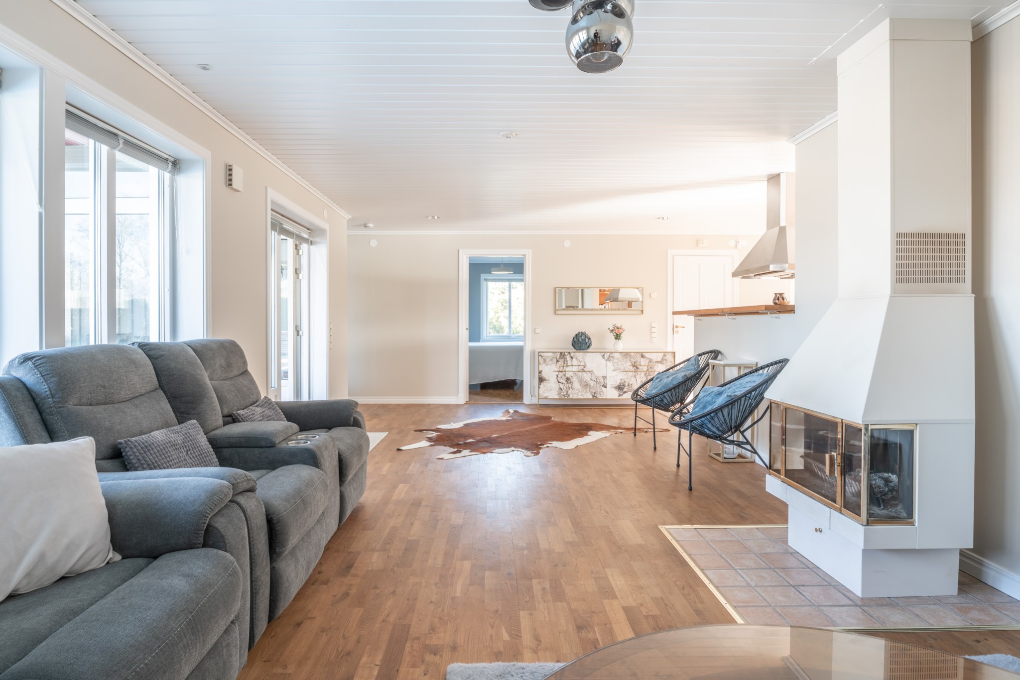 Bostaden erbjuder en genomtänkt och trivsam planlösning i ett plan, där de sociala ytorna står i centrum. Vardagsrum och kök samspelar i en öppen och inbjudande miljö, med braskamin som ger både värme och atmosfär. De stora fönsterpartierna och uterummet suddar ut gränsen mellan inne och ute och förstärker känslan av ljus och rymd.