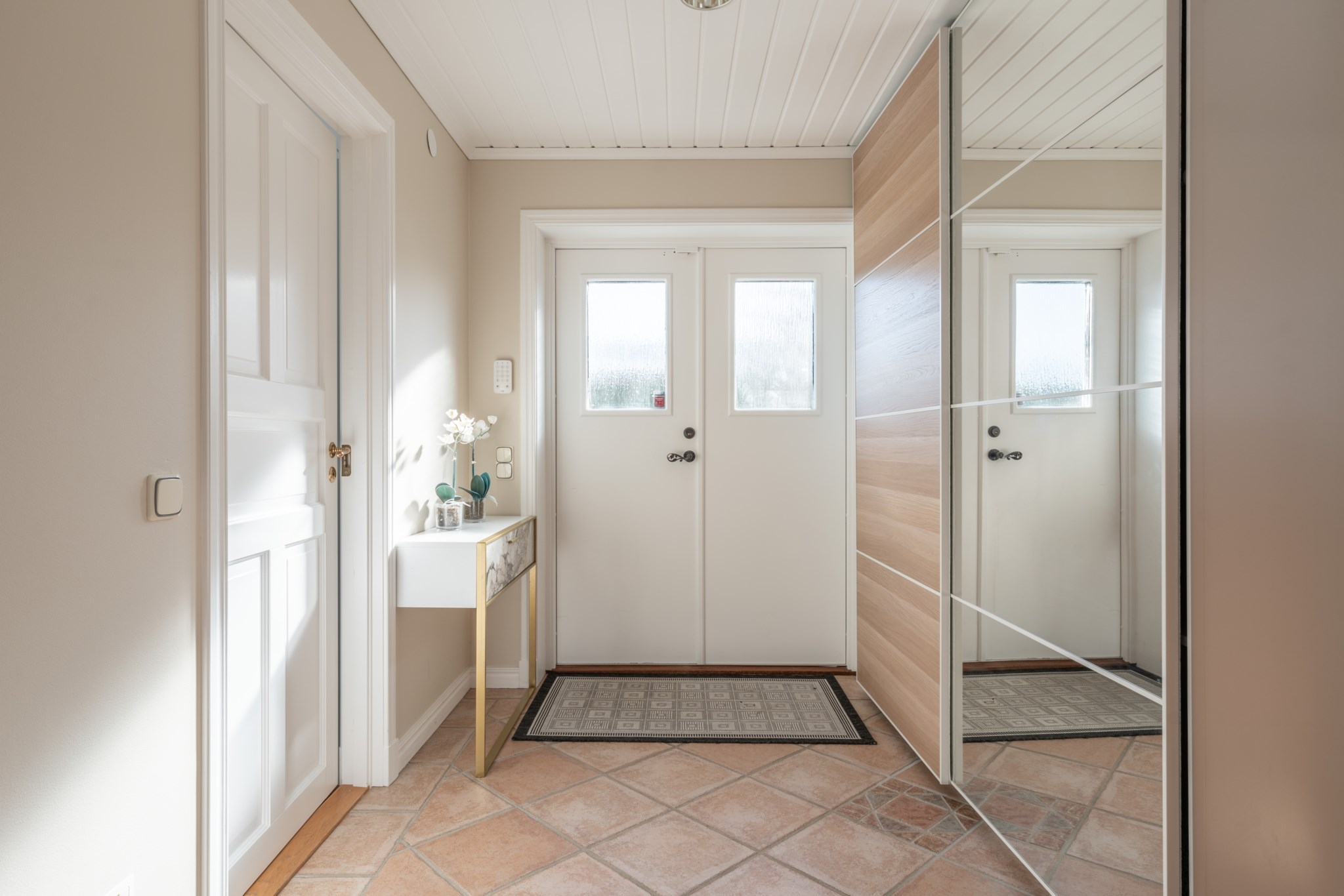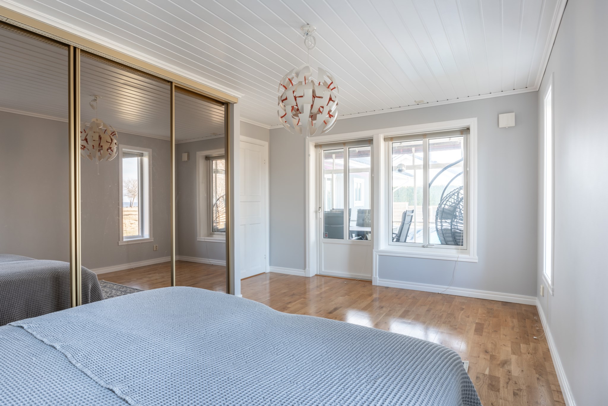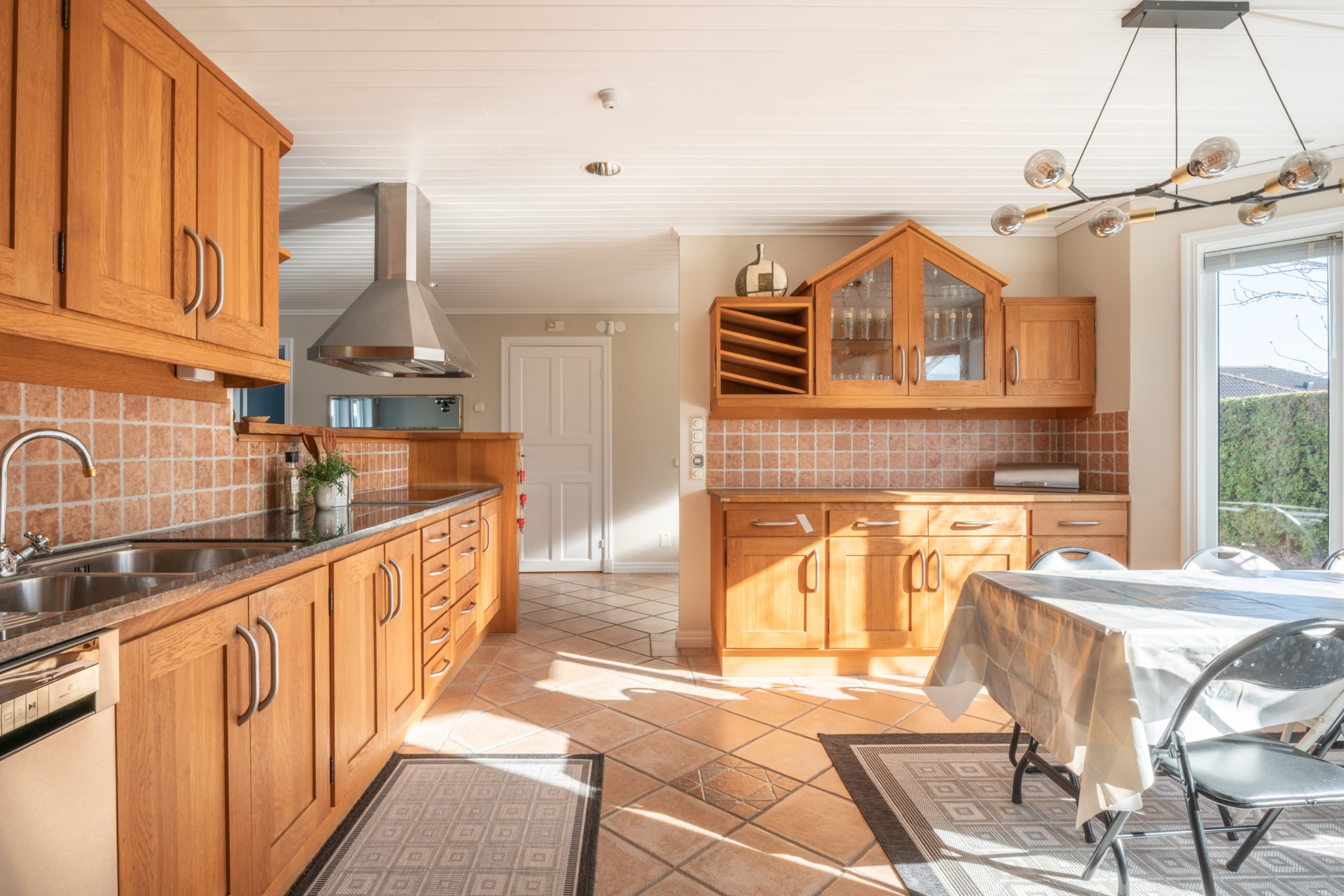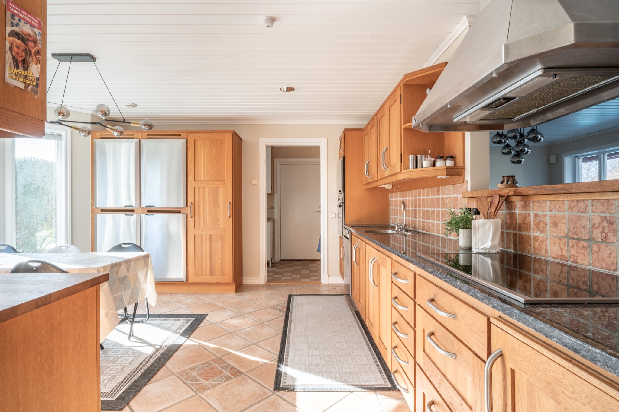 Bostaden erbjuder en genomtänkt och trivsam planlösning i ett plan, där de sociala ytorna står i centrum. Vardagsrum och kök samspelar i en öppen och inbjudande miljö, med braskamin som ger både värme och atmosfär. De stora fönsterpartierna och uterummet suddar ut gränsen mellan inne och ute och förstärker känslan av ljus och rymd.