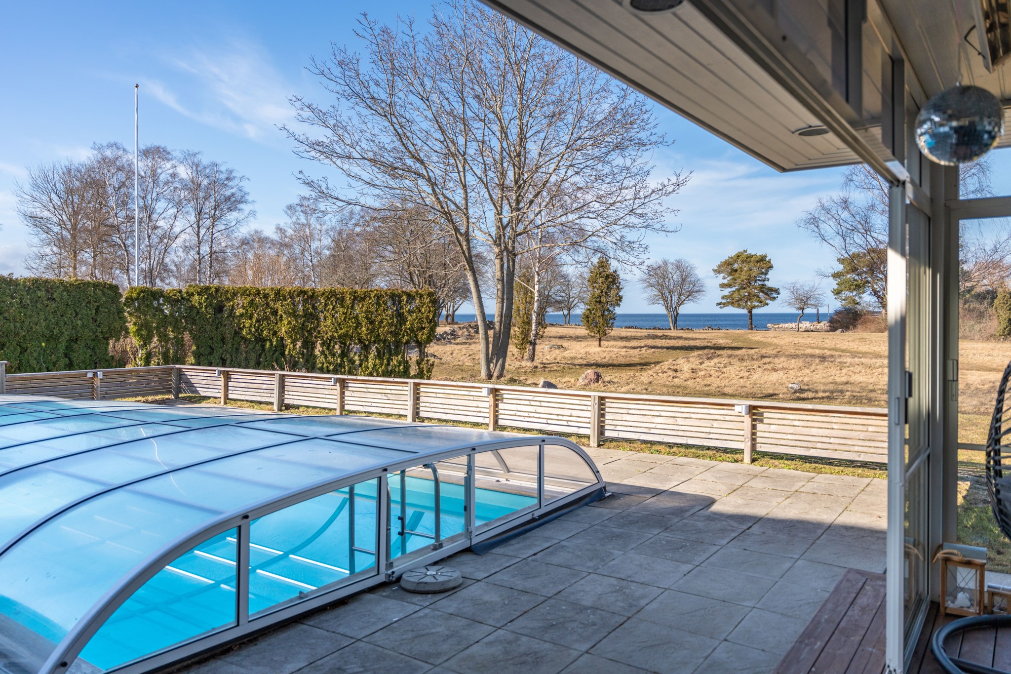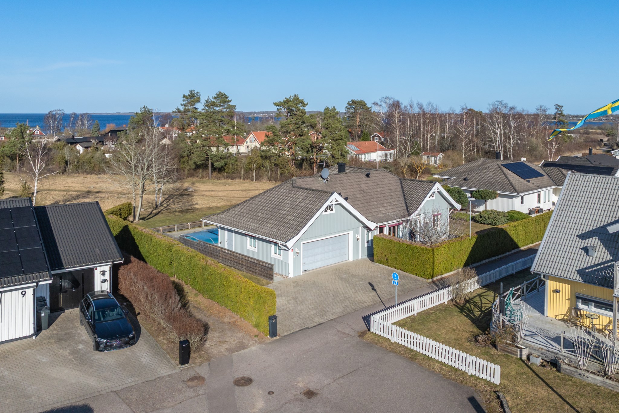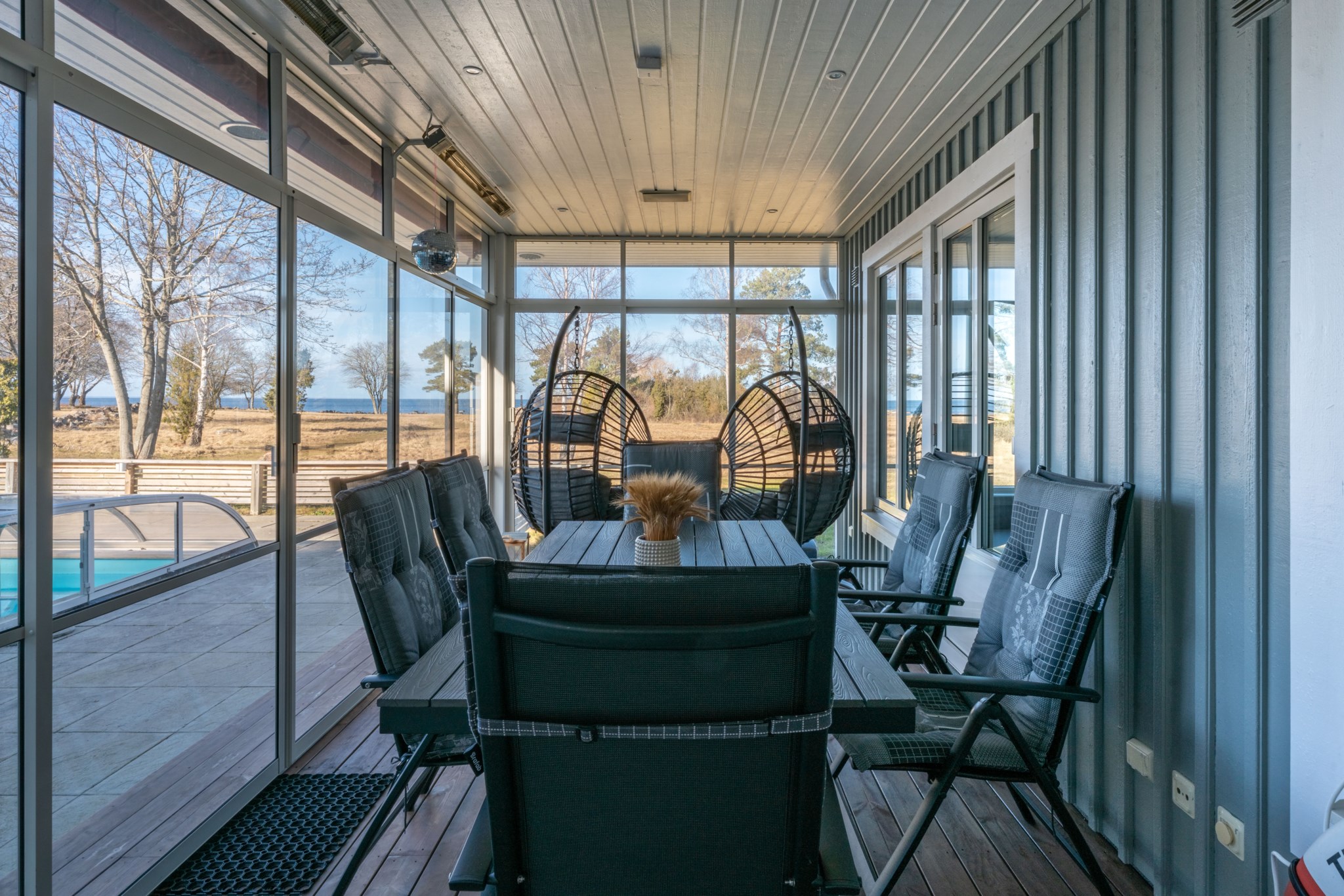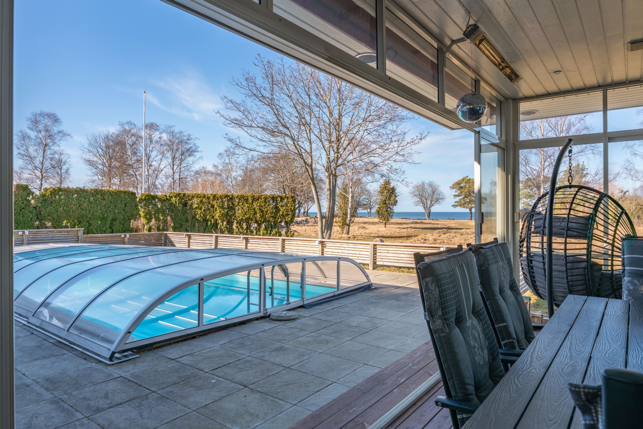 Den uppvärmda poolen om 4 x 8 meter ligger perfekt placerad tillsammans med den stenlagda uteplatsen och skapar en självklar samlingspunkt under årets varmare månader. Här njuter man av sol, bad och långa kvällar – med havet som ständig kuliss.