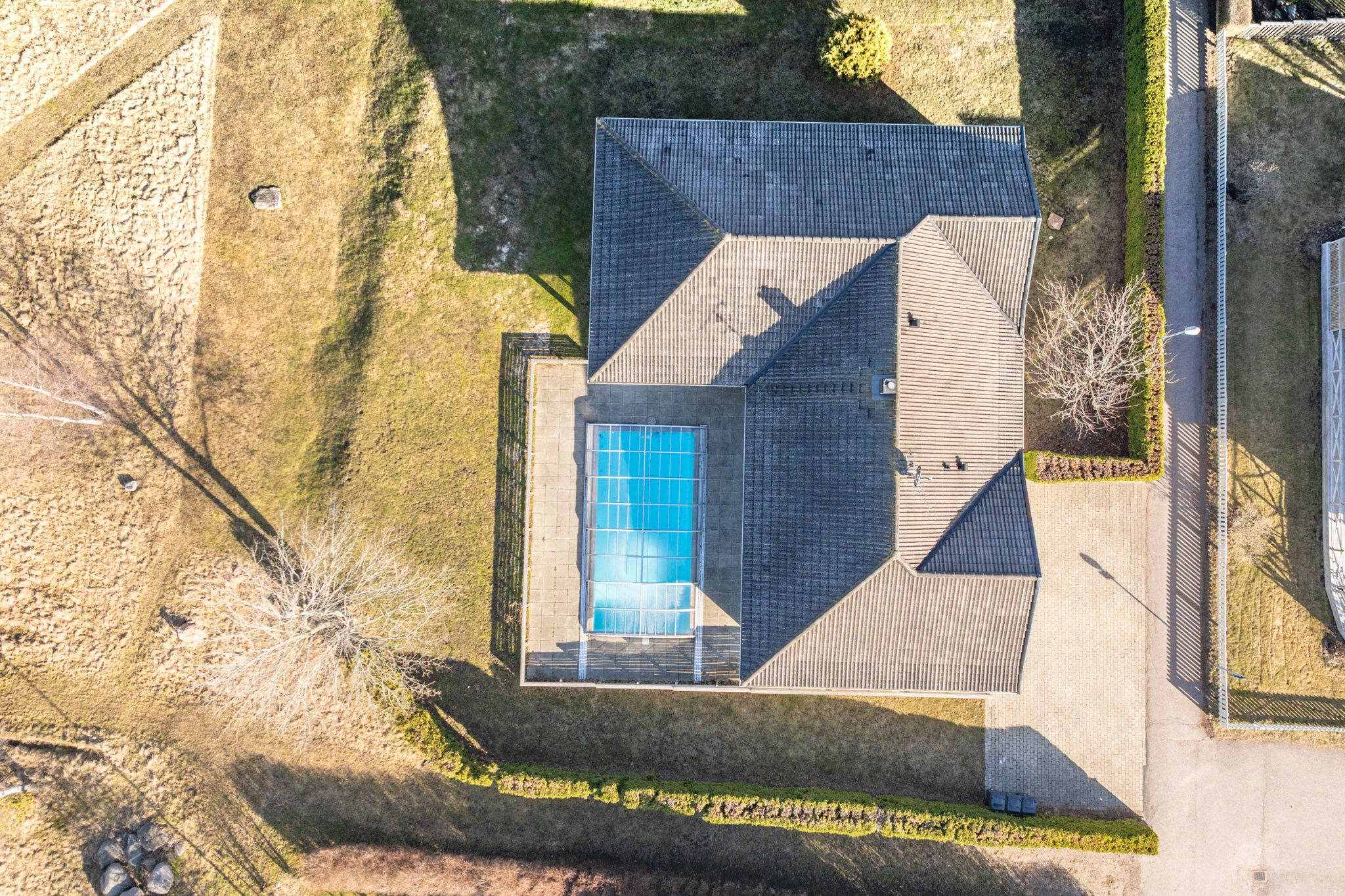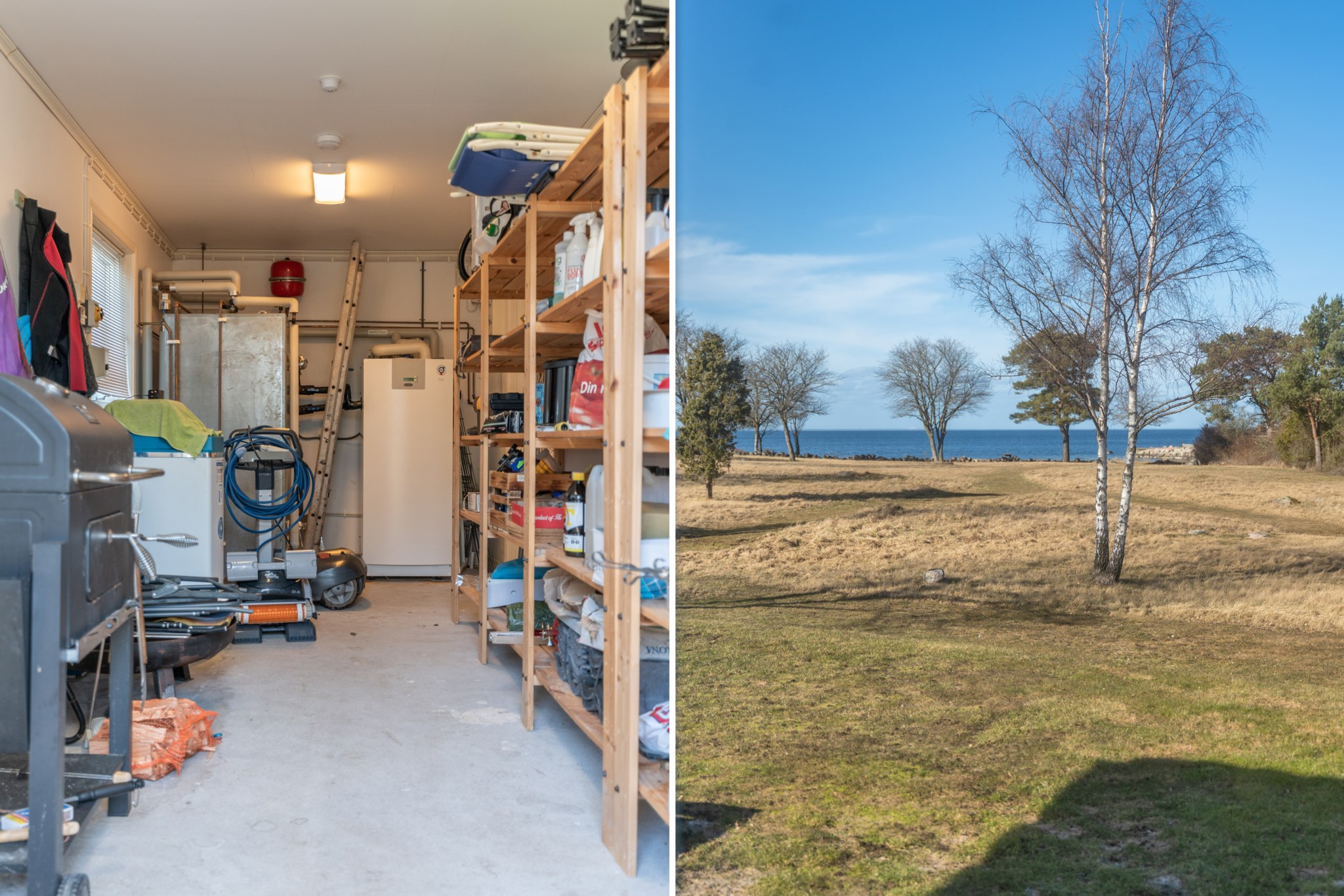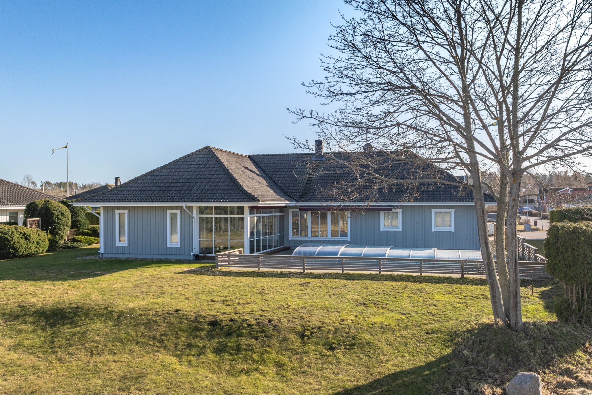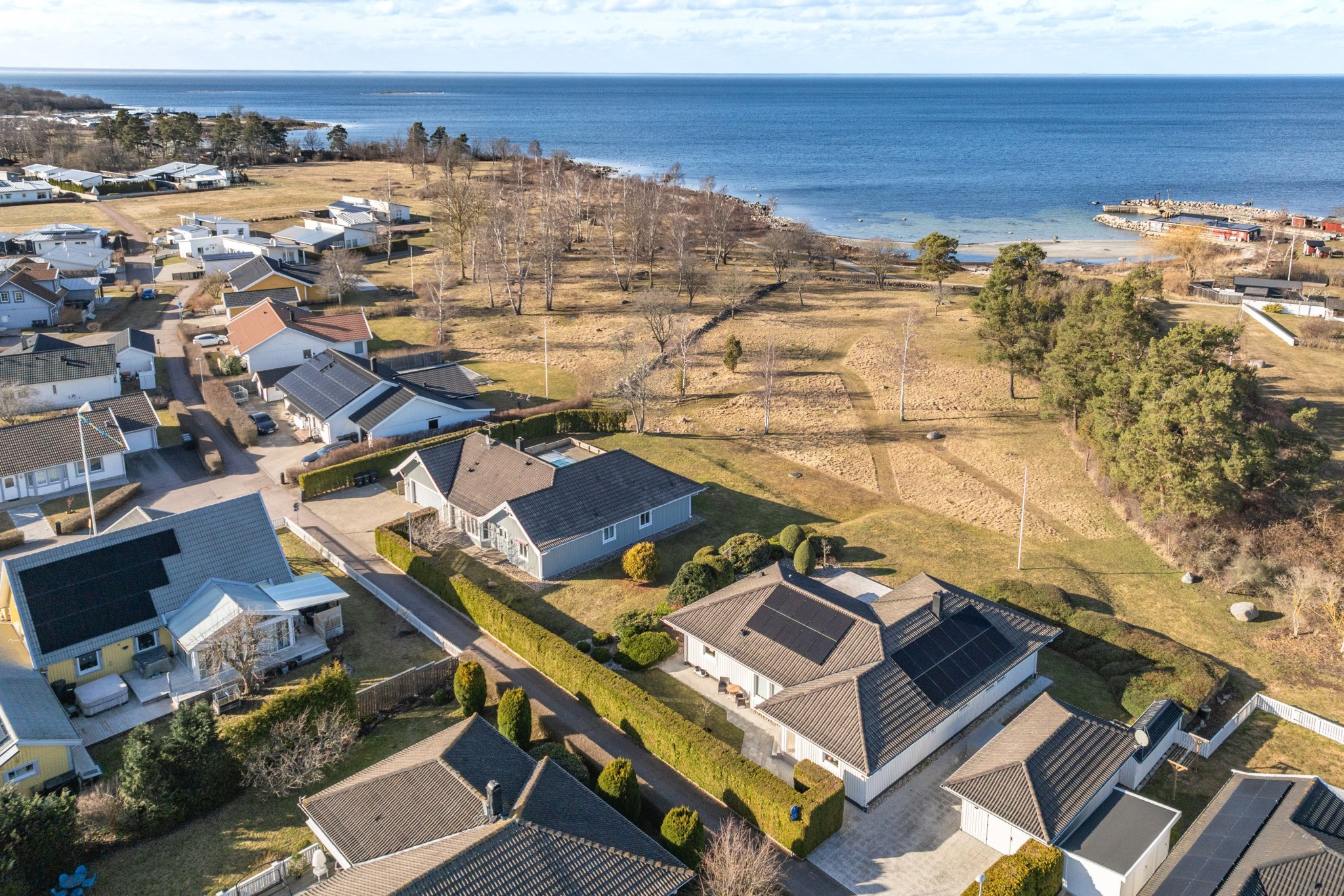 Den uppvärmda poolen om 4 x 8 meter ligger perfekt placerad tillsammans med den stenlagda uteplatsen och skapar en självklar samlingspunkt under årets varmare månader. Här njuter man av sol, bad och långa kvällar – med havet som ständig kuliss.