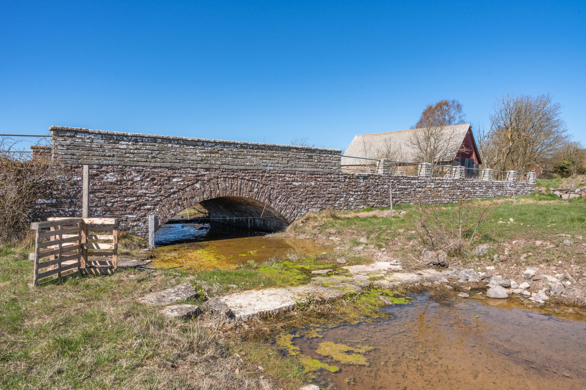 Strax utanför tomten porlar en bäck som rinner från alvaret ner mot havet, och tillsammans med fågelkvittret skapas en harmonisk och naturnära atmosfär.