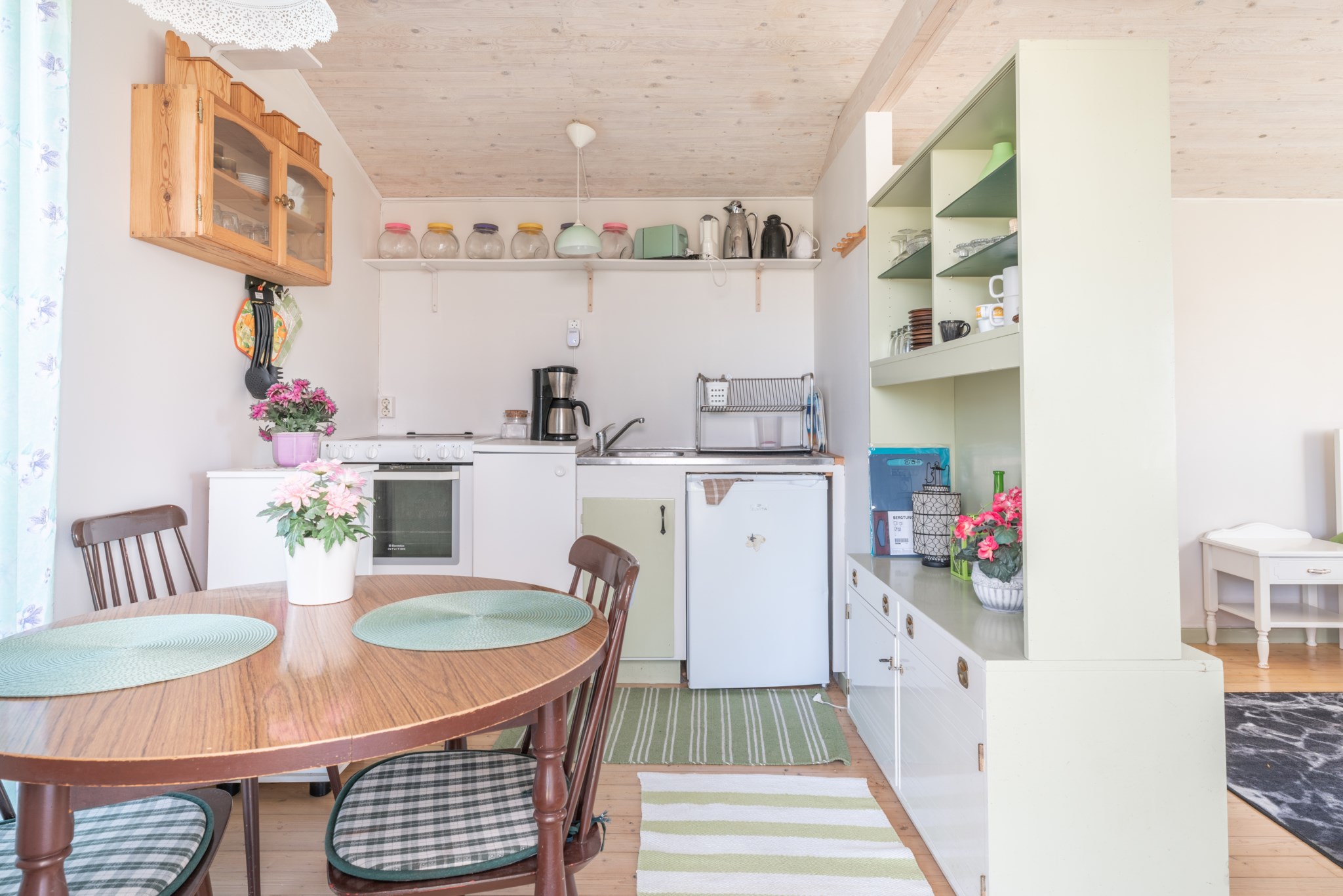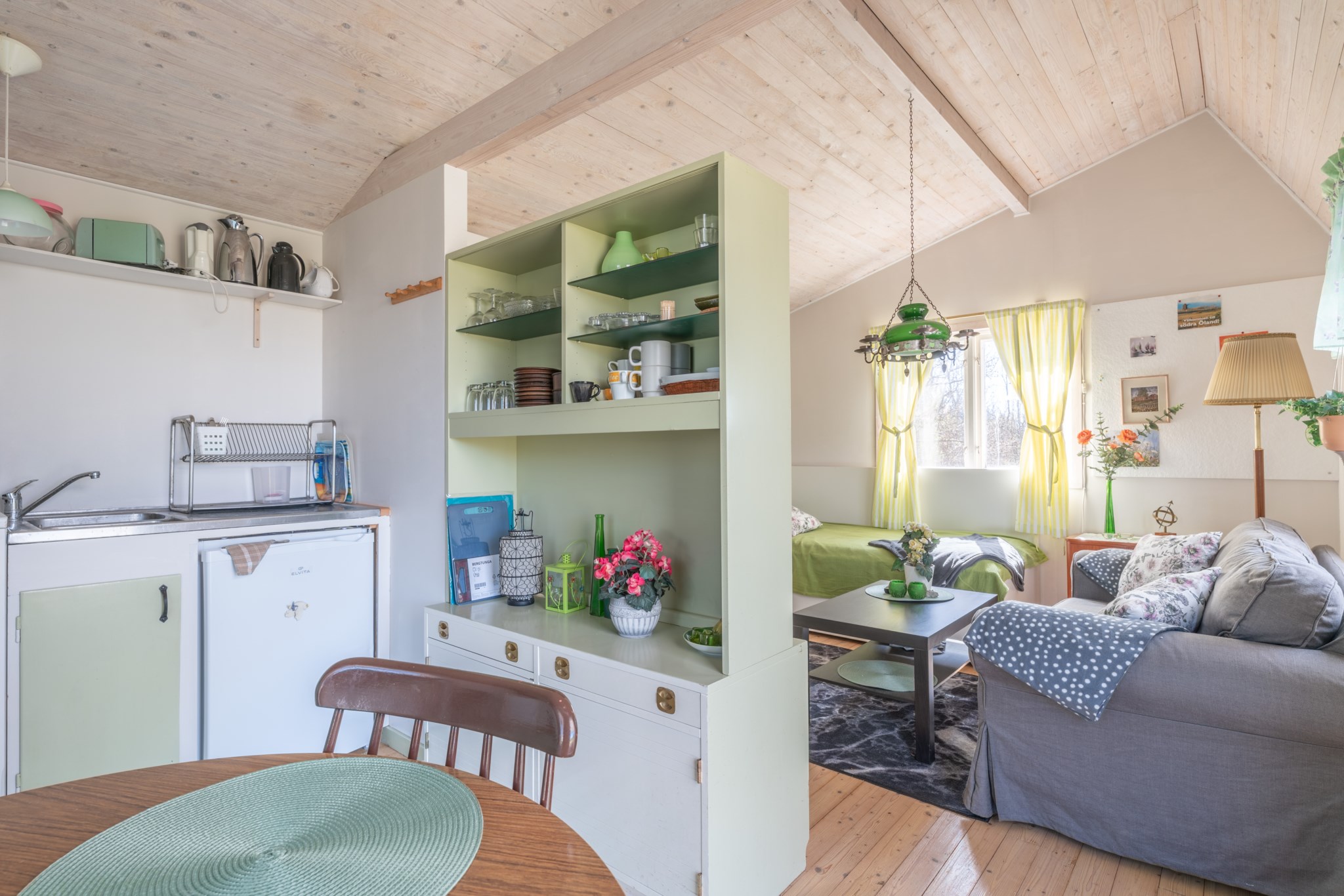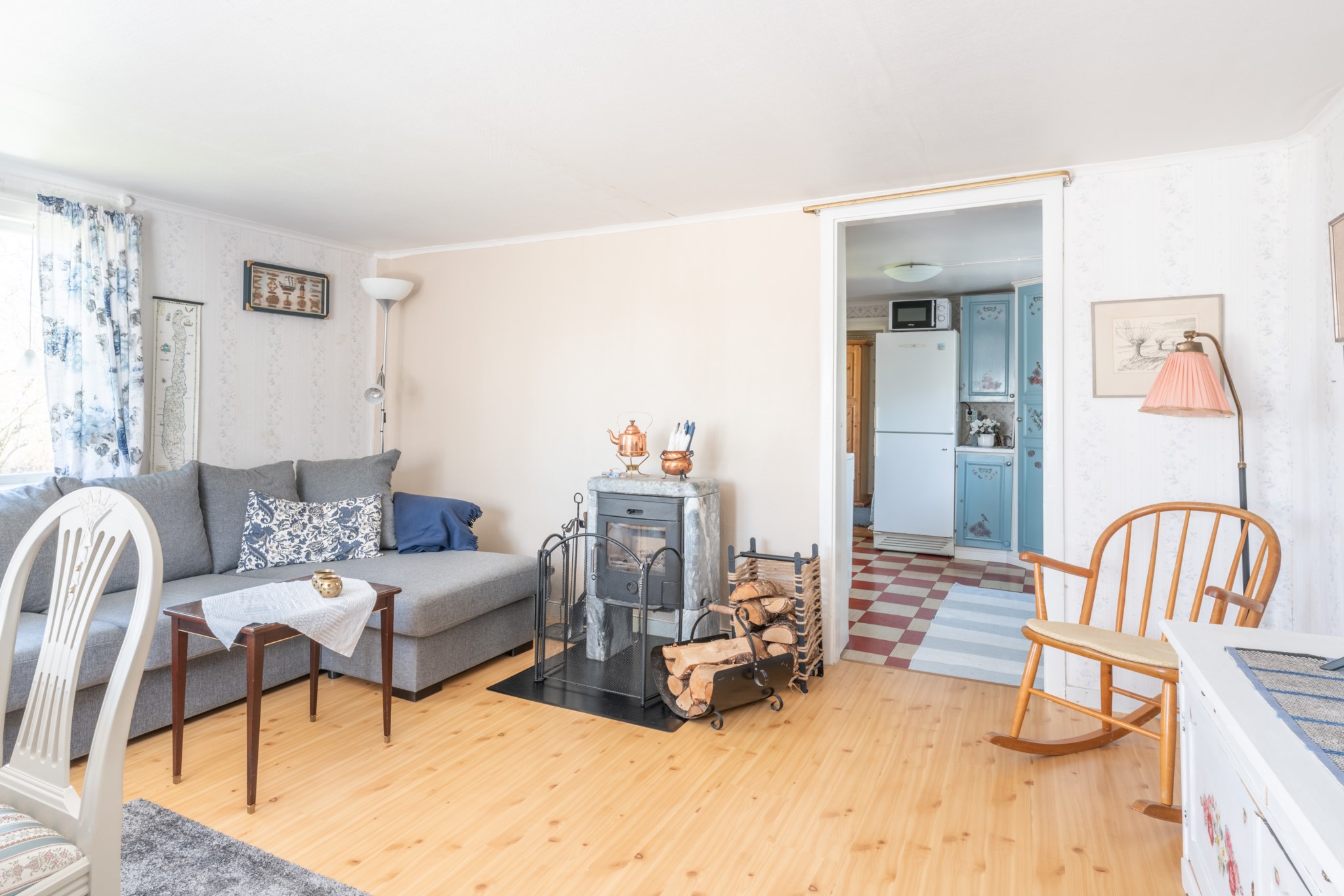 Bostaden erbjuder en varm och hemtrevlig känsla. Den välkomnande hallen leder vidare till ett praktiskt kök med lantlig charm, platsbyggt skafferi och köksinredning från 2021. Det rymliga allrummet bjuder in till både middagar och avkoppling framför den värmande braskaminen, som förhöjer trivseln året om. Sovrummet är rofyllt med plats för dubbelsäng, och intill hallen finns ett funktionellt badrum.