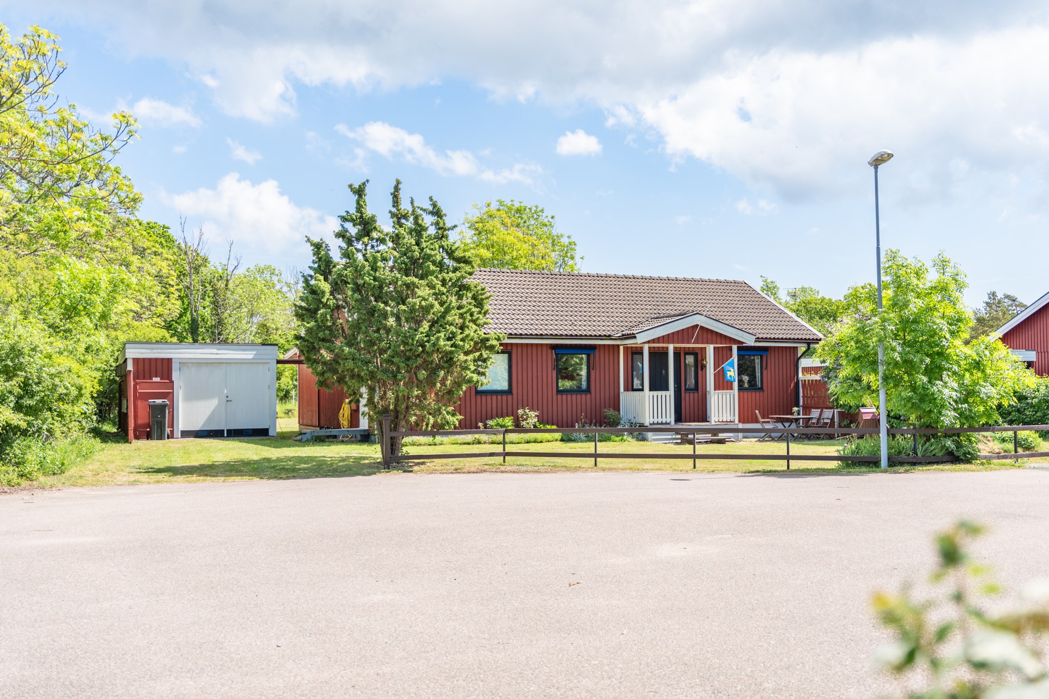 Bostadshuset är 95 kvadratmeter och inrymmer hall, kök med öppen planlösning mot vardagsrummet, tre sovrum, badrum, gästtoalett och en groventré som med fördel används även till gäststuga. På baksidan finns härlig altan och ett insynsskyddat och läge. Utöver bostadshuset finns även ett garage med vidbyggt gästrum.