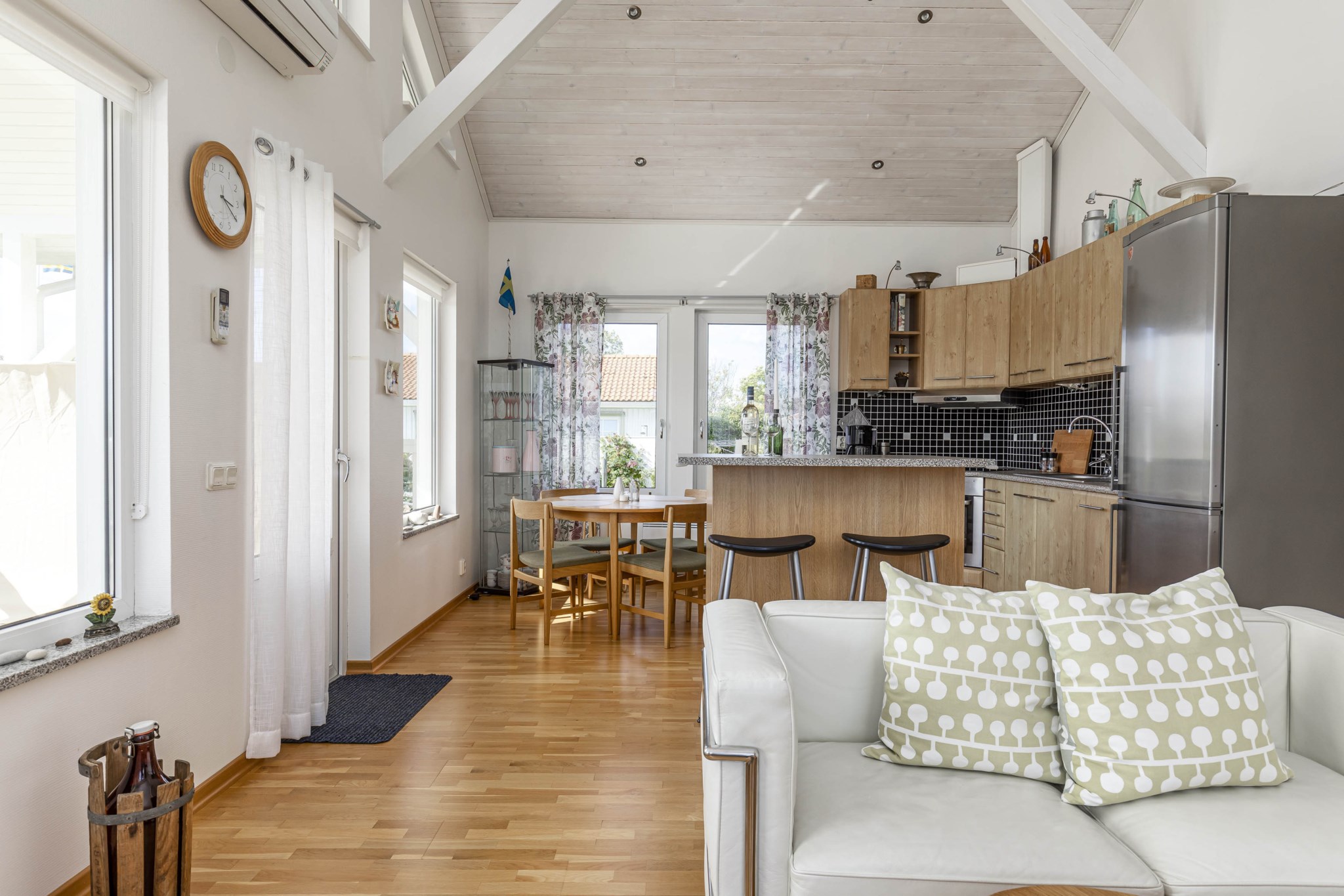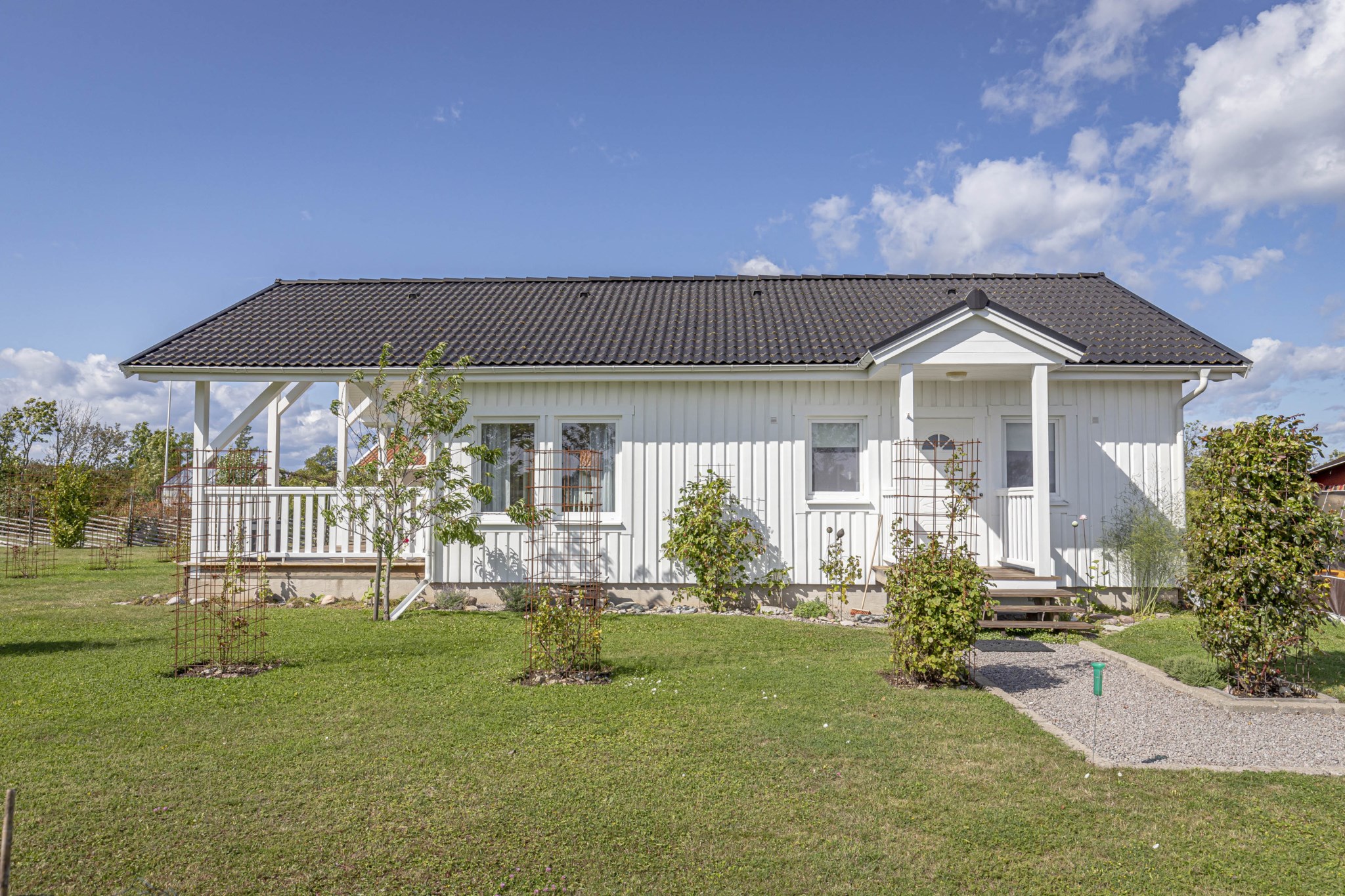 Huset är disponerat med en härlig storstuga med öppet upp i nock och modern köksinredning, utgång till en stor takskyddad altan med soligt sydvästläge. 3 sovrum, klädkammare, hall och helkaklat toalett/duschrum.