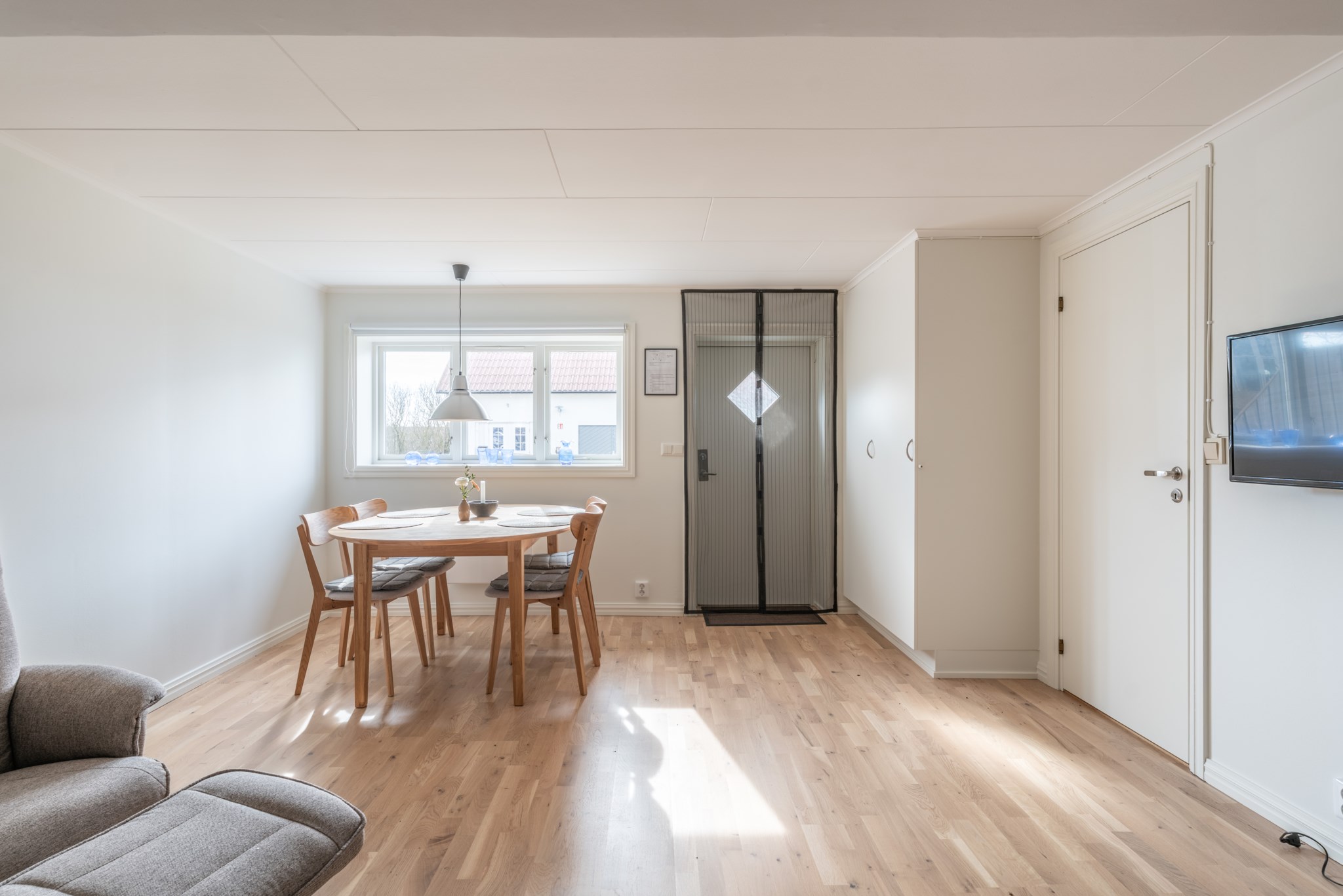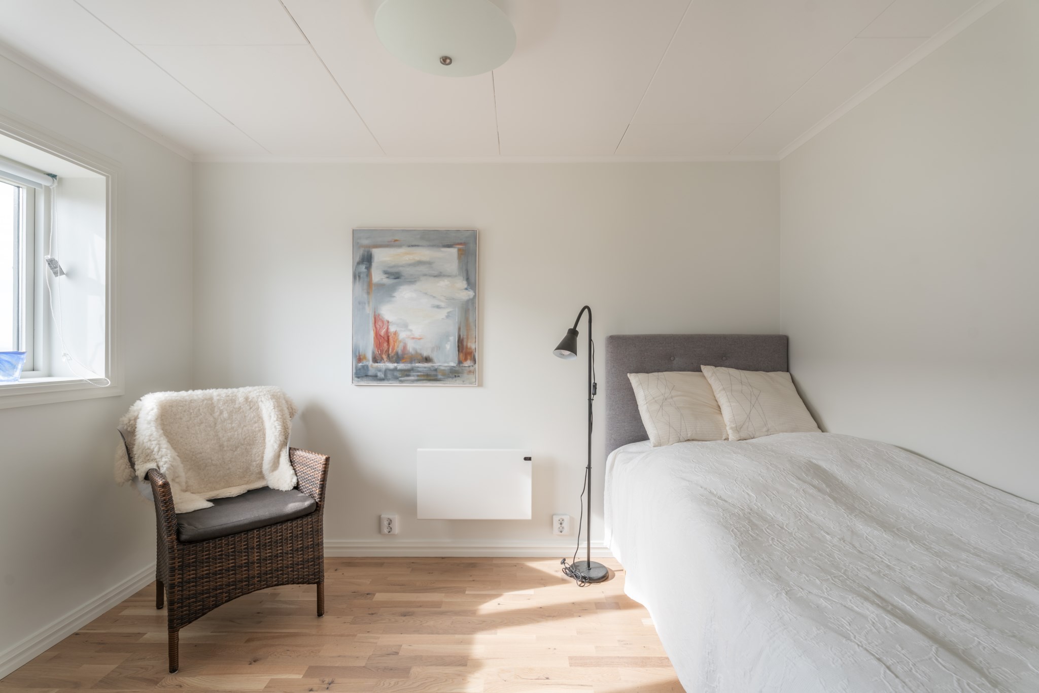 Det praktiska sovrummet bjuder på rogivande utsikt som ger en känsla av lugn från morgon till kväll. Bostadens verkliga pärla är den generösa uteplatsen i soligt söderläge, där du kan njuta av vidsträckt utsikt över den västra kusten. Här skapas en naturlig plats för långa, avkopplande stunder i solen och magiska kvällar med solnedgången som kuliss.