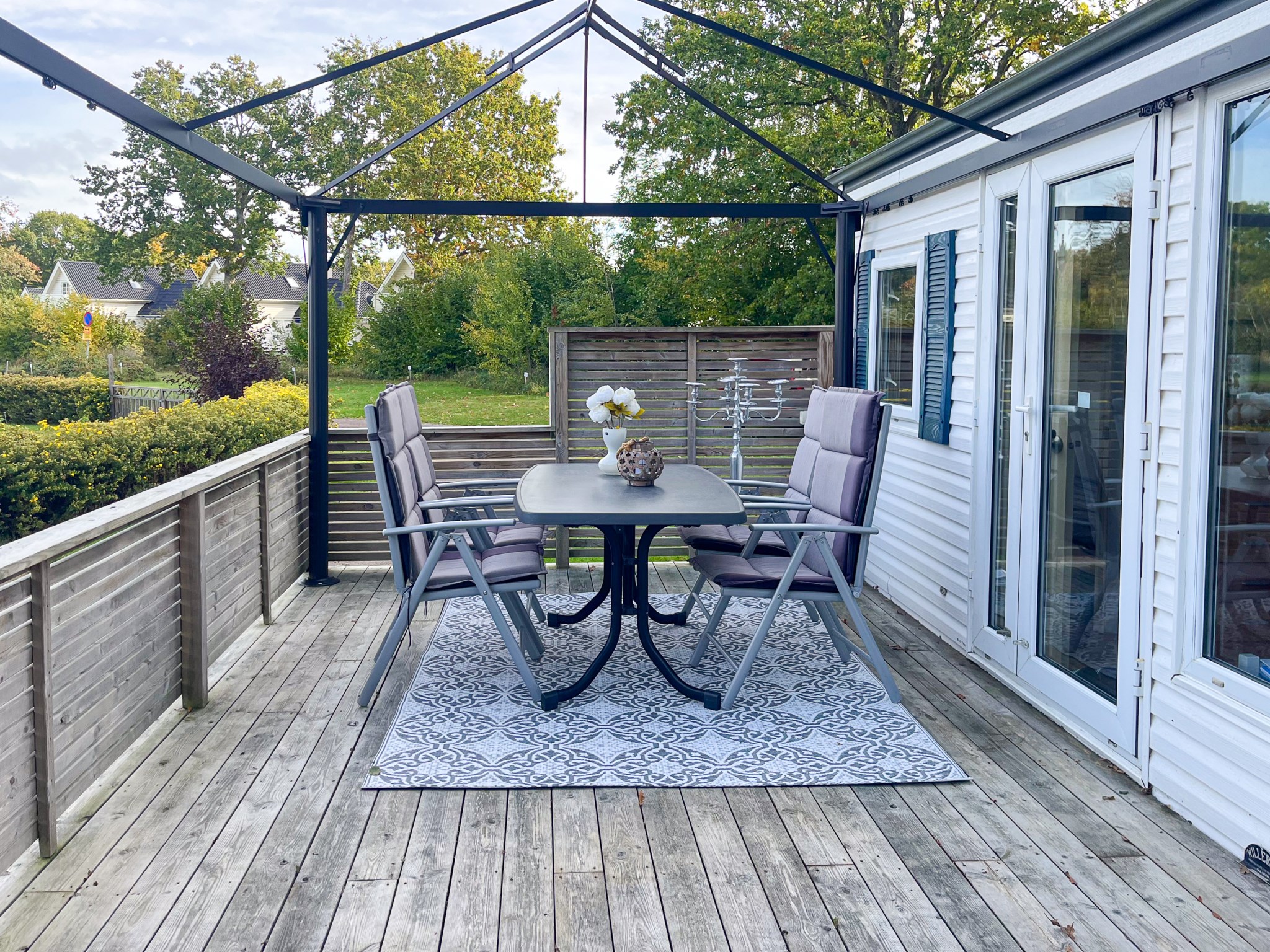 Den väl tilltagna träaltanen bjuder på gott om utrymme för både matgrupp och loungedel, och den fina paviljongen ger skön skugga och extra komfort under varma dagar. Här kan du njuta av stilla morgonkaffe eller långa kvällar i solnedgången i sällskap av en vacker utsikt.
