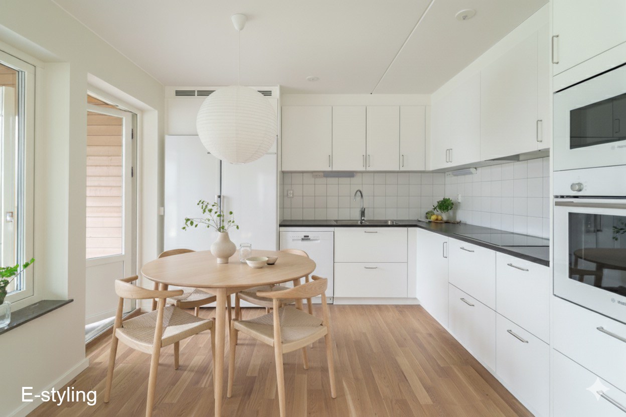 Köket har en öppen planlösning mot vardagsrum, orangeri och uteplats. Här har man valt att installera ett modernt och stilrent vitt kök från Ballingslöv (lucka Solid), svarta köksbänkar och med vitvaror från Bosch.