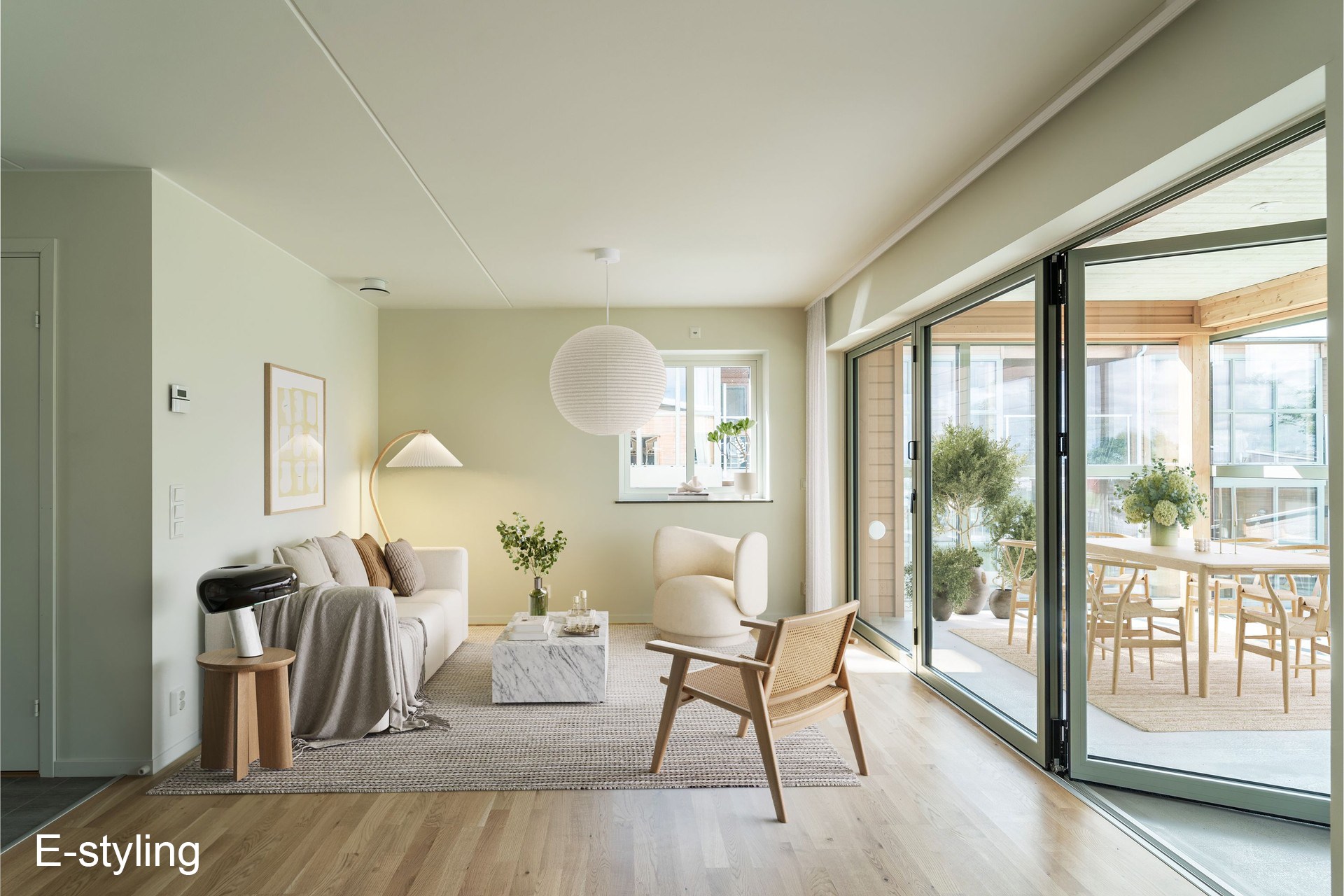 Stort och rymligt vardagsrum med öppna sällskapsytor. Här kan du möblera med stor soffa samt matbord. Du har skjutdörrar ut till ditt egna vinterbonade orangeri, vilket kopplar ihop en känsla mellan inne och ute, och med fördel att kunna göra ditt vardagsrum större. Härligt ljust och med ett bra ljusflöde genom rummet med utgång till altan/balkong.