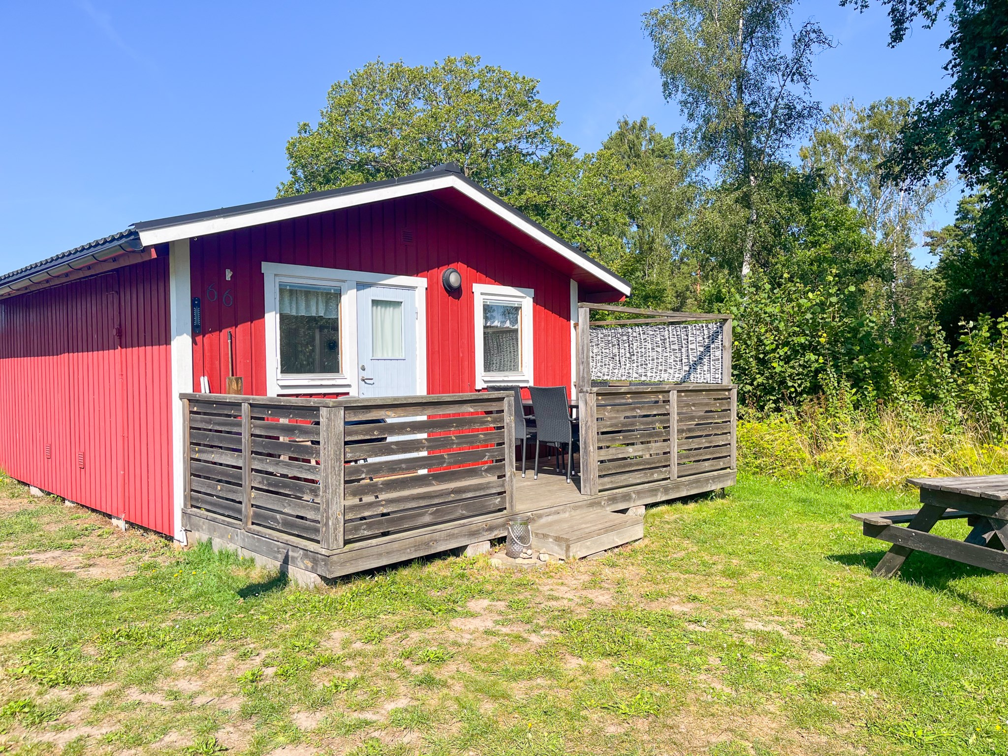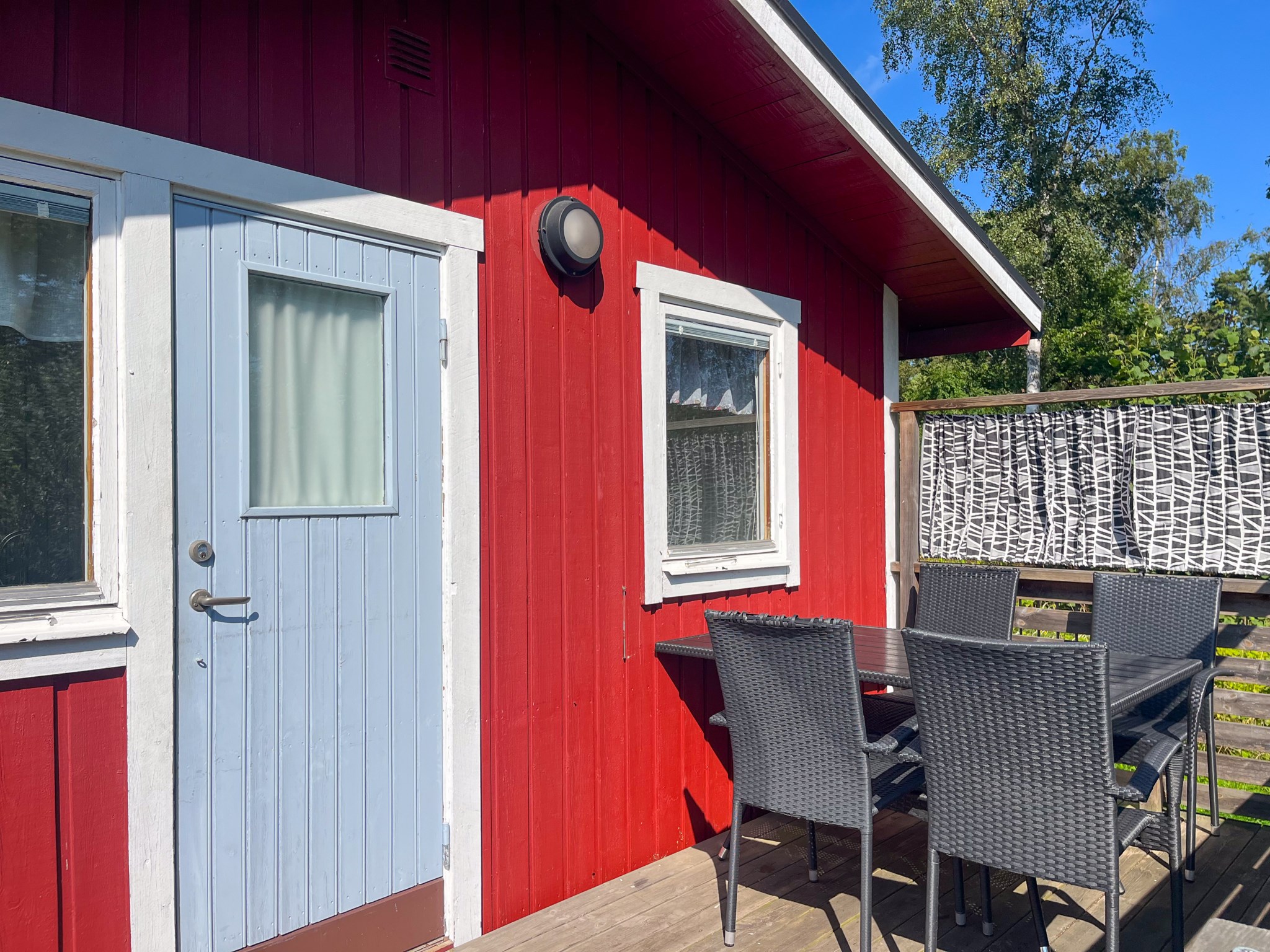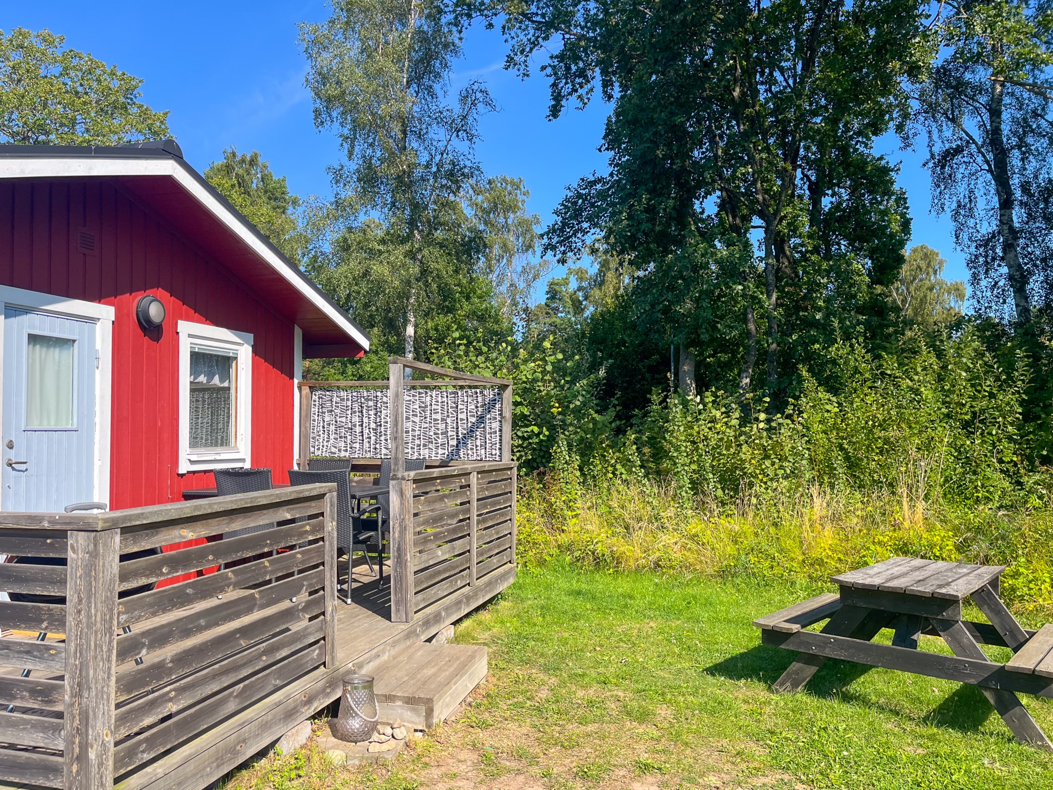 Utanför väntar en fin altan med morgon- och förmiddagssol – perfekt för en kopp kaffe i solen eller en stund med boken i friska havsbrisen. WC och dusch finns i det närliggande servicehuset.